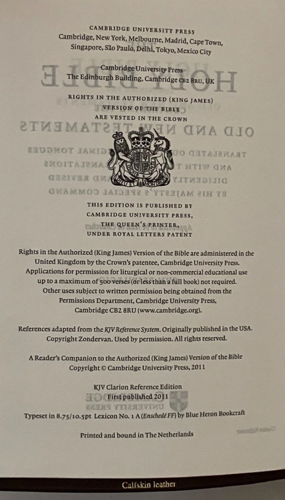 This is an entirely new setting of the Bible, published to coincide with the 400th anniversary of the King James Version but intended to become a staple of the Cambridge list for many years to come as a new and distinctive format. This particular edition is the first new Cambridge KJV reference Bible for over half a century and has been carefully designed for the modern era to meet an increasing demand for a more accessible format and comfortable reading size. It is typeset in Lexicon No.1, a digital font designed for easy reading and with many similar characteristics to traditional hot-metal Bible typefaces, thus marrying the best of the old and the new. The print is black-letter throughout and the text is presented in paragraph (rather than traditional chapter and verse) style and in a single-column format. The notes and cross-references have been relocated to the outer margin, leaving the text relatively free and unencumbered. The Bible includes 15 colour maps and – instead of a conventional concordance and dictionary – a Reader's Companion which offers the key elements of those features in one place. It is printed on India paper with art-gilt edges and is bound with two ribbons in brown top grain calfskin leather.