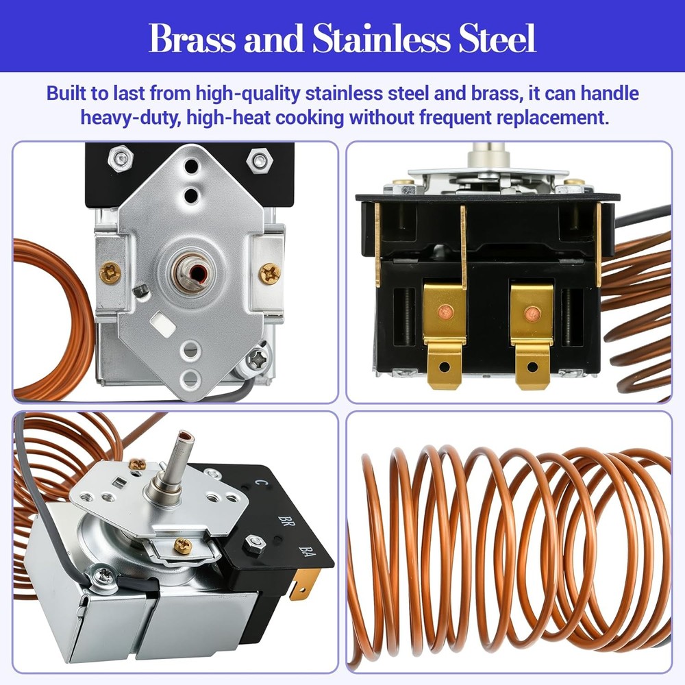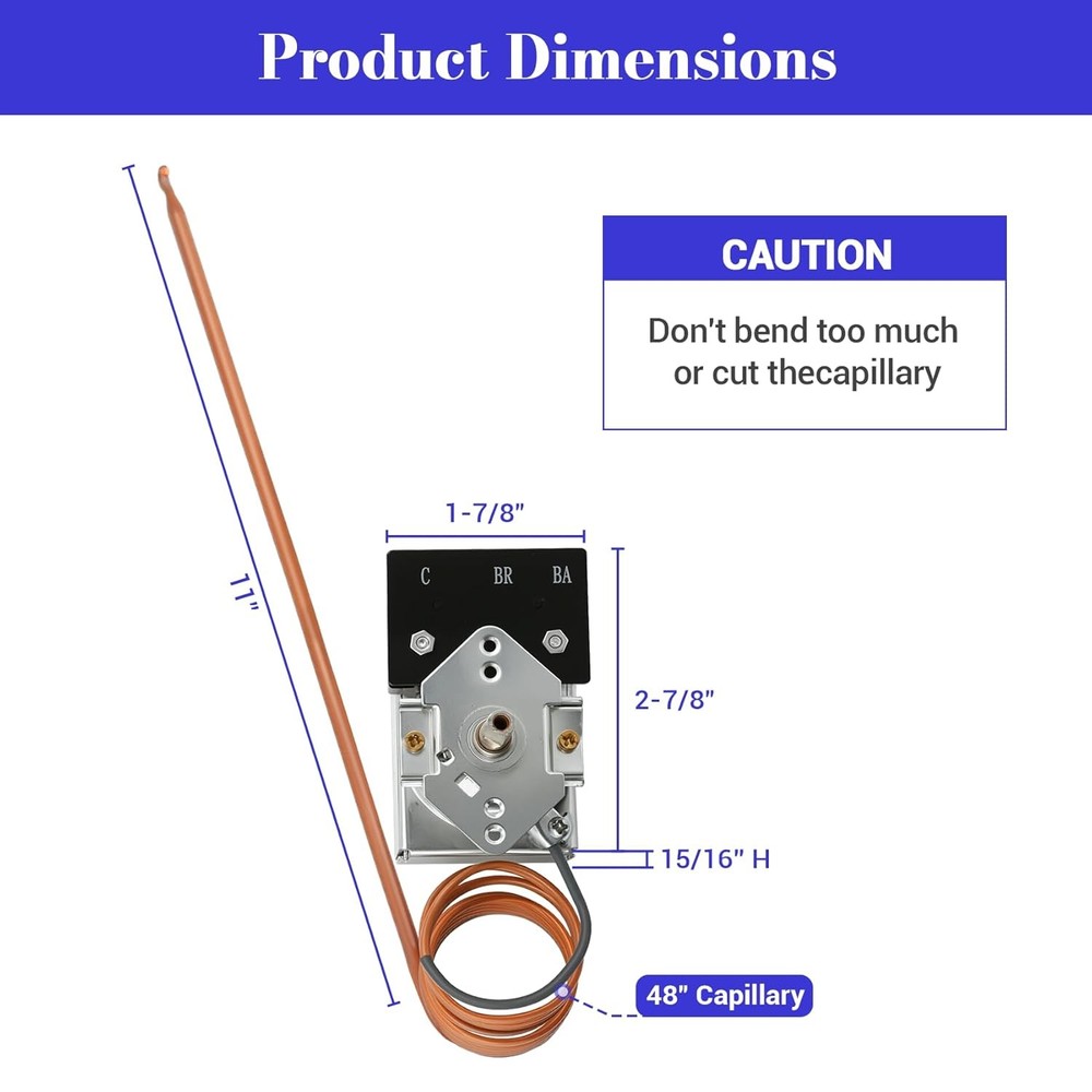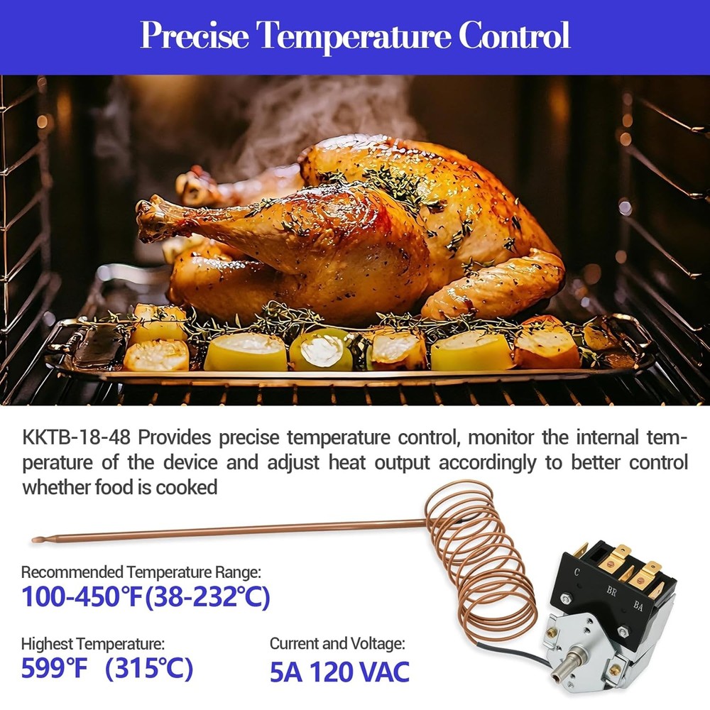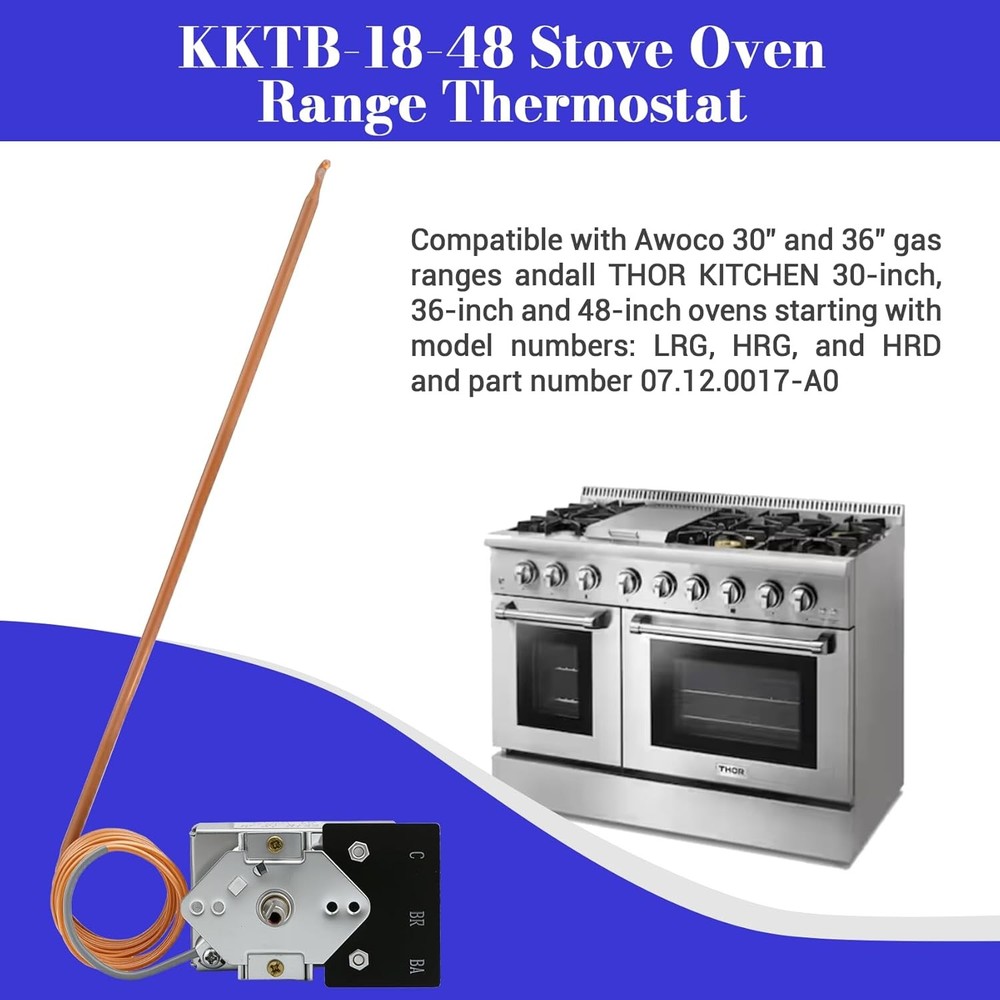 KKTB-18-48 Oven Thermostat – 5A 120VAC Max Temperature 599°F For Robertshaw 【Perfectly Compatible KKTB-18-48 Oven Thermostat】Compatible with Robertshaw KKTB-18-48 thermostats, widely compatible with Awoco 30” and 36” gas ranges, for Thor part number (07.12.0017-A0, HRD4803U), for Forno more, for Zline Nxr Modoo range thermostat kktb-18-48. Please verify your old part number and image before purchasing to ensure exact match 【Part Number and Compatible Models】Part number kktb-18-48, G36X03-030900-1. Compatible with FFSGS6239-30, FFSGS6239-36, FFSGS6239-48, FFSGS6260-30, FFSGS6260-36, FFSGS6260-48, FFSGS6244-36, FFSGS6244-48, XTA-PR30, XTA-PR36, XTA-PR48, 07.12.0017-A0 and HRD4803U more gas range stoves 【Precise Temp Control: 150–599°F】Our KKTB-18-48 thermostat is rated at 5A and 120V AC. This gas stove thermostat replacement integrates baking (150-500°F) and broiling (up to 599°F) modes. Designed for heavy-duty use. Precise temperature control is achieved through the front-mounted knob 【Brass and Stainless Steel Build】The KKTB-18-48 oven thermostat features a 48″ nickel-plated copper capillary tube and a 3/16″ × 11″ copper sensing bulb. The flexible design allows flexible routing during installation and withstands frequent use and temperature changes for long-lasting, reliable performance 【Solve Multiple Oven Issues】Still having trouble with oven temperature control? The KKTB-18-48 oven thermostat helps fix common problems like the oven not reaching the set temperature, uneven heating, broiler not igniting, or large temperature swings 【Replacement for KKTB-18-48 Range Oven Thermostat】Replaces many older thermostat models, offering a cost-effective and reliable repair solution. If you encounter any issues while using our product, we will assist you as soon as possible Payment Delivery details Return Policy Warranty Contact Us Payment Winning bidder must make arrangement for payment within three days, if payment is not made within 7 days unpaid item reminder will be filed. Delivery details We will attempt to ship your item within 1-2 BUSINESS DAYS after payment has been received. We do not ship to any destinations that are not specified in our listings. We ship to the continental 48 states; we do not ship to Alaska, Hawaii, Guam, The Virgin Islands, or Puerto Rico. Please note on some items delivery time may be longer than expected because of the Complexity of the orders, Message us for the most accurate ETA for your order. 99.9% of our orders ship within the 2 days handling time . Return Policy The following terms apply if you are returning something that was not shipped to you in error or showed up defective NO returns will be accepted after 30 days. If an exception is made and a return is accepted after 30 Days there will be a 40% restocking fee. Merchandise MUST be in new condition. All freight must be pre-paid by the customer. Shipping in non-refundable - Items with free shipping will be charged the actual shipping cost Part must be new, uninstalled, in original box. Warranty The warranty for your item should be stated in the product description. For any warranty claims, please send eBay Message - providing proof of purchase and a brief explanation of defect. We will then send warranty procedure and details. Warranty items will be replaced with the same or equivalent items. Refunds will not be given in a warranty circumstance. Contact Us Our professional Customer Service is available at our working hours: Monday-Saturday 9:00am-6:30pm(China Standard Time) Once you get the item please inspect it and make sure you get exactly what you paid for. Once you satisfy with our products and service, please leave positive feedback and 5 Stars in four areas of DSR(Detail Seller Rating) for us and we will do the same for you. If you feel that you got an item that is different from what you ordered or if it arrived damaged or if you are not satisfied with the item please email us and we will love to work with you in resolving any issues.