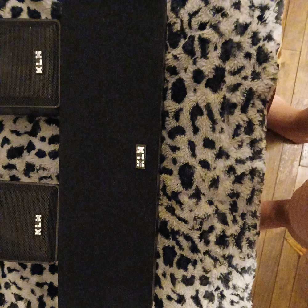 This is a KLH Dolby Pro Logic Speaker System Model #2410. It includes 2 rear and 1 center speakers with a rectangular shape, black metal construction, and high-fidelity sound quality. The speakers have Dolby Pro Logic surround sound format, bookshelf form factor, and wired connectivity with wire inputs. The center speaker has a power range of 5-50w and weighs 10.8 lbs.