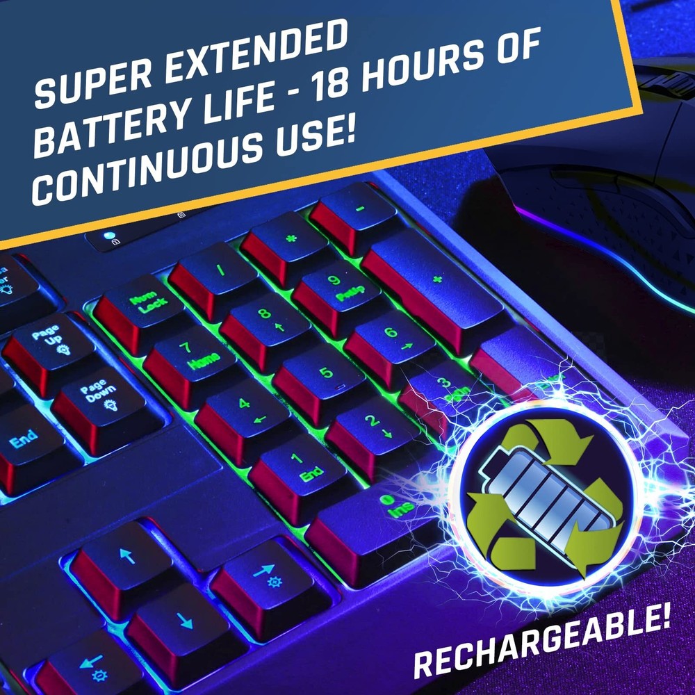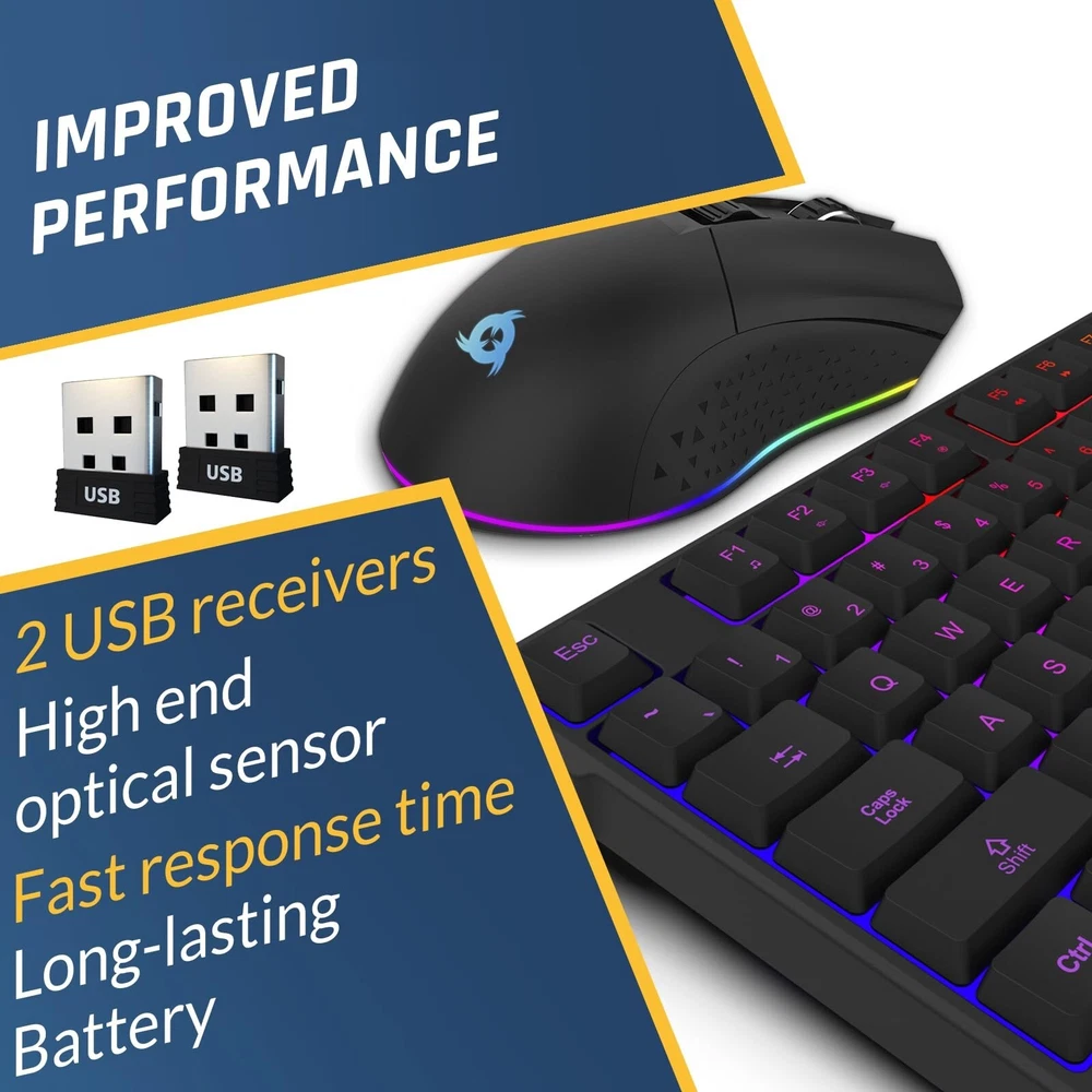 KLIM Blaze & Chroma Wireless Bundle - New 2024 - Wireless Gaming Keyboard and Mouse Combo - Responsive Durable Ergonomic - Backlit Keyboard - RGB Gaming Mouse Wireless - Long-Lasting Built-in Battery Product Details Style: Keyboard + Mouse Set Brand: KLIM MPN: KLCHR3973 EAN: 3701152103973 UPC: Does not apply Brand: KLIM Color: Black Connectivity Technology: Usb Special Feature: Ergonomic, Backlit Compatible Devices: Laptop, Gaming Console, Personal Computer Product Dimensions: 17 x 5.8 x 1.1 inches Item Weight: 0.634 ounces Manufacturer: KLIM Country of Origin: China Batteries: 2 Lithium Ion batteries required. (included) Date First Available: March 31, 2022 2 DONGLES FOR BETTER PERFORMANCE. Quick response time and reliability are essential when gaming. By using 2 different USB receivers (one for the keyboard and one for the mouse), you're sure to play in the best conditions withtout any limitations. Note: Be sure to have 2 USB free slots available on your laptop/PC before using the KLIM Chroma + Blaze Bundle. OUR TOP PERFORMING DUO IN A COMBO PACKAGE. Over a quarter million units sold collectively! Now, seize the opportunity to acquire this incredible bundle all at once! Delight in a comfortable, vibrant, and hassle-free typing experience with the KLIM Chroma keyboard. Experience the exceptional performance of the KLIM Blaze, featuring an accurate sensor and an ergonomic design. EXCLUSIVE & UPDATED VERSION. New RGB Effects + 29 antighosting keys + Windows lock function + 2 new LED indicators (Battery + Charging). This new version of the KLIM Chroma WL includes all you need to perform at your best! LONG-LASTING BATTERY. Use this keyboard and mouse for many days thanks to their integrated rechargeable battery and save on disposable ones. You'll also be contributing to a healthier environment with less waste and energy consumption. ROBUST DURABILITY WITH 5-YEAR PROTECTION. Constructed with highly-resistant ABS plastic and a special keycap coating, the KLIM Chroma is built to last. The KLIM Blaze boasts 20 million click-resistant Huano switches and a dependable PixArt sensor. Supported by a steadfast 5-year assurance and 24/7 customer service, your purchase is entirely secure.