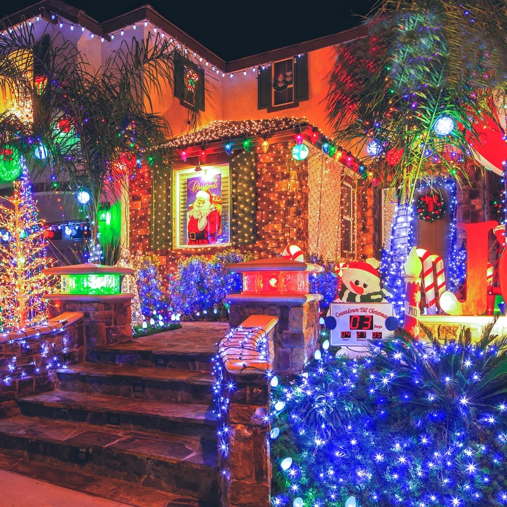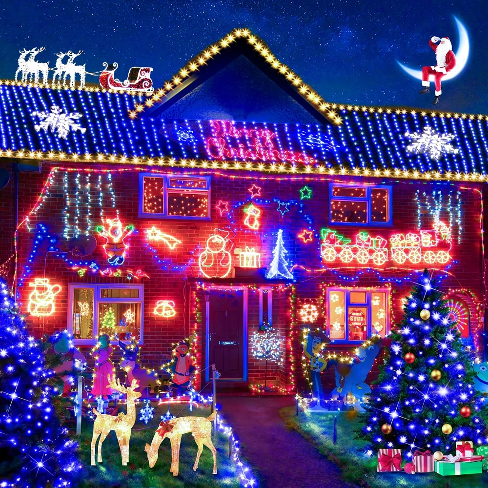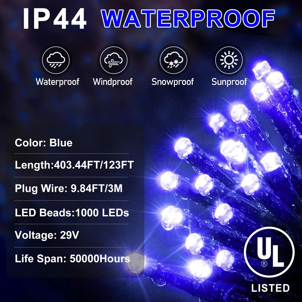 403FT Super Long and 1000LEDs Super Bright: The Green Wire Christmas lights length is 403ft with 1000LEDs beads, and 9.84ft plug cord, which can be enough to wrap around and decorate a 15ft Christmas tree, no need to extend, moreover green wire will blend well with the tree. Upgraded higher brightness LED bulbs make each LED beads shine 360 degrees but non-dazzling, to create a cozy, romantic and festive atmosphere for Christmas, Party, Wedding. As a holiday decoration, KNONEW Christmas string lights is really Excellent Value. Smart Christmas String Lights: Including 1 steady on +7 Variable Lighting Modes(Combination/In Waves/Sequential/Slo-Glo/Chasing/Slow Fade/Flash/Steady On). Stay away from single lighting mode! Whether you are hosting a lively gathering or enjoying a quiet evening under the stars, variable Lighting Modes allows you to set the perfect mood for any occasion. Safer and More Efficient: Christmas LED Lights is powered by 29V low voltage output Plug with UL certified, and Low-temp LED bulbs ensure no overheat after long time using. Very safety for kids and pets even can hold it or hang it on their bodies. The LED beads not only do they consume a fraction of the energy , but they also boast a longer lifespan, saving your both energy and money in the long run. It's a win-win situation that combines eco-friendliness with cost-effectiveness. Indoor Outdoor Used: Outdoor lights have IP44 waterproof rated, you can trust they hold up against stormy days, and provide reliable performance season after season. Kindly note the plug needs to be protected from water. Perfect for indoor and outdoor use, hang it into your yard,garden,patio,bushes,doorways,and bedroom,classroom,curtain,ceiling. Making you feel relaxed after exhausting work all day,and enjoy the peaceful moments at night. 4 Adjustable Brightness Levels and 3 Timer Function: Built-in timing and memory chip, no longer have to manually turn it on and off every day, and it will save your last mode setting or timer setting without reset. Saving your time. 100%-75%-50%-25% 4 level brightness adjustable, you can choose the brightness that makes you feel most comfortable. Super easy to install, plug-in and play, then hang it or place it anywhere you need. It`s a great gift for your family and friends.