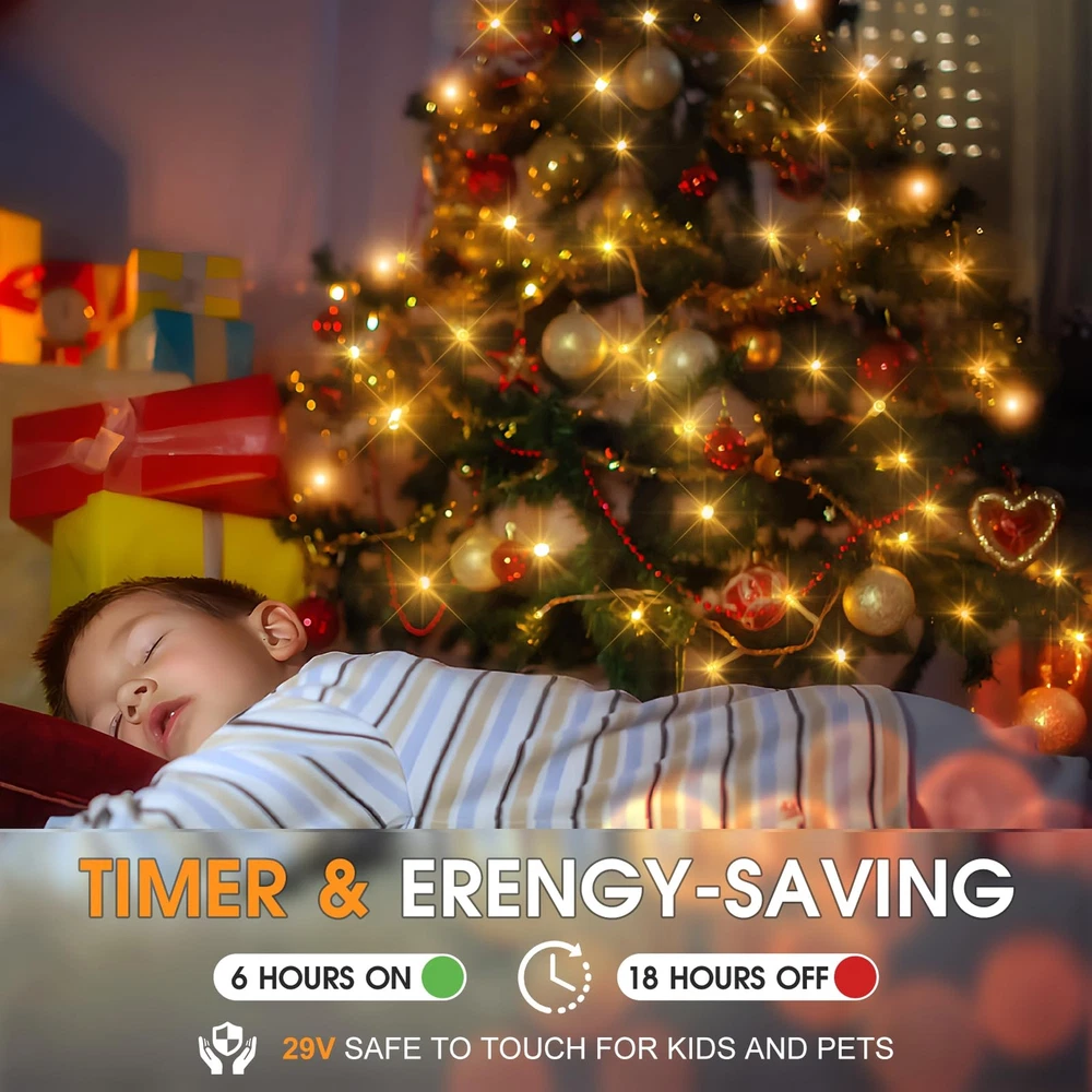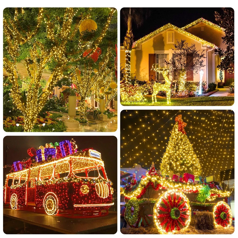 1500LED Christmas string lights outdoor(Warm White) 600FT Super Long and 1500LEDs Super Bright: The Green Wire 600ft Christmas lights with 1500LEDs beads, and 9.84ft plug cord, which can be enough to wrap around and decorate a 15ft Christmas tree, no need to extend, moreover green wire will blend well with the tree. Upgraded higher brightness and non-dazzling LED bulbs to create a cozy, romantic and festive atmosphere for Christmas, Wedding or Family Dinners. As a holiday decoration, KNONEW Christmas string lights is really Excellent Value. Smart Christmas String Lights: Including 1 steady on +7 Variable Lighting Modes(Combination/In Waves/Sequential/Slo-Glo/Chasing/Slow Fade/Flash/Steady On). Stay away from single lighting mode! Whether you are hosting a lively gathering or enjoying a quiet evening under the stars, variable Lighting Modes allows you to set the perfect mood for any occasion. Safer and More Efficient: Christmas LED Lights is powered by 29V low voltage output Plug with UL certified, and Low-temp LED bulbs ensure no overheat after long time using. Very safety for kids and pets even can hold it or hang it on their bodies. The LED beads not only do they consume a fraction of the energy , but they also boast a longer lifespan, saving your both energy and money in the long run. It's a win-win situation that combines eco-friendliness with cost-effectiveness. Indoor Outdoor Used: Outdoor lights have IP44 waterproof rated, you can trust they hold up against stormy days, and provide reliable performance season after season. Kindly note the plug needs to be protected from water. Perfect for indoor and outdoor use, hang it into your yard,garden,patio,bushes,doorways,and bedroom,classroom,curtain,ceiling. Making you feel relaxed after exhausting work all day,and enjoy the peaceful moments at night. 4 Adjustable Brightness Levels and 3 Timer Function: Built-in timing and memory chip, no longer have to manually turn it on and off every day, and it will save your last mode setting or timer setting without reset. Saving your time. 100%-75%-50%-25% 4 level brightness adjustable, you can choose the brightness that makes you feel most comfortable. Super easy to install, plug-in and play, then hang it or place it anywhere you need. It`s a great gift for your family and friends.
