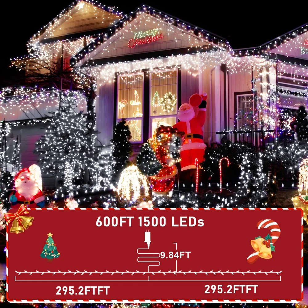 600FT Super Long and 1500LEDs Super Bright: The Green Wire 600ft Christmas lights with 1500LEDs beads, and 9.84ft plug cord, which can be enough to wrap around and decorate a 15ft Christmas tree, no need to extend, moreover green wire will blend well with the tree. Upgraded higher brightness and non-dazzling LED bulbs to create a cozy, romantic and festive atmosphere for Christmas, Wedding or Family Dinners. As a holiday decoration, KNONEW Christmas string lights is really Excellent Value. Smart Christmas String Lights: Including 1 steady on +7 Variable Lighting Modes(Combination/In Waves/Sequential/Slo-Glo/Chasing/Slow Fade/Flash/Steady On). Stay away from single lighting mode! Whether you are hosting a lively gathering or enjoying a quiet evening under the stars, variable Lighting Modes allows you to set the perfect mood for any occasion. Safer and More Efficient: Christmas LED Lights is powered by 29V low voltage output Plug with UL certified, and Low-temp LED bulbs ensure no overheat after long time using. Very safety for kids and pets even can hold it or hang it on their bodies. The LED beads not only do they consume a fraction of the energy , but they also boast a longer lifespan, saving your both energy and money in the long run. It's a win-win situation that combines eco-friendliness with cost-effectiveness. Indoor Outdoor Used: Outdoor lights have IP44 waterproof rated, you can trust they hold up against stormy days, and provide reliable performance season after season. Kindly note the plug needs to be protected from water. Perfect for indoor and outdoor use, hang it into your yard,garden,patio,bushes,doorways,and bedroom,classroom,curtain,ceiling. Making you feel relaxed after exhausting work all day,and enjoy the peaceful moments at night. 4 Adjustable Brightness Levels and 3 Timer Function: Built-in timing and memory chip, no longer have to manually turn it on and off every day, and it will save your last mode setting or timer setting without reset. Saving your time. 100%-75%-50%-25% 4 level brightness adjustable, you can choose the brightness that makes you feel most comfortable. Super easy to install, plug-in and play, then hang it or place it anywhere you need. It`s a great gift for your family and friends.