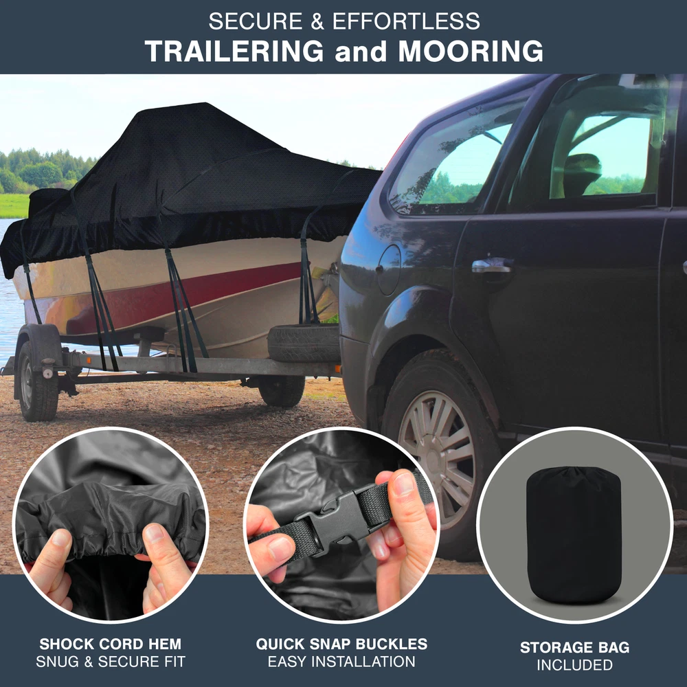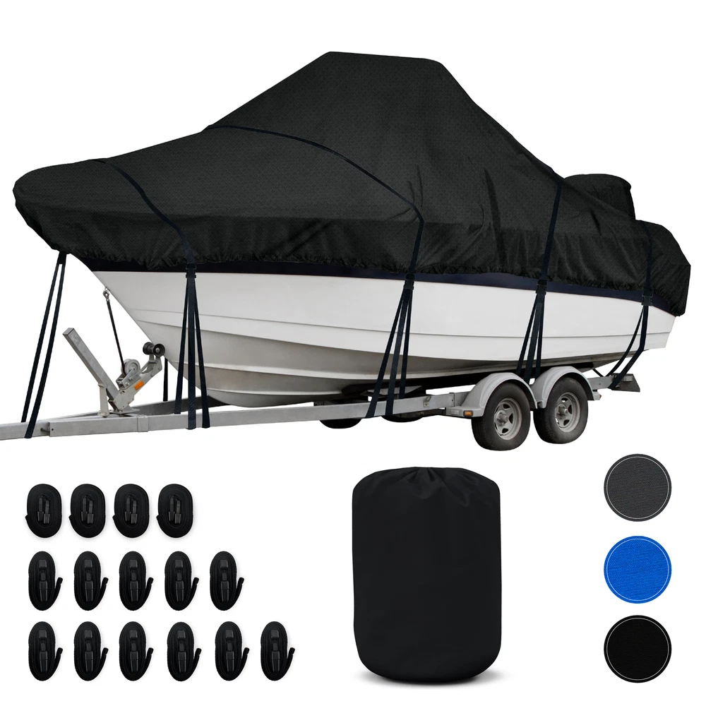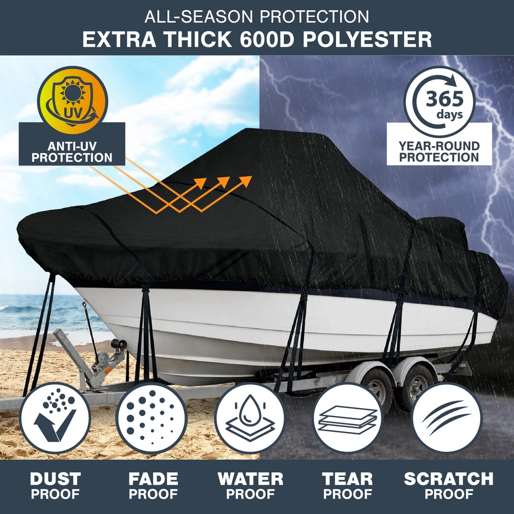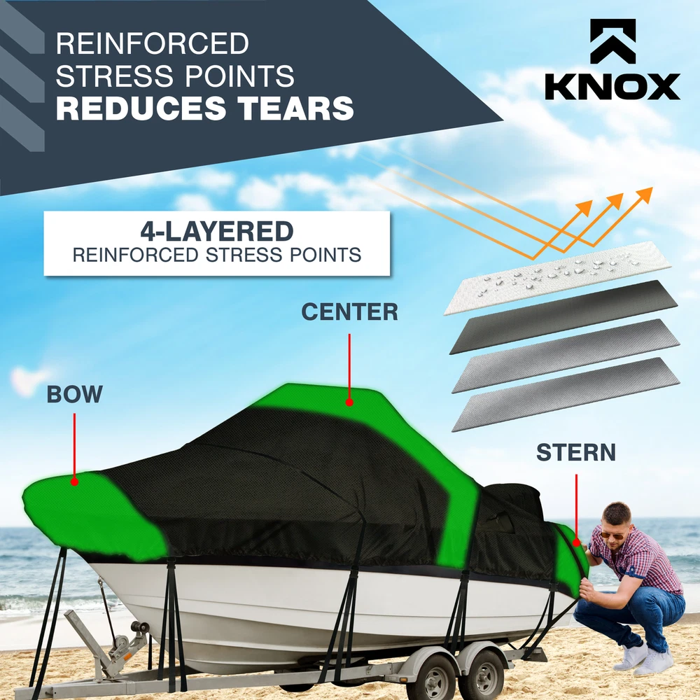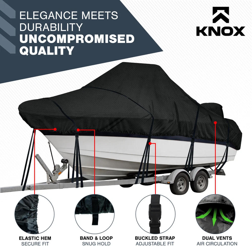 KNOX 600D Center Console Boat Cover Anti-fade Integrated Motor Cover Trailerable KNOX Center Console Boat Cover, Built-In Outboard Motor Cover, 600D Waterproof Trailerable Boat Cover with Tie-Down Straps & Storage Bag Features: [ANTI-FADE 600D POLYESTER] - Our center console boat cover boats is constructed with advanced 600D polyester with anti-fade properties & double-stitched seams to ensure long-lasting protection for your center console boat. It boasts an impressive color fastness rating of 4.5-5 - the highest fade resistance possible—making this the optimal boat cover 16 ft. Our winter boat cover is tear-resistant, anti-UV, and waterproof, ensuring your boat remains in pristine condition all year-round. [ALL YEAR-ROUND PROTECTION] - Tired of replacing your boat cover year after year? With a decade of design expertise, KNOX ensures long-lasting protection. Our tear-proof fabric forms a robust shield against rain, snow, wind, and sun, safeguarding your boat in any climate. Its reinforced front, center, and rear stress points make it highly durable, ensuring your center console boat covers can handle winter storage and mooring in all-seasons. Discover the very best in boating accessories! [SECURE FIT, STORM-PROOF SHIELD] - Forget flimsy covers that flap and struggle in the wind thanks to KNOX's center console boat storage cover. Featuring a windproof shock cord hem that firmly clings to your boat and ensures a secure and snug fit. Even on windy days, you can trust our boat console covers to stay firmly in place, safeguarding your boat from high winds and stormy conditions. Installation is a breeze with sewn-on boat cover straps and quick snap buckles, ensuring a swift setup! [SUITABLE FOR TRAILERING & MOORING] - Concerned about the resilience of your boat cover during transport? Our boat cover support, with shock cord hem is suitable for high-speed highway trailering and equally adept for secure mooring. With our boat center console cover, enjoy worry-free travel, knowing your investment remains protected through every journey. Our cover also has 2 air vents that allow moisture to escape, enhancing breathability. A must-have center console boat accessory! [INTEGRATED MOTOR COVER & STORAGE BAG] - Experience unmatched convenience with KNOX's all-in-one boat console cover. Our heavy duty boat cover comes integrated with an outboard motor cover, eliminating the need for a separate purchase. In addition to the waterproof boat cover, you'll receive boating accessories at no extra cost, including an extra-large storage bag and 15 detachable side straps (4 large & 11 small). Our boat cover is PU coated, making it resistant to moisture, stains & chemicals. Specifications: Material: 600D Polyester Brand: KNOX Condition: 100% Brand New Package Includes: 1x Center Console Boat Cover 15x Detachable Straps 1x Storage Bag Upgrade Shipping to 3-Day Choose Expedited shipping option at checkout. California Customers: ⚠️ WARNING: This product may contain chemicals known to the State of California to cause cancer, birth defects or other reproductive harm. For more information go to P65Warnings.ca.gov All trademarks remain property of their respective holders, and are used only to directly describe the products being provided. Their use in no way indicates any relationship between us and the holders of said trademarks. The product being sold in this listing is not DOT approved unless otherwise stated. All goods sold are not DOT approved, they are for off road use only. Laws concerning this product vary from state/province to state/province. Your state/province may prohibit its use on public roads or restrict its use to novelty, show use, off-road areas, or race facility areas only. In some states/provinces off-road uses are also prohibited. The manufacturer and retailer assume no responsibility for any use or application of this product in violation of any applicable law. Before installing this product, please check your state/provincial and local/municipal laws and regulations.