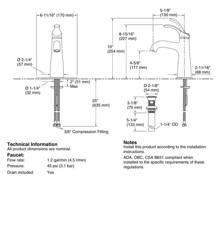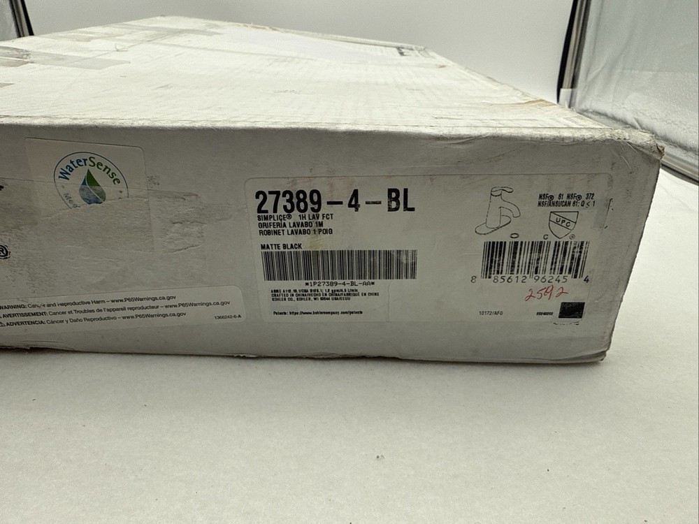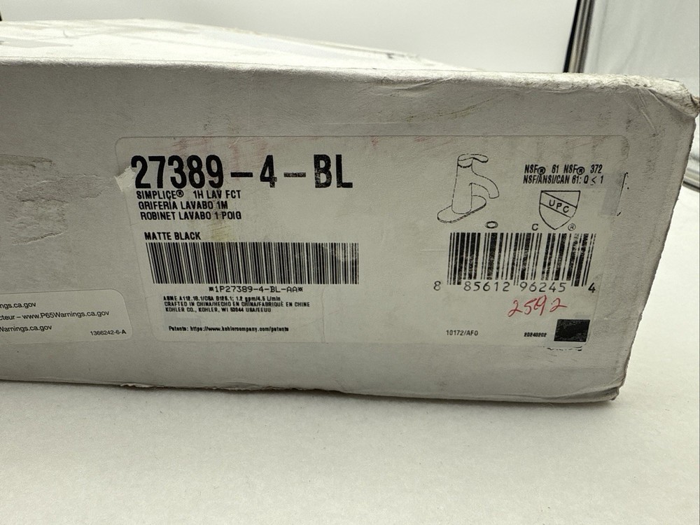 Open box, New condition. Retail price is $316.08 This faucet was returned to an online retailer and may or may not qualify for manufacture warranty. With an elegant, universal design, the Simplice faucet collection speaks a chic design language which everyone can understand. With its simple, fluid lines, Simplice makes a quiet statement in any bathroom and brings remarkable quality at an approachable price. Kohler K-27389-4-BL A single handle controls both on/off activation and temperature setting Kohler ceramic disc valves exceed industry longevity standards for a lifetime of durable performance Clicker drain with tailpiece and overflow Coordinates with other products in the Simplice collection Kohler K-27389-4 Specifications: Height: 8-15/16" (deck to top of faucet) Spout Height: 4-5/8" (deck to spout outlet) Spout Reach: 5-1/8" (faucet base to spout outlet) Flow Rate: 1.2 gallons-per-minute Maximum Deck Thickness: 2" (cannot mount on thicker decks) Faucet Hole Size: 1-1/8" Faucet Holes: 1 (minimum number of holes required for installation) Escutcheon Width: 6-11/16" (left to right) A single handle controls both on/off activation and temperature setting. • 5-1/8" (130 mm) spout reach. • 1.2 gpm (4.5 lpm) maximum flow rate at 60 psi (4.14 bar). • KOHLER ceramic disc valves exceed industry longevity standards for a lifetime of durable performance. • Clicker drain with tailpiece and overflow. • Coordinates with other products in the Simplice collection. Material • Premium material construction for durability and reliability. • KOHLER finishes resist corrosion and tarnishing. Installation • For single-hole or 4" (102 mm) centerset installation (escutcheon plate included). • Deck-mount. • Preattached flexible supply lines simplify installation. Water Conservation & Rebates • This product can help a building earn Water Efficiency points in LEED® Green Building Rating System. Recommended Products/Accessories K-23726 Drain treatment K-23723 Faucet cleaner K-27393 18" towel bar K-27394 24" towel bar K-27395 Robe hook K-27396 Towel arm K-27397 Pivoting toilet paper holder Codes/Standards ASME A112.18.1/CSA B125.1 NSF/ANSI 61 NSF/ANSI 372 All applicable US Federal and State material regulations DOE - Energy Policy Act 1992 EPA WaterSense® California Energy Commission (CEC) ADA ICC/ANSI A117.1 CSA B651 OBC See website for detailed warranty information. Available Colors/Finishes Color tiles intended for reference only. Color Code Description CP Polished Chrome BN Vibrant® Brushed Nickel BL Matte Black