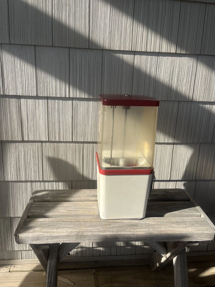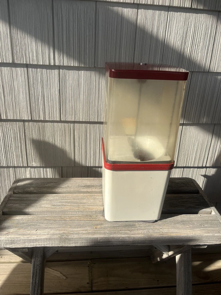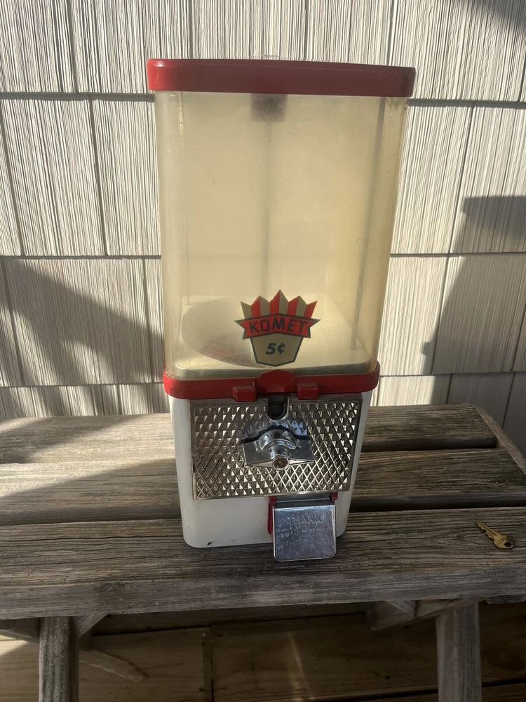 THIS IS A 5 CENT KOMET BULK VENDING MACHINE IN FAIRLY GOOD CONDITION. IT DOES HAVE A FEW ISSUES, THE COIN MECH IS NOT WORKING PROPERLY, (IT KEEPS TURNIING, NO COIN IS NEEDED), NEEDS A GOOD CLEANING AND THE LOCK IS FAKE, (YOU ONLY NEED A SCREWDRIVER TO OPEN IT)