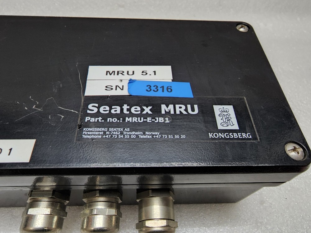 We are pleased to offer KONGSBERG SEATEX MRU-E-JB1 MOTION REFERENCE UNIT Product Detail: KONGSBERG SEATEX MRU-E-JB1 MOTION REFERENCE UNIT PART NO: MRU-E-JB1 TYPE: MOTION REFERENCE UNIT Shipment processing time: All orders are processed within 1-2 business days. Orders are not shipped or delivered on weekends or holidays. Shipment confirmation & Order tracking: You will receive a Shipment Confirmation email once your order has shipped containing your tracking number(s). The tracking number will be active within 24 hours. Customs, Duties and Taxes: We are not responsible for any customs and taxes applied to your order. All fees imposed during or after shipping are the responsibility of the customer (tariffs, taxes, etc.). Damages: In case of damage or lost of shipment during transit, We will investigate the matter and provide the satisfactory resolution. Returns Policy: We offer return or exchange of ordered item up to 30 days of receipt of goods in subject to certain condition. In case of damaged goods we shall offer the replacement or refund for the ordered item. If you require any more details, request you to send us the direct message through eBay for early resolution. Thanks