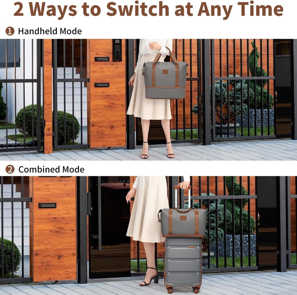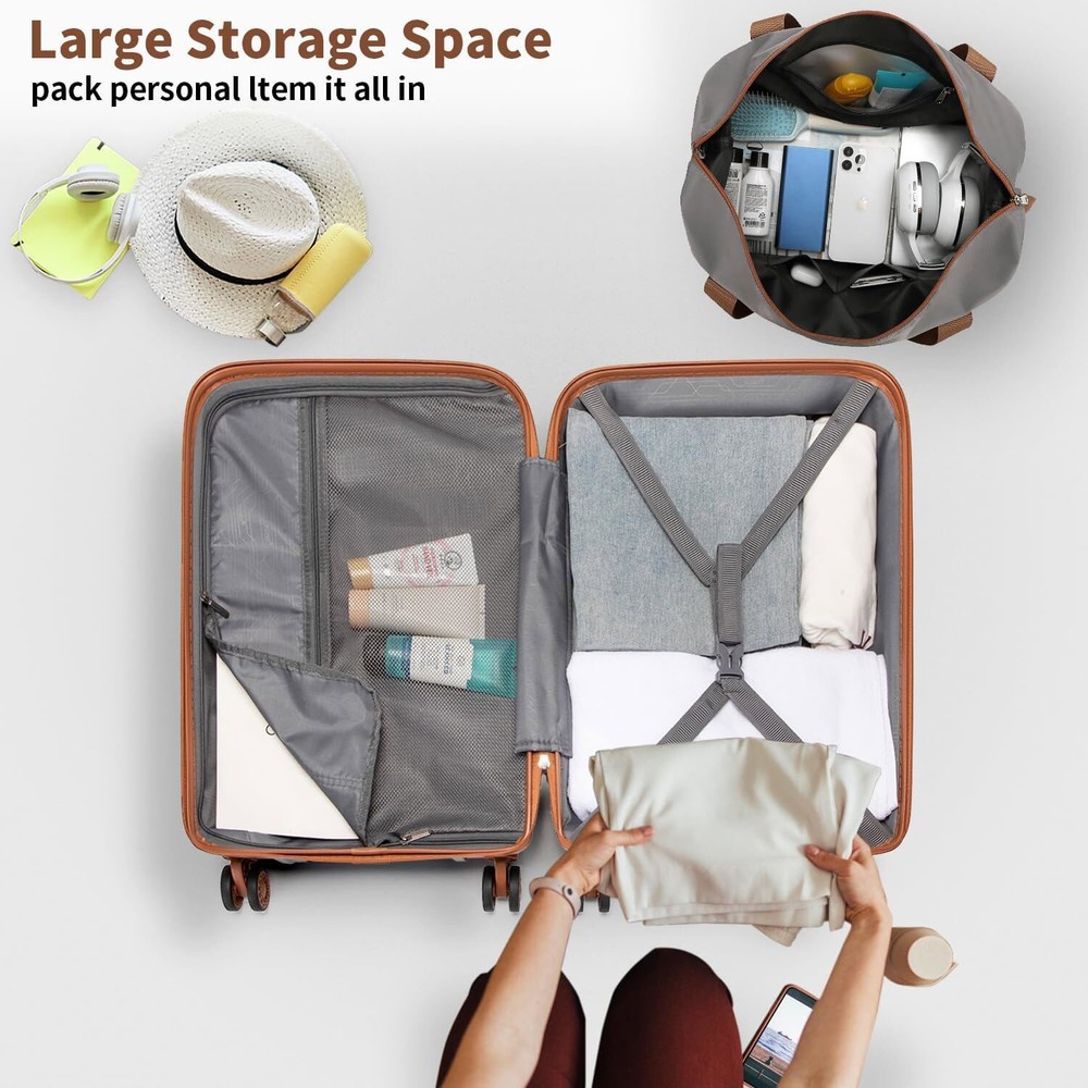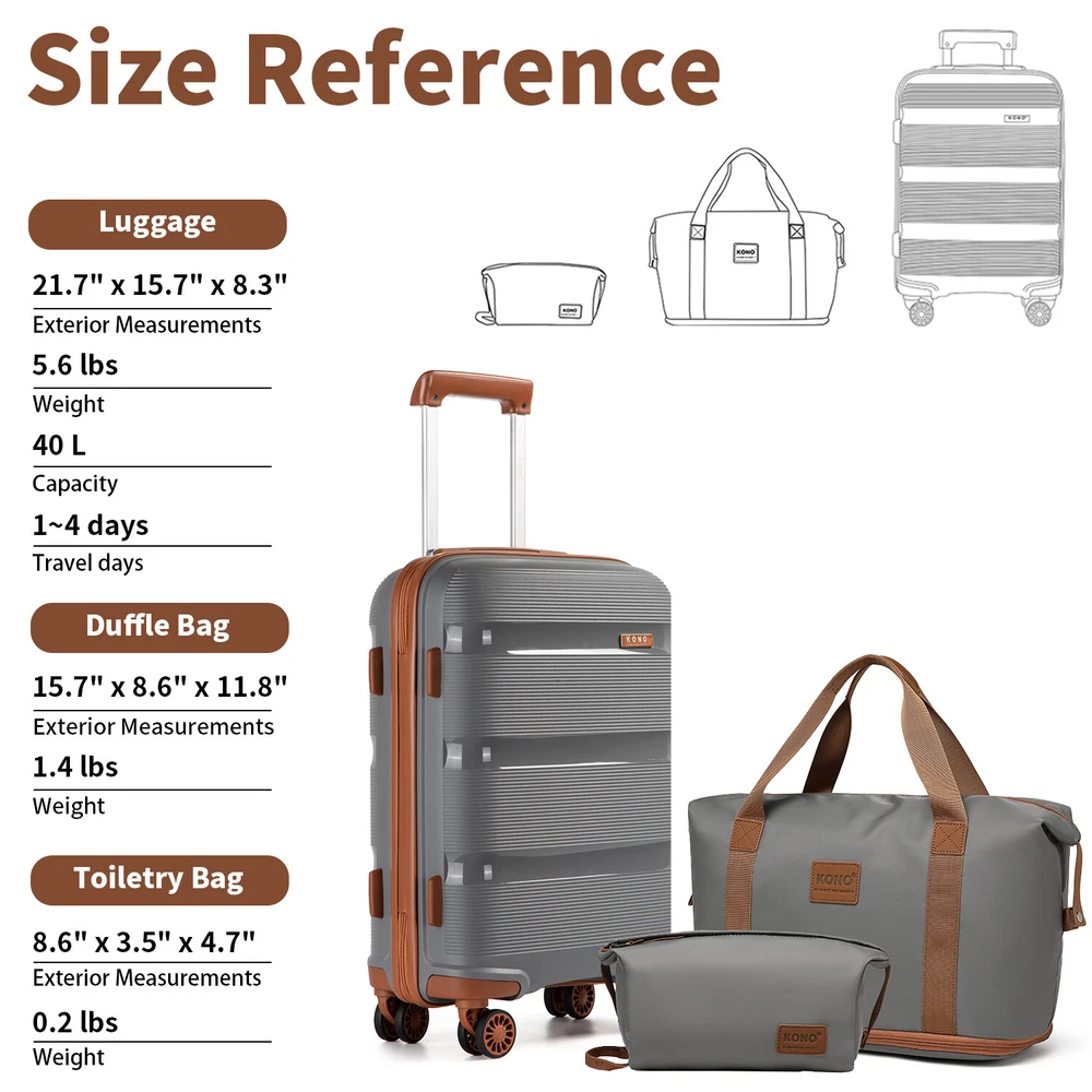 Luggage Sets 3Piece Carry On Luggage 20Inch With Spinner Wheels Durable Suitcase This set is perfect as it will cover you whether you are going on a city break or a sunny holiday. Material: Outer material: strong and durable ABS (Acrylonitrile Butadiene Styrene) Inner lining: polyester Aluminium telescopic handle Silver-tone metal hardware - YKK zippers Wipe clean only Size: Carry - On Suitcase: 21.7" x 15.7" x 8.3" Weekender Bag: 15.7" x 11.8" x 8.7" Toiletry Bag: 8.6" x 4.7" x 3.5" Perfect for leisure - loving, stylish travelers, weekend trippers, and short - term business travelers. We offer a 2 - year replacement guarantee for all manufacturing defects. All measurements are external, internal measurements may differ approx 1-2cm. Durable & Functional Design Hardshell Suitcase & Waterproof Bag The Kono suitcase has a lightweight yet durable polypropylene hard shell, resisting scratches and pressure. The travel bag, made of waterproof nylon, ensures your items stay safe in rainy conditions. TSA Lock & Smooth - Gliding Wheels The TSA lock is convenient for international travel, allowing TSA agents to inspect without breaking the lock. The suitcase's 360° swivel twin wheels enable smooth and quiet movement in busy terminals. Expandable Duffel Bag The duffel bag can be expanded for extra space. A bottom zip increases its capacity. A small strap lets you attach it to the suitcase handle, freeing your hands for a more pleasant trip. Versatile Combinations This 3 - piece set, including a carry - on, can be arranged according to your needs and travel duration. Ideal for various occasions like travel, weekends, sports, and social gatherings. The bags can be nested for easy storage, saving you space. How to set the code: All locks are preset to '000', to change this you need to press the reset button (with a pen or toothpick). Change the three numbers to your desired code. Let go of the reset button and now the code is set. Make sure it is something memorable for you but not too simple.