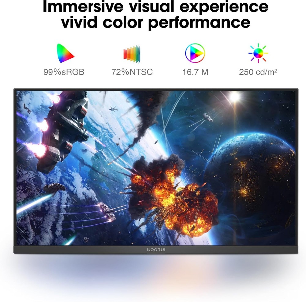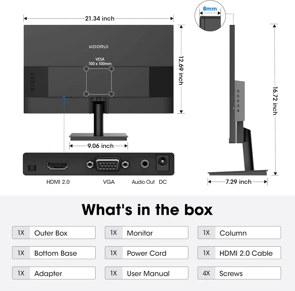 KOORUI 24 Inch Gaming Monitor 144Hz Full HD 1920 x 1080p IPS 24/144Hz/FHD Description Features: Smooth gaming performance: The KOORUI gaming monitor delivers a seamless gaming experience with a 144Hz refresh rate and FreeSync support. Say goodbye to screen tearing and lag—perfect for fast-paced competitive gaming. Vibrant color accuracy: Enjoy stunning visuals with this 24-inch KOORUI monitor, featuring an IPS panel, 99% sRGB, and 72% NTSC color coverage. Wide viewing angles and accurate color reproduction make it ideal for gaming, content creation, and media consumption. Eye comfort for long sessions: This monitor is equipped with flicker-free technology and a low blue light mode, effectively reducing eye strain during extended use. Stay productive or immersed in your favorite games for hours without discomfort. Multiple connectivity options: The koorui 24 inch gaming monitor includes HDMI, VGA, and audio-out ports for flexible connectivity. Easily connect your PC, laptop, gaming console, or external speakers for a complete setup. Ergonomic and mountable design: Tilt the screen from -5° to 15° for optimal viewing comfort. With 100x100mm VESA mount compatibility, this KOORUI monitor is easy to mount on a wall or arm, saving desk space and enhancing your workspace flexibility Product Details: Product Dimensions: 7.29 x 21.34 x 16.72 inches Item Weight: 8.08 pounds Manufacturer: KOORUI Item model number: MB24V29F Standing screen display size: 24 Inches Aspect Ratio: 16:9 Resolution: 1920 x 1080 Pixels Image brightness: 250 Candela per Square Meter Brand: KOORUI Screen Size: 24 Inches Resolution: FHD 1080p Screen Surface Description: Matte Handling We will ship all orders within 1 business day of payment. Delivery We Do Not Ship Outside of the Continental US. Return Policy All items qualify for returns within 30 days of receipt. Buyer is responsible for return shipping on any item that is not damaged. Feedback We take our reputation seriously, we buy and sell online, so we understand the value of trust. If you are unsatisfied with your order, please contact us and we will work with you to resolve it to your satisfaction.