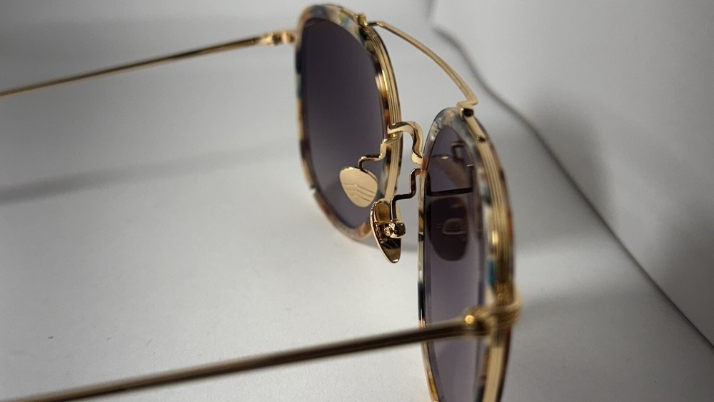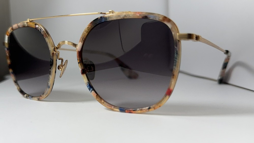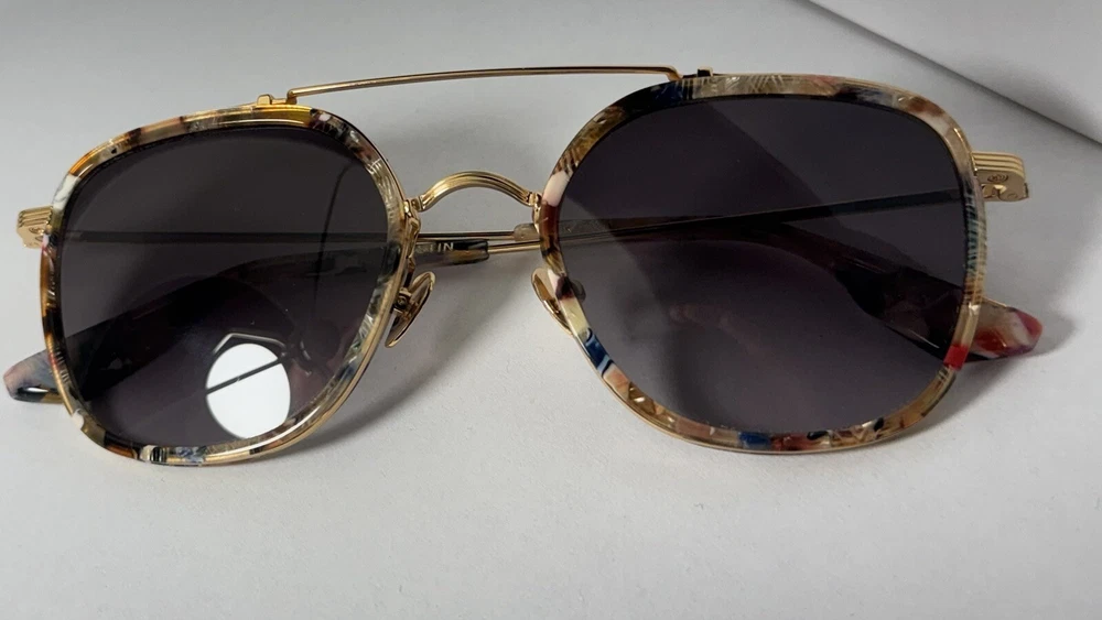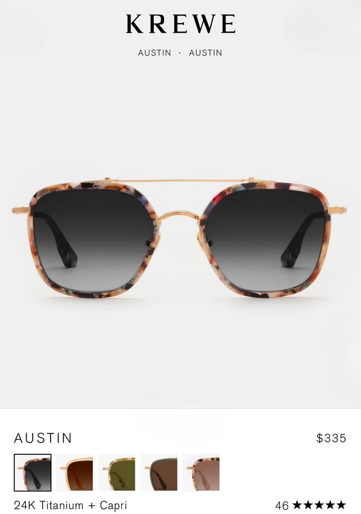 KREWE Austin Titanium + Capri 24K Sunglasses The two-trick pony. Named for the vibrant Texas city, the KREWE Austin take the classic aviator silhouette and give it a modern twist. With a flattering shape that suits most face types, this frame stands out with its bold, contrasting straight brow bar and rounded bridge. Perfect for any occasion, the Austin is your go-to for effortlessly cool style, whether you’re spending a day on Rainey Street or exploring new horizons. Handcrafted with meticulous attention to detail, the Austin frame combines glossy acetate with luxurious 24K gold-plated titanium hardware for a refined yet durable finish. Petite integral titanium hinges enhance the frame’s strength, while adjustable nose pads and temple wires ensure a secure and customized fit. Thanks to the handmade process, each pair features subtle variations in pattern and color, making every frame unique. The custom Grey Gradient lenses add a sleek, sophisticated touch while offering exceptional functionality. These lenses provide 100% UVA and UVB protection to shield your eyes from harmful rays, while anti-reflective and scratch-resistant coatings ensure clarity and long-lasting durability. Note: This item is 100% authentic and brand new, sourced from boutique overstock and showroom pulls. Because of this, original packaging (case/box) is not included. We stand by every item we sell—if you have any concerns, we’re here to help.
