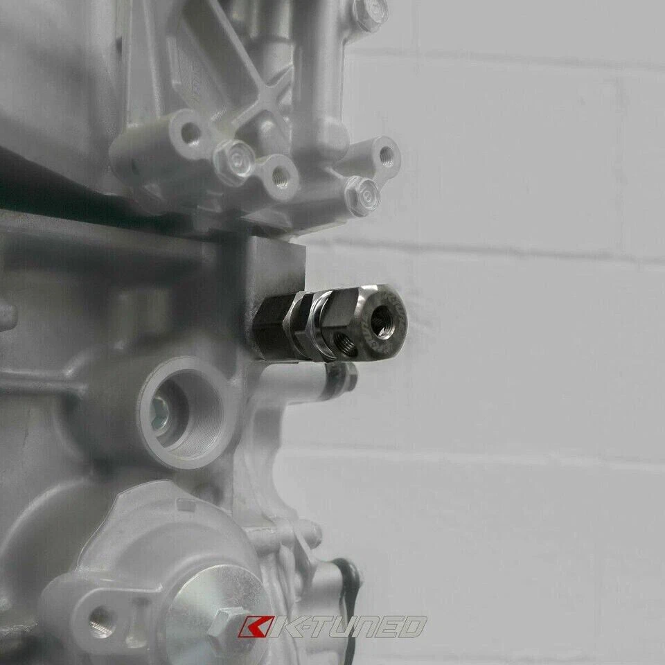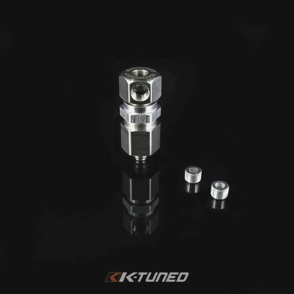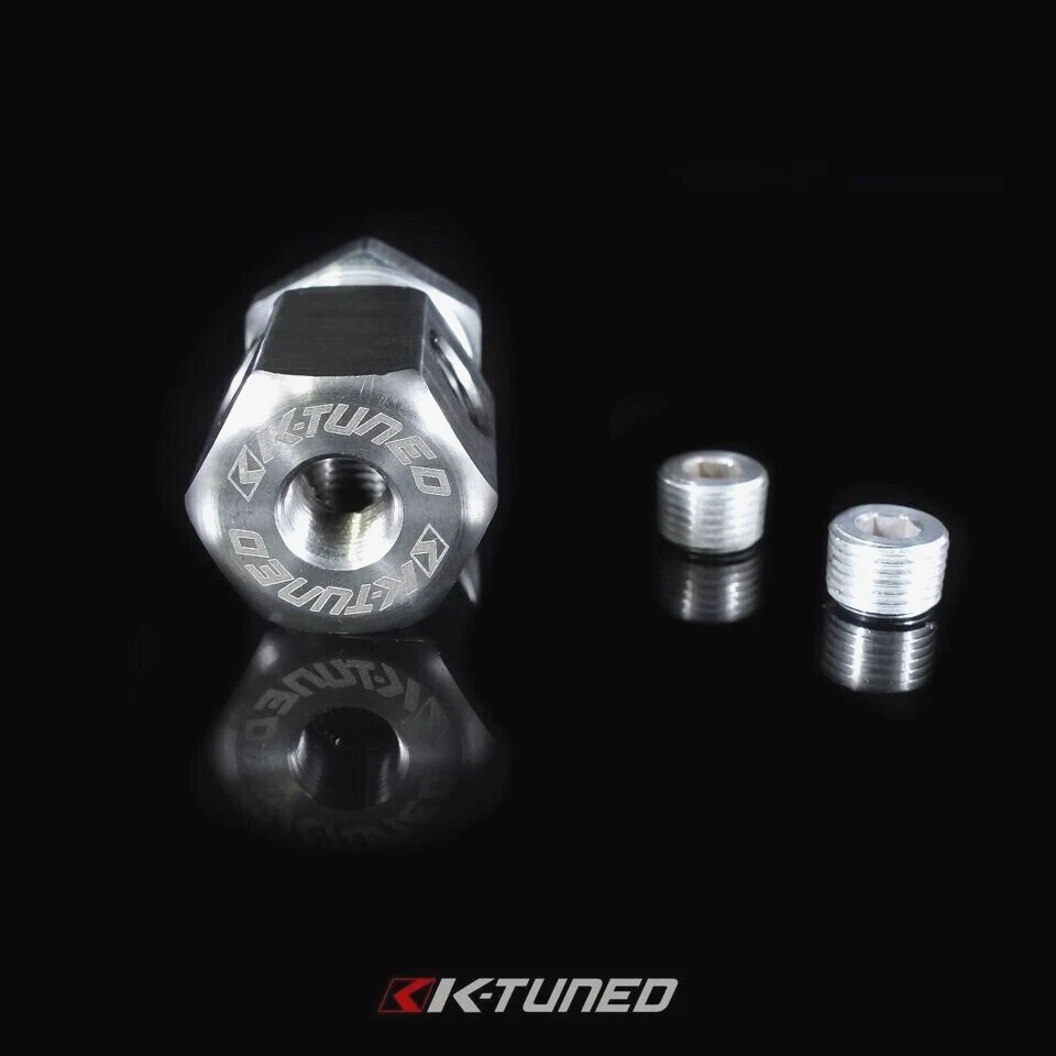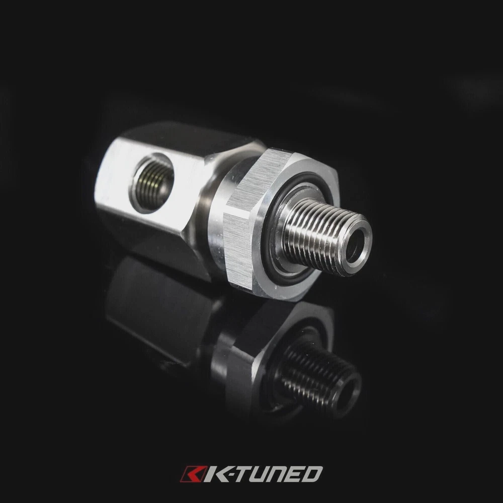 K-TUNED OIL PRESSURE SENSOR ADAPTER (Version 3) FOR HONDA & ACURA KTD-OPS-AD3 Part # KTD-OPS-AD3 1/8 BSPT Thread. Notes: You must use Hondabond or Teflon tape on all threads on the adapter. The oil pressure sensor adapter is must have when adding additional oil sensors or wanting to easily add an oil feed line. Designed with 1/8BSPT male thread to match Honda Block. The adapter offers a couple nice features to help installation and prevent problems. With the new updated version we have added an extension to help clear the oil cooler and VTEC solenoid. The extension will be the first piece threaded into the block using Hondabond to seal it just like the OEM sensor. Then you will thread out adapter into the extension. We have kept the same jam nut with double o-ring seal to help with sideload. The adapter has 3 1/8NPT threads around the end of the adapter and a 1/8BSPT thread at the end for the stock sensor. The kit includes extra O-rings, Teflon tape, and two 1/8NPT plugs.
