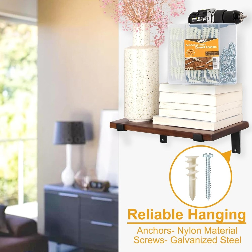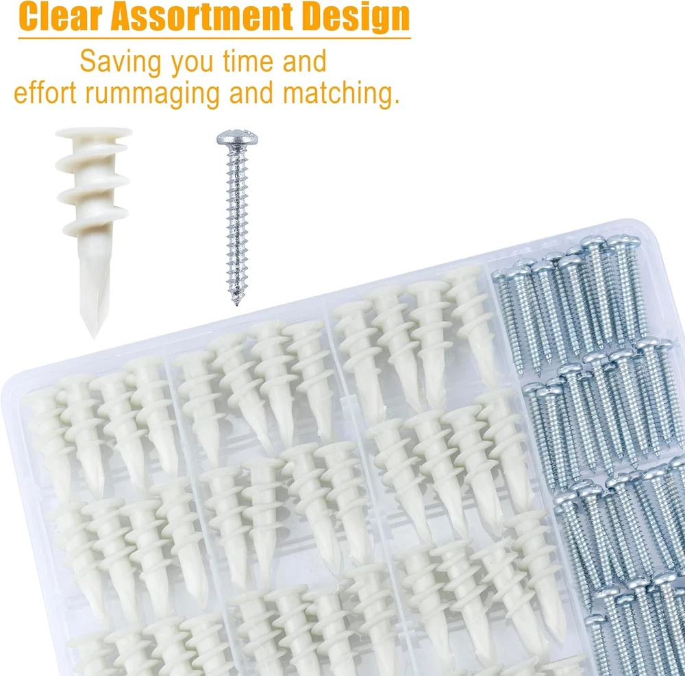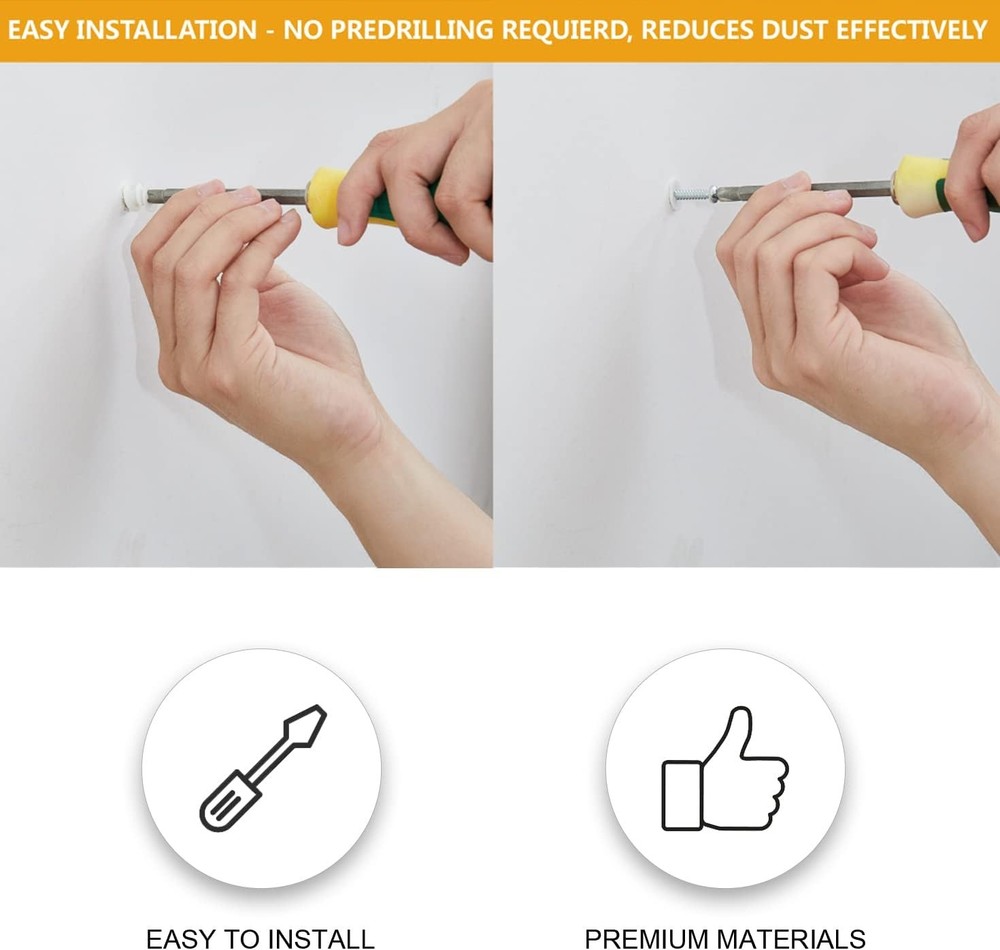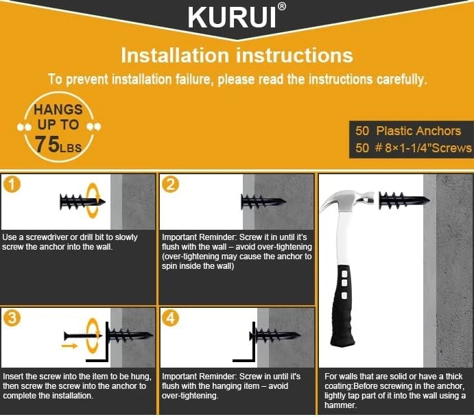 KURUI #8 Self Drilling Drywall Anchors, 100PCs Dry Wall One Size, White Product Details Material: Nylon Drive System: Phillips Head Style: Round Item dimensions L x W x H: 1.9 x 3.1 x 5.4 inches Exterior Finish: Metal Thread Size: #8-32 Point Style: Self Drilling Metal Type: Carbon Steel Brand: KURUI Color: White Head Type: Round Item Weight: 8.63 Ounces Thread Type: Fully Threaded Thread Coverage: Fully Threaded Fastener Type: Drywall Anchors Thread Style: Right Hand Fastener Size: 1-1/4" Size: One Size Number of Pieces: 100 Manufacturer: Jerry Part Number: SF31248 Item Weight: 8.6 ounces Product Dimensions: 1.9 x 3.1 x 5.4 inches Country of Origin: China Item model number: SF31248 Style: 100 Pcs Shape: Wedge Item Package Quantity: 1 Measurement System: Imperial Certification: As Usage: Drywall Batteries Included?: No Batteries Required?: No Material: Nylon Drive System: Phillips Head Style: Round Item dimensions L x W x H: 1.9 x 3.1 x 5.4 inches Exterior Finish: Metal PREMIUM NYLON MATERIALS PLUS GLASS FIBER – Made of high-quality hard nylon plastic mixed with highly robust glass fibers, these threaded self-tapping wall anchors are super hard, durable, anti-aging and wear resistant. They can hold objects with maximum weight of 75lbs and provide strong and sturdy grip into the wall, and the anchor will not damage the dry wall. 50 premium galvanized Phillips screws ensures reliable installation and hanging. PRACTICAL DESIGN FOR STABLE INSTALLATION - The threads cut deep into the material, providing a secure hold and pull-out resistant grip of the wall anchor and screw kit. The large threads are intended to hold firmly in drywall and can hold up to 75 pounds of objects. Suitable for hanging heavy duty pictures, photo frames, art, canvases. EASY INSTALLATION WITH SCREWDRIVER – These threaded drywall anchors feature sharp, pointed shanks that can be screwed into the wall without a pre-drilled hole by using a screwdriver or a screw gun, which produces less dust. Once the anchor is in the wall, the screw is inserted, the anchor will wedge tightly against the drywall. These plastic drywall anchors can easily be removed can be reuse. HEAVY DUTY & WIDE APPLICATION – The self-drilling drywall anchors are recommended for medium-duty applications and are very easy to install. They are perfect for hanging bathroom and kitchen accessories, shelving, light fixtures, mirrors, picture frames, curtain rods and small decorative shelves, and more. WORRY-FREE SHOPPING – Please check the package content as you received the product. we focus on product quality and value the shopping experience of our customers highly. Every product purchased from us comes with a 24/7 friendly customer service. Whenever you have a question, please feel free to contact us!