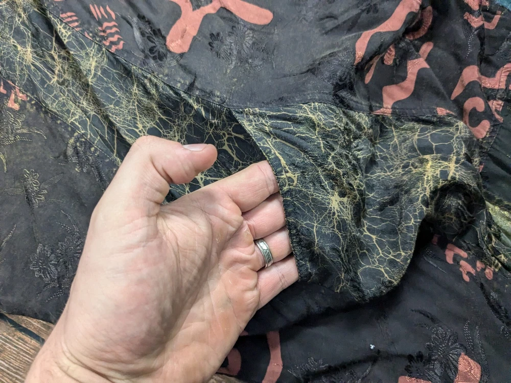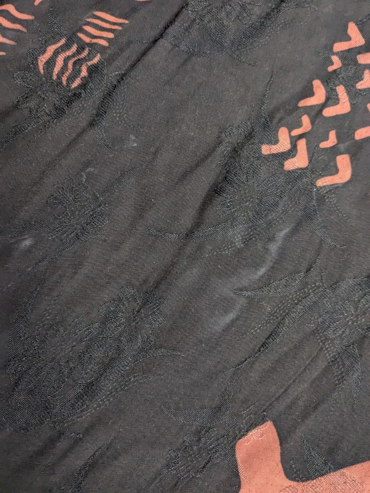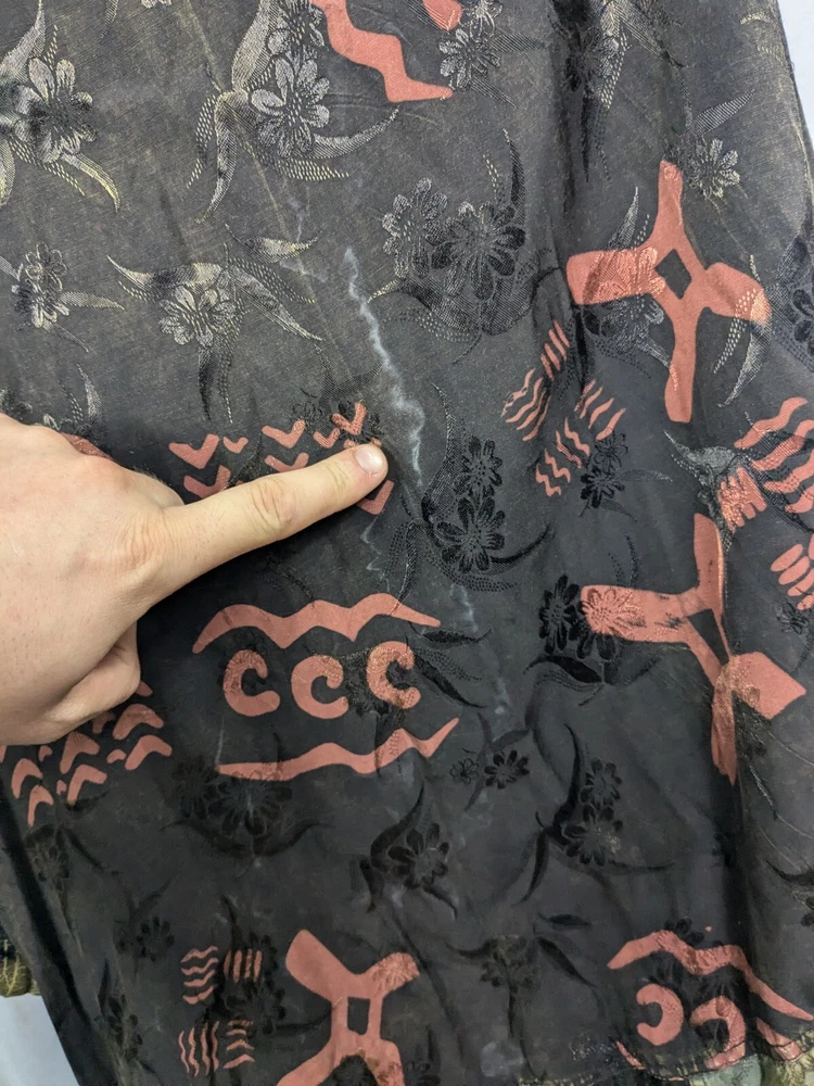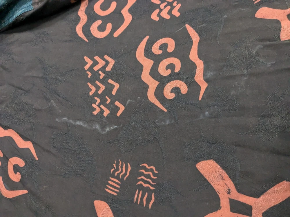 Has a few white streaks on the back that can be seen on the inside too. Not sure if this would come out or if it was an ironing mark.. see photos. It gets hidden in the color regardless. See photos. Sooooo much detail on this piece of art!