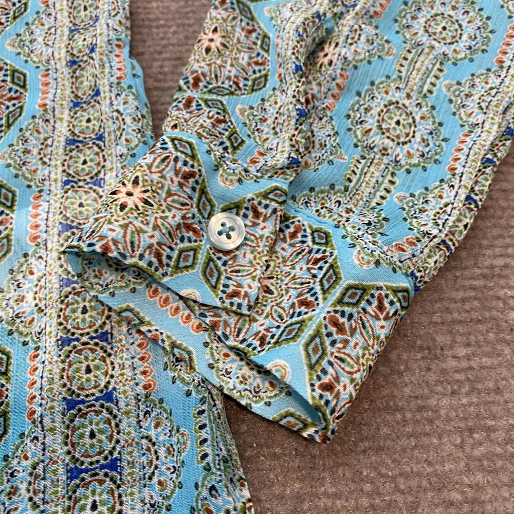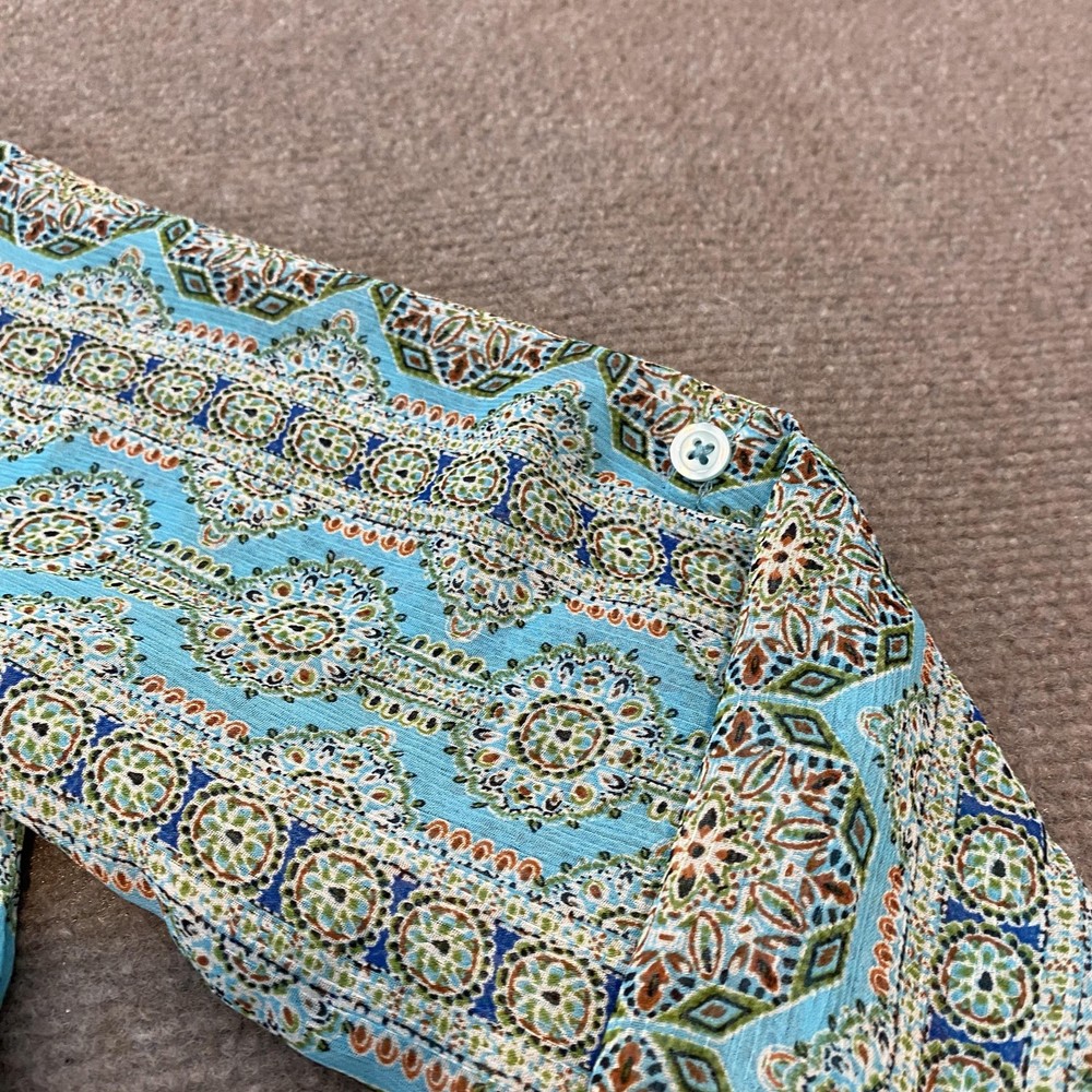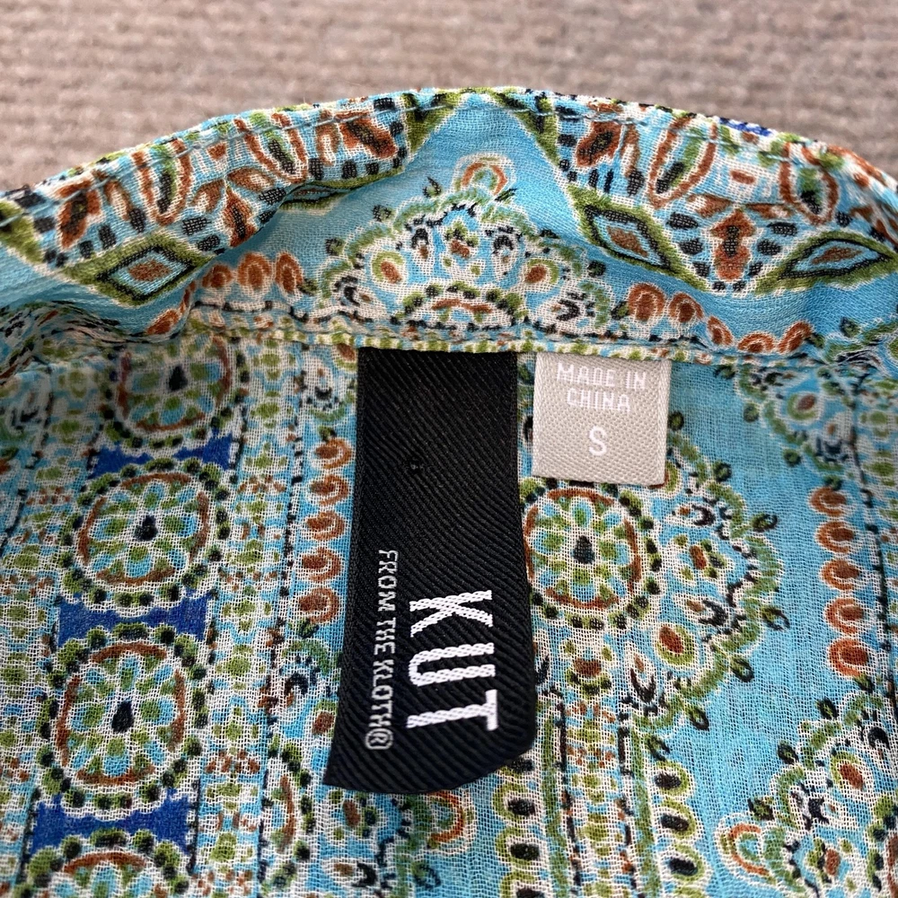 KUT from the Kloth Shirt Womens Small Blue Geometric Print Button Up Long Sleeve Condition: Gently worn, no visible flaws Material: 100% polyester Features a striking blue geometric patterned print with green, white, and orange accents Button front closure with matching button cuffs and a single chest pocket Modern collarless neckline for a contemporary look Long sleeves with button-tab to convert to roll up Style #KT32138, RN#58539 Tag size: Small (Womens) - See provided garment measurements in images for best fit