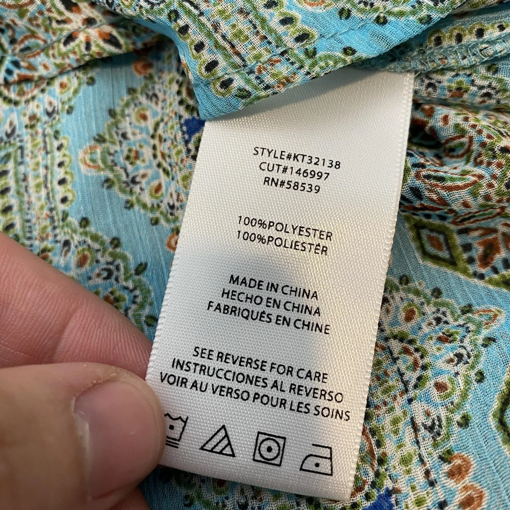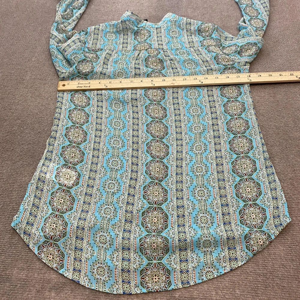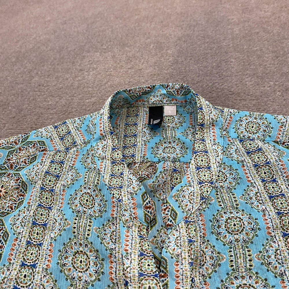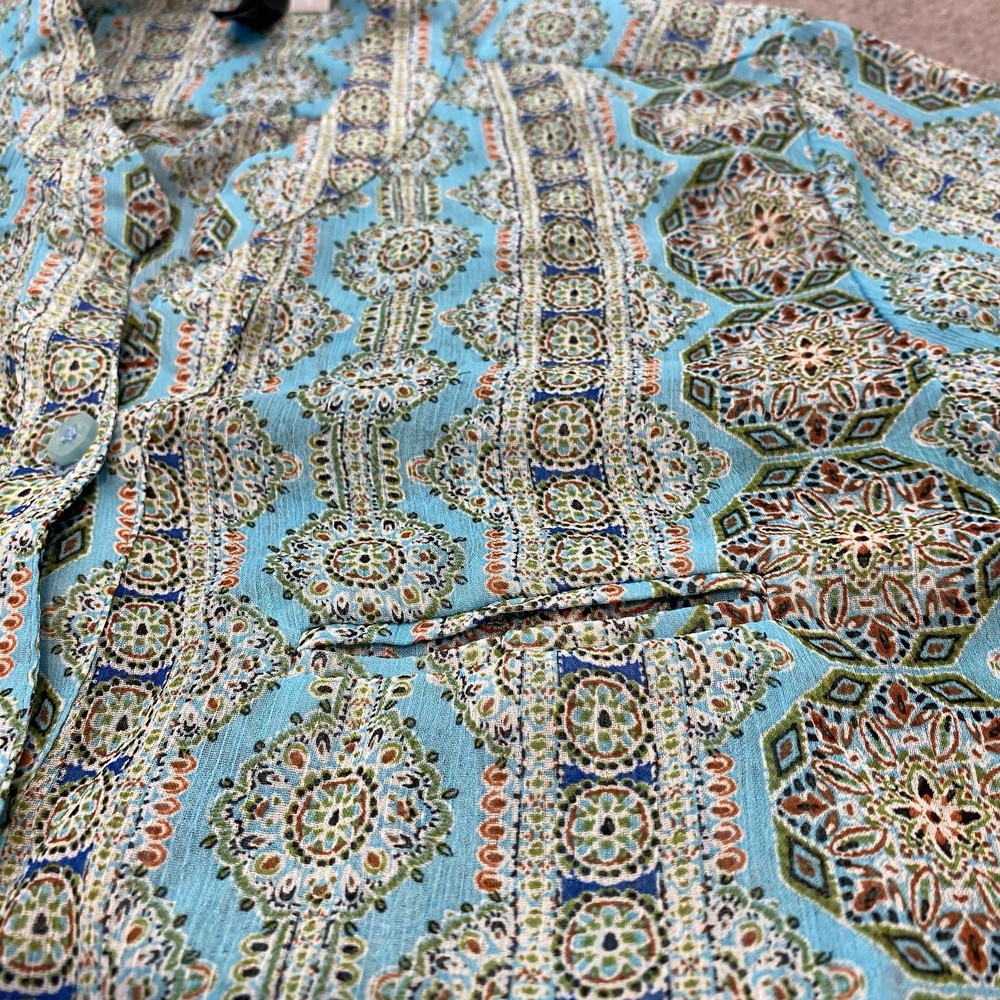KUT from the Kloth Shirt Womens Small Blue Geometric Print Button Up Long Sleeve Condition: Gently worn, no visible flaws Material: 100% polyester Features a striking blue geometric patterned print with green, white, and orange accents Button front closure with matching button cuffs and a single chest pocket Modern collarless neckline for a contemporary look Long sleeves with button-tab to convert to roll up Style #KT32138, RN#58539 Tag size: Small (Womens) - See provided garment measurements in images for best fit