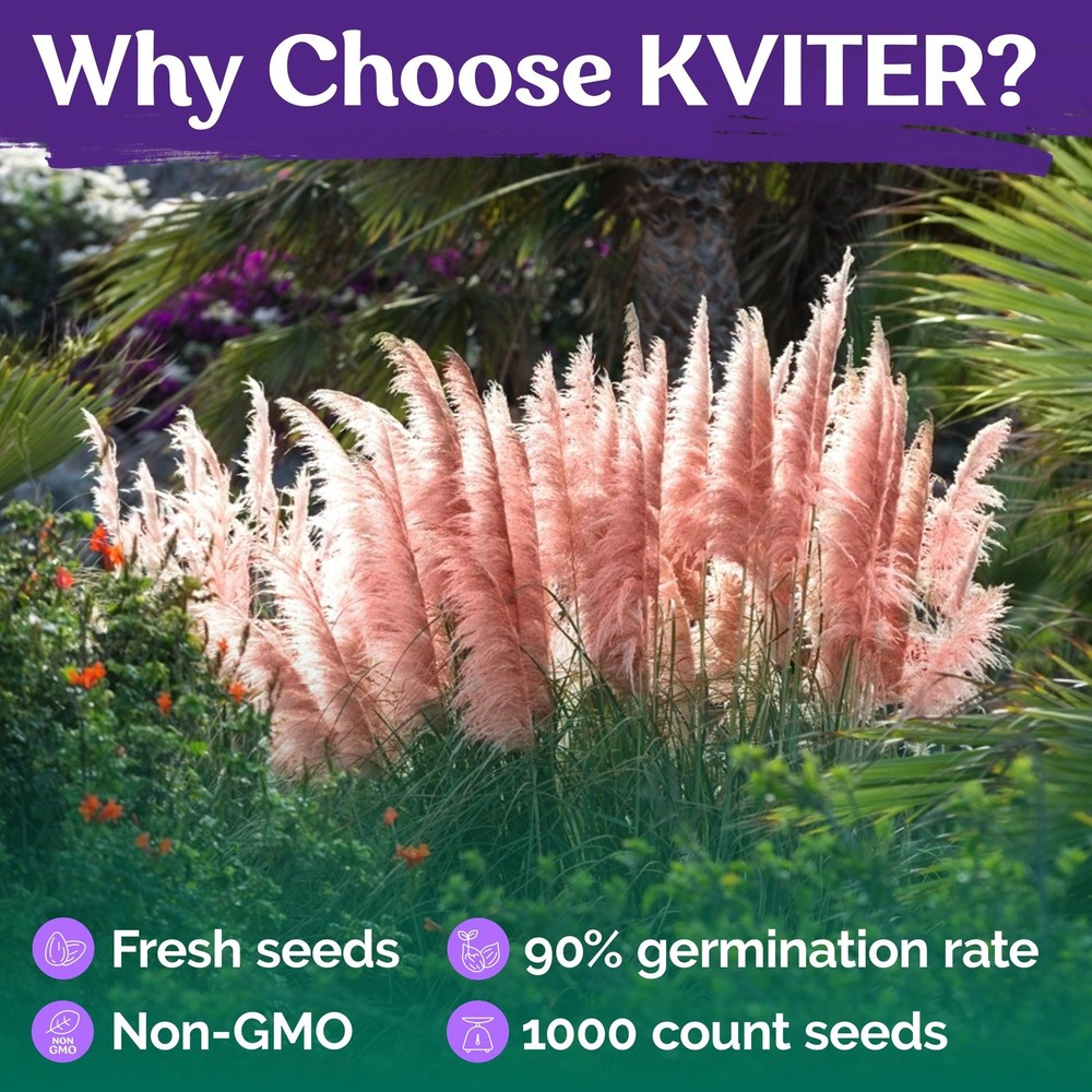 KVITER 100 Pink Pampas Grass (Cortaderia Selloana Rosea) Seeds, Ornamental Grass Seeds Heirloom, Hardy Pampas, - Ideal for Outdoor Perennial Plants, Garden Borders and Pampas Grass Decor Key Features: i High Germination Rate: These pink Pampas Grass Seeds for Planting, (Cortaderia Selloana seeds - Perennial Grass seeds) germinate in 14-21 days at 65-75 ° F, forming ornamental grasses. i Easy to Grow: Sow pink grass seed (perennial grass seed) 1/4 inch deep in full sun. Pampas grass seeds for planting outdoors yield lush ornamental grass plants in USDA zones 7-11. i Versatile Beauty: Decorative grass seeds produce blush pink pampas grass plants live with fluffy plumes, adding striking height of Pink pampas grass tall up to 7 ft and width of 4.9 ft. i Hardy & Adaptable: Hardy pampas grass - Pink Ornamental Grass, Tall Decorative Grass - flourish in varied soils. These outdoor perennial plants stand tough. i Lush Displays: Natural Pampas Grass Plants create lasting scenes in gardens or containers. Pink Dried Pampas Grass is used in Shelf Styling, Wall and Bedroom Decor. Product Description: Elevate your landscape with the elegant allure of pink pampas grass. With its stunning blush-toned plumes and graceful arching leaves, this perennial ornamental grass becomes a focal point in any outdoor setting. Perfect for gardeners seeking natural beauty, it offers season-long interest and flexible styling options, whether planted as a standalone specimen or used to enhance garden borders and screens. Growing to about 7.4 ft in height and spreading nearly 4.9 ft wide, this hardy selection suits a variety of climates and conditions. Adaptable and resilient, it thrives in full sun and well-drained soil, blending seamlessly with other garden flowers. If you're searching for the best grass seed for summer or fast growing grass seeds that can handle diverse conditions, consider pairing this ornamental showpiece with drought resistant grass seed or drought tolerant grass seed to maintain a lush, water-wise landscape. Planting seeds in late spring ensures a strong start, while proper care, like removing spent plumes and protecting young shoots-supports vigorous growth. For southern regions, where grass seed for southern lawns is essential, this choice easily adapts to warmer conditions. By incorporating grass seeds known for resilience, you can create a harmonious setting that remains green and vibrant, even through changing seasons. Whether you're reimagining an empty plot or enhancing a mature garden, these grass seeds add texture, movement, and visual intrigue. From best grass seed for summer strategies to achieving year-round beauty, pink pampas grass complements a range of planting plans. Its enduring presence and striking blooms make it a favorite among designers and home gardeners alike. Elevate your outdoor aesthetic and enjoy the lasting elegance this ornamental grass provides, proving that even the simplest additions can transform an entire landscape. We create products that preserve the purity of nature and brighten the world.