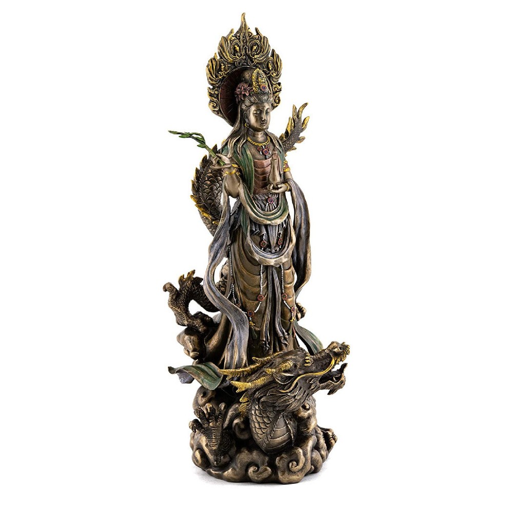 Kwan Yin on Dragon Statue Kwan Yin on Dragon Statue Click image to enlarge Description This is a cold cast resin statue of Kwan Yin - the Buddhist goddess of compassion and mercy - that is beautifully plated with bronze. It has exceptional detail and craftsmanship and is substantial with good weight. Details Condition: Brand New Design: Kwan Yin on Dragon Material: Resin & Bronze Plate Overall Size: Approx. 14" x 6" x 6" Size at Base: Approx. 4.5" x 4" Item Weight: 5 lbs, 4 oz Kwan Yin is beloved and worshiped in Buddhist communities worldwide for her unconditional love of humanity. Here she is seen riding upon a dragon as the 'Bodhisattva of the Southern Sea' and patroness of fisherman. SEE OUR ENTIRE SELECTION OF BEAUTIFUL KWAN YIN STATUES IN THE KWAN YIN SECTION OF OUR STORE. Shipping Shipping charges calculated to location. International Buyers International shipping charges are calculated to location in the 'Shipping and Payments' tab near the top of this page. Import duties, taxes, and charges are not included in the item price or shipping cost. These charges are the buyer's responsibility. Please check with your country's customs office to determine what these additional costs will be prior to bidding or buying. 'International First Class Mail' can take up to 6 business weeks for delivery depending on destination country, destination customs, and local or origin peak holiday shipping season. Faster 'International Priority Mail' shipping options are also available at checkout for most items. About Us The Tiny Dragon is a U.S. owned and operated 'e-retail' company. Our mission is to provide unique and affordable items of quality, promptly delivered to your complete satisfaction. Our items are shipped directly to you from our headquarters in beautiful Portland, Oregon USA. View our entire inventory at: At 'The Tiny Dragon' you are a valued customer and it is always our pleasure to serve you.