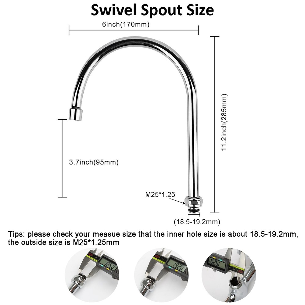 KWODE 6” Swivel Gooseneck Spout Replacement Kit for Commercial Kitchen Sink Faucet 360°Swing Spout with 2.2 GPM Nozzle Chrome(M25*1.25 Connector) ✅ Commercial Faucet Spout Replacement: 6 inch gooseneck swivel spout with swing nozzle is designed for all brand commercial kitchen faucet working on 1 or 2 bowls sinks.(Notice: faucet spout connector size is M25*1.25MM, its inner size is 18.5mm to 19.2mm before your making the order please confirm its size, Not for TS faucetor other 3/4 size faucet) ✅ 6 inch Swing Nozzle Spout: 6” spout reach, 11.2” spout height,it is the same quality with KWODE commercial faucet, most used for restaurant, industrial big hole prep & utility sink. ✅ 360°Spout Body: This faucet spout can be rotated 360 degree by hand, stainless steel constructed, chrome polished finish, make it long lifespan, easy to clean and maintain.durable and sturdy, no water leaking complains. ✅ Easy to Install and Remove: Max 2.2GPM, easy to install it, just remove the old one and install the new one less than 5 minutes by DIY installation. ( Tip: two gasket is already kept in connector side,just connect it no water tape at first.) ✅ Reliable Quality Spout: Just 6 inch faucet gooseneck spout only, no commercial faucet, 12 months replacement quality promise for this spout, any issue, please contact us from your order directly (the spout is good for KWODE, JZ,IM,MS commercial faucet, please make sure the connector size is M25*1.25MM(its inner size is 18.5mm to 19.2mm, before you making the order.) KWODE is a brand of professional commercial faucet, we sold not only commercial faucet but also commercial faucet replacement parts to meet all the customer requirements. Of course, we are very glad to customer give us some advice of their needs. According to different customer requirements, we sold different size swivel spout for commercial faucet, we have sold 6” 8”,10”, 12”, 14” add on swivel gooseneck spout, 90°Angle wall mount installation kit,38inch, 44 inch stainless flexible hose, black spray valve and pre-rinse hose with spray valve etc. Specification: Product Name: 6” Gooseneck Swivel Spout Spout Height: 11.2 inch Spout Reach: 6 inch Connector Size: M25*1.25mm(inner size is 18.5mm to 19.2mm) Material: Stainless Steel Finish: Polished Chrome Swivel Spout Function: This 6 inch swivel spout is a great replacement parts for commercial faucet working on 1 or 2 holes kitchen sink in home restaurant farmhouse industrial place. Customer Often Asking: Q1: How do I know it replace which brand commercial faucet? A1: Generally it just same the connector adapter that is OK. Such as COOLWEST, KWODE, JZ,IM, MST, MS, YG like these brand commercial faucet all can use this replacement spout. Q2: Is this use for 1 or 2 bowl sinks? A2: Yes, that is ok. But you should remember that the spout reach Max distance is 6 inch. Q3: How about the spout water flow? A3: 2.2GPM Package Included: 1 * 6 inch swivel spout with swing nozzle Shipping We offer FREE shipping on all orders! We ship within Three business days of payment, usually sooner. We use a selection of shipping services such as UPS, FedEx, USPS etc. We only ship to the lower 48 states, no APO/FPO addresses or PO Boxes allowed. Local pickups and combined shipping options are not provided at this time. Return You can return a product for up to 30 days from the date you purchased it. Any product you return must be in the same condition you received it and in the original packaging. Please keep the receipt. Feedback Customer satisfaction is very important to us. If you have any problem with your order, please contact us and we will do our best to make you satisfied. Contact Us If you have any queries, please contact us via ebay. We usually respond within 24 hours on weekdays. Please visit our eBay store to check out other items for sale! Thank you for shopping at our store.
