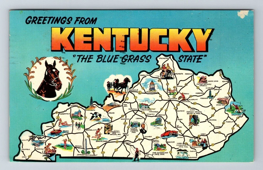 KY-Kentucky Scenic Map Greetings Landmarks Blue Grass State Vintage Postcard