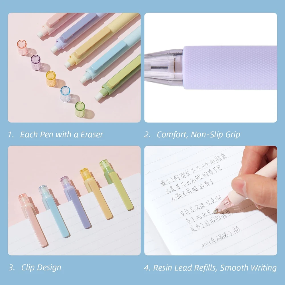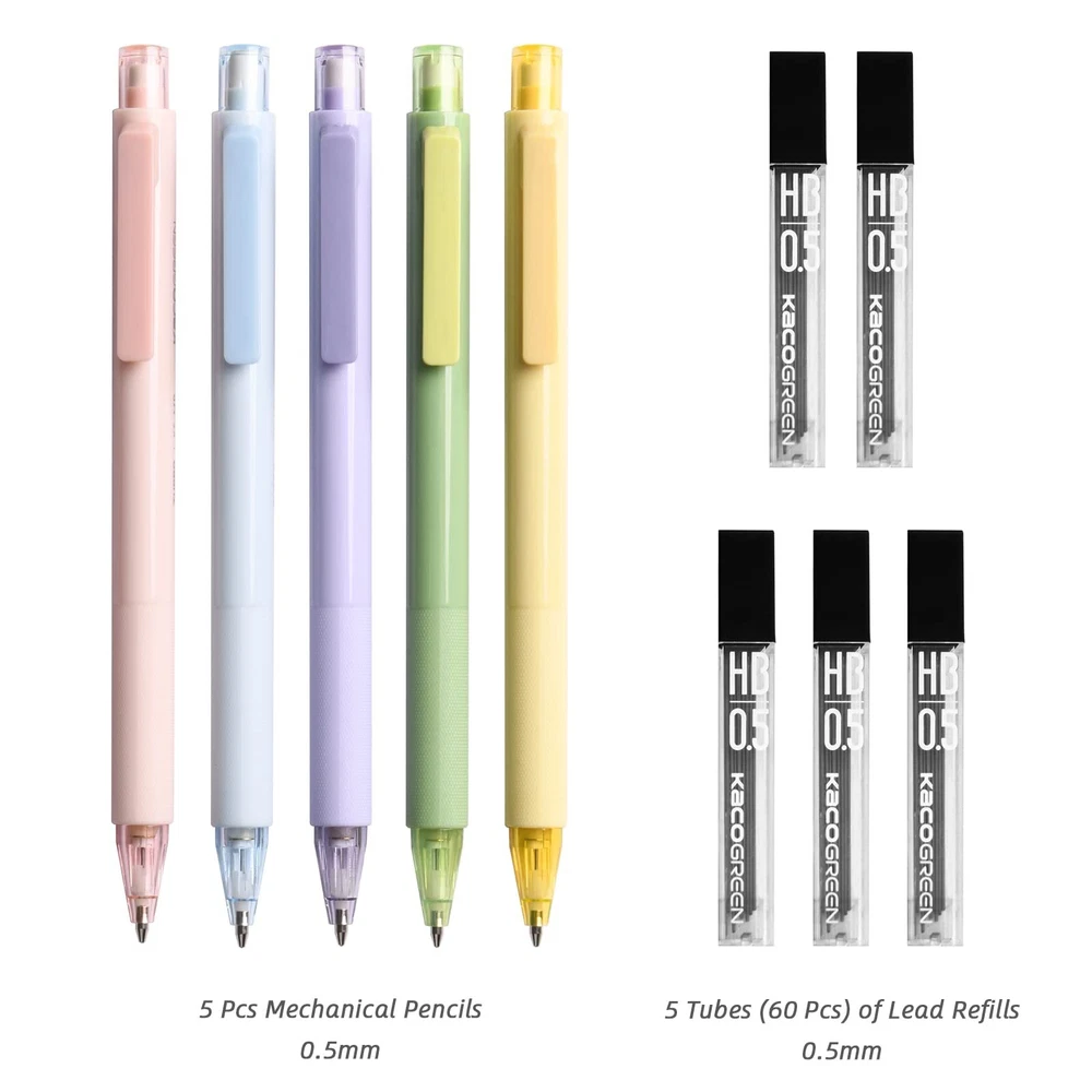 VIBRANT AND RICH COLORS: Makes a boring task fun with KACO pens PENCIL SETS: Including 5 pieces 0.5 mm mechanical pencils, 5 tubes lead refills and 5 pieces cap erasers WRITES SMOOTHLY: KACO cute mechanical pencils is made of resin, not easy to break and write smoothly COMFORTABLE TO HOLD: KACO pens with a lovely texture, good size and light weight PENS FOR NOTE TAKING AND DRAWING: Your choice for taking notes and drawing