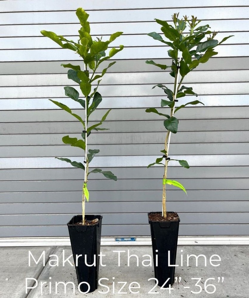 *** We ship this plant to the West Coast only during this time due to the cold weather. **** *** We do not ship this plant to FL due to the state regulations. *** Grown in a 4" x 12" or 5" x 12" pot, Primo size. Full-size, large edible leaves, and fruits; Fruit, rind, juice, and leaves are used in Thai, Laotian, Malaysian, and Cambodian cooking. Cut leaves in summer and store them in the freezer for your cooking all year round. Grafted semi-dwarf Thai Kaffir Lime tree is good for containers. They can be planted in the ground in zones 9-10. It should be the container plant for the other zones. Keep them outdoors from late May to October for the colder zones and put them indoors when the temperature is less than 40 degrees. 24" to 36" + trees, Pictures for reference only. The example of trees we currently ship as of July 2025 are shown in the pictures. Each plant is different in shape and size. Fragrant plants, and dark green leaves, smell good in delicious meals, and in your house. Some trees are fruiting Picture and content credit - itsnature.org The kaffir lime (Citrus Hystrix) is a rough, warty green fruit that has an exotic aroma and it is famously known for its double-shaped leaves, and both the fruit and its leaves are used for cooking to increase the scent of dishes. The leaves of this fruit are egg-shaped and its color is dark green on top but lighter green at the bottom. Kaffir limes have a lot of health benefits and are used to do more than just cooking. Some would opt to use kaffir lime for medicinal purposes. There are also cultures in certain countries that use the fruit for spiritual purposes. Kaffir lime can be found in Laos, Indonesia, Thailand, and Malaysia, and thus, they are mainly used in South-East Asian cuisines. In Thailand, the kaffir lime leaves are widely famous when cooking their famous delicacy dishes. Thai cooking uses leaves in Tom Kha (soup), Tom Yum (soup), Todman (shrimp or fish cake), Panang (curry), Chiang Mai Noddle, Chicken Satay, Prik-Khing curry, and some other curry dishes and hot-spicy stir-fried. It is also mainly used in Lao curry pastes and Malaysian and Burmese cuisines. The fruit and the leaves both bring out more zest into any cuisine and increase the scent as well. Many use the kaffir lime for spicy dishes as the taste and the smell could complement perfectly with spicy foods. Generally, kaffir lime contains many nutrition and health benefits. It contains tannin, triterpenoids, and saponin which are good for skin growth especially the leaves. Some use them for hair treatment and treatment for hair follicles. Combining with normal shampoo, people would just lather up their hair and massage their scalp in order for the lime extract would seep through the skin and repair the hair scalp which ultimately would cure the root of each strand of hair which will appear much shinier and healthier. The kaffir lime also cures coldness and lethargic and its bitter taste too can help with blood circulation.