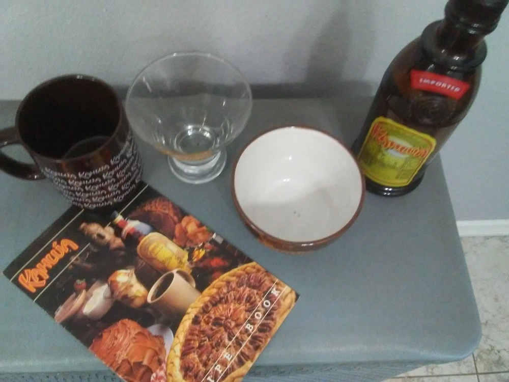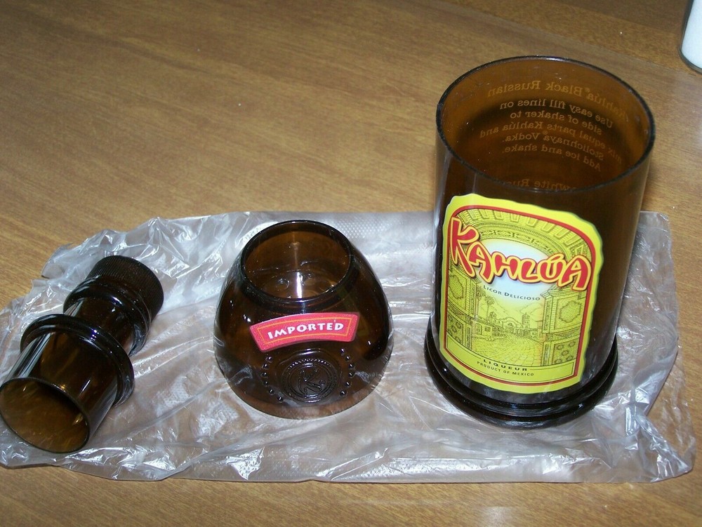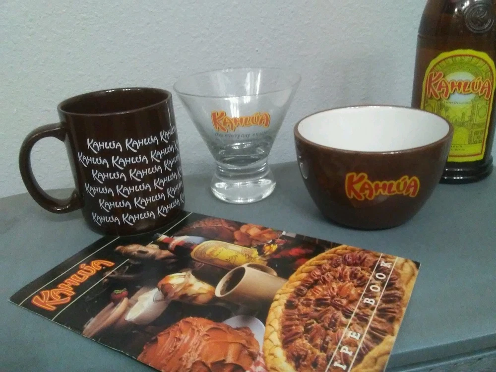1.Kahlua Brown Ceramic Rice Soup Bowl 4 1/4" Dia. Dishwasher and Microwave safe 2. nice hard plastic new cocktail shaker - nice addition to raffle basket or theme party or shake up your white Russian or kahula chilled. 3. Kahlua The Everyday Exotic Glass 4. Kahlua Coffee Mug - Kahlua White Letters Logo Cup - Brown Mug w/ White Lettering 5. very rare original 1980`s Kahlua recipe cook book 18 color pages 5 1/2 x 8 1/2 smoke free home, great condition !!! 5 great & rare items for any Kahlua fan !!!