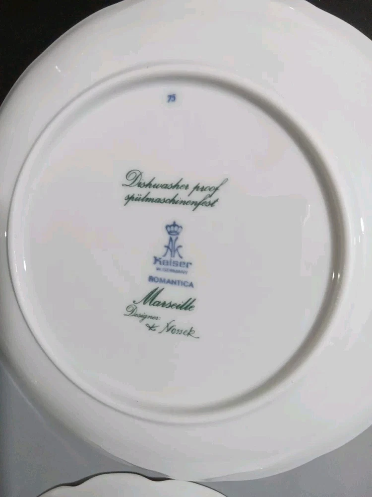 This set of eight Kaiser Marseille porcelain salad plates is a must-have for any collector or lover of fine dinnerware. Crafted in Germany, these plates boast exceptional quality and elegance. The plates measure 7.5 inches in diameter and feature a beautiful design that is sure to impress any guest. The brand Kaiser is known for its superior porcelain products, and this set of plates is no exception. They are perfect for any occasion, from a casual family dinner to a formal event. Add these plates to your collection today and elevate your dining experience.