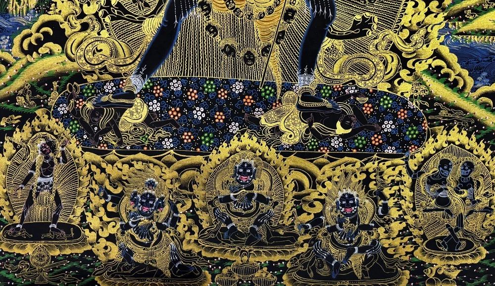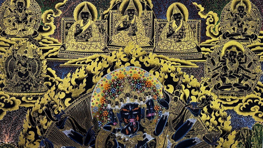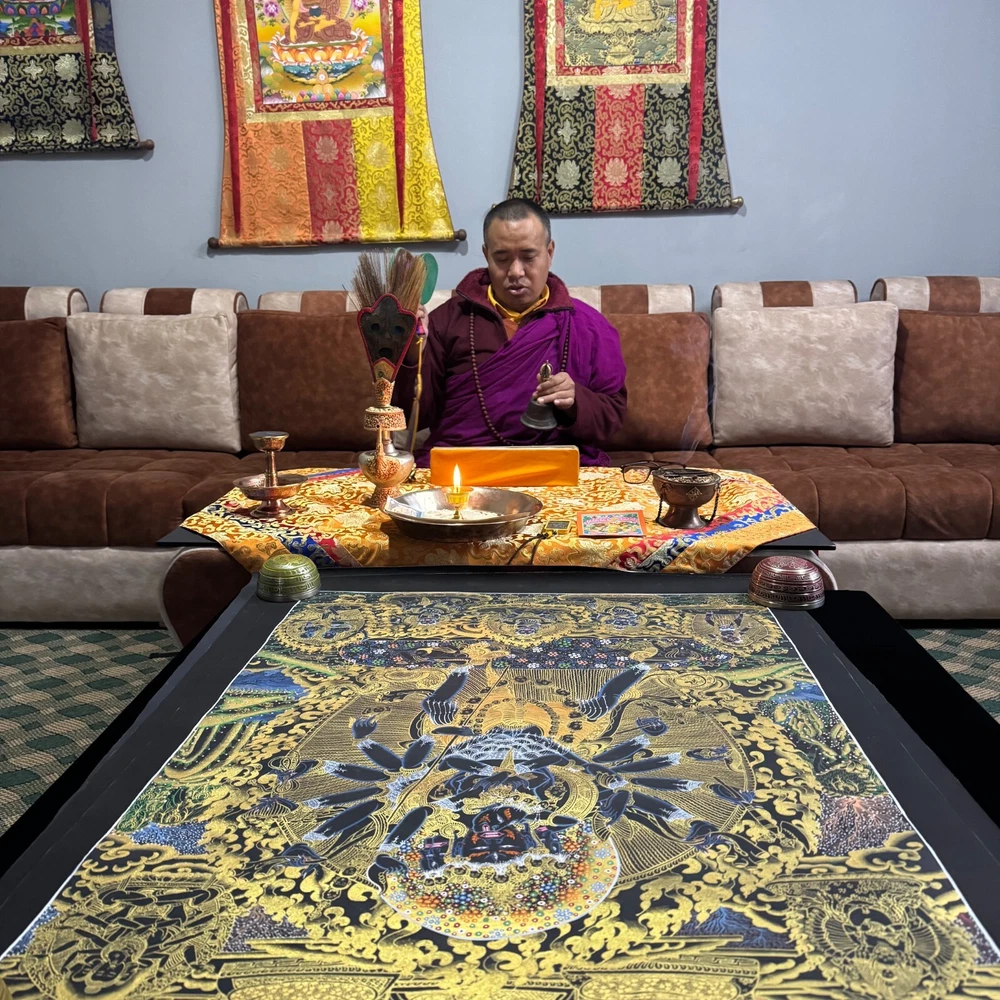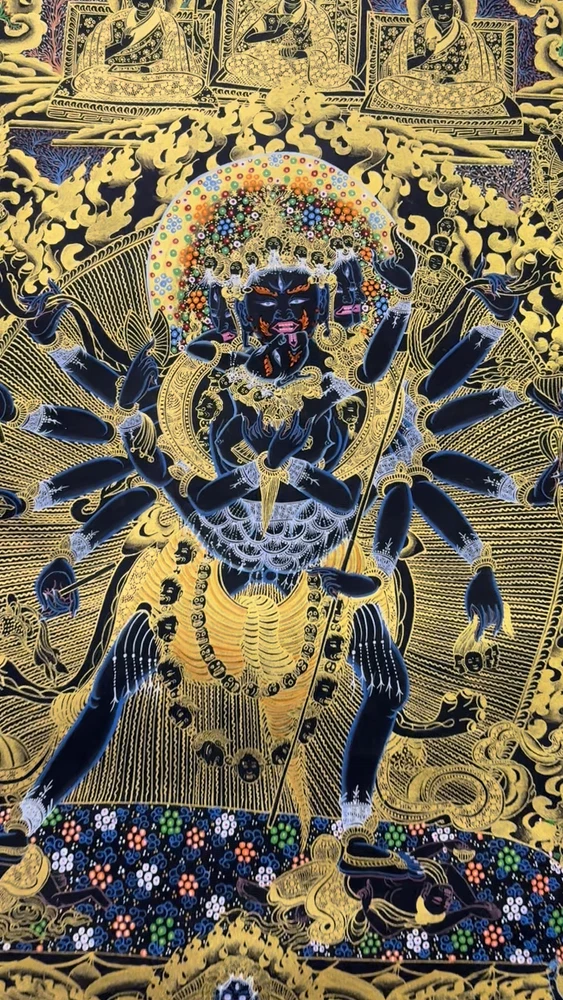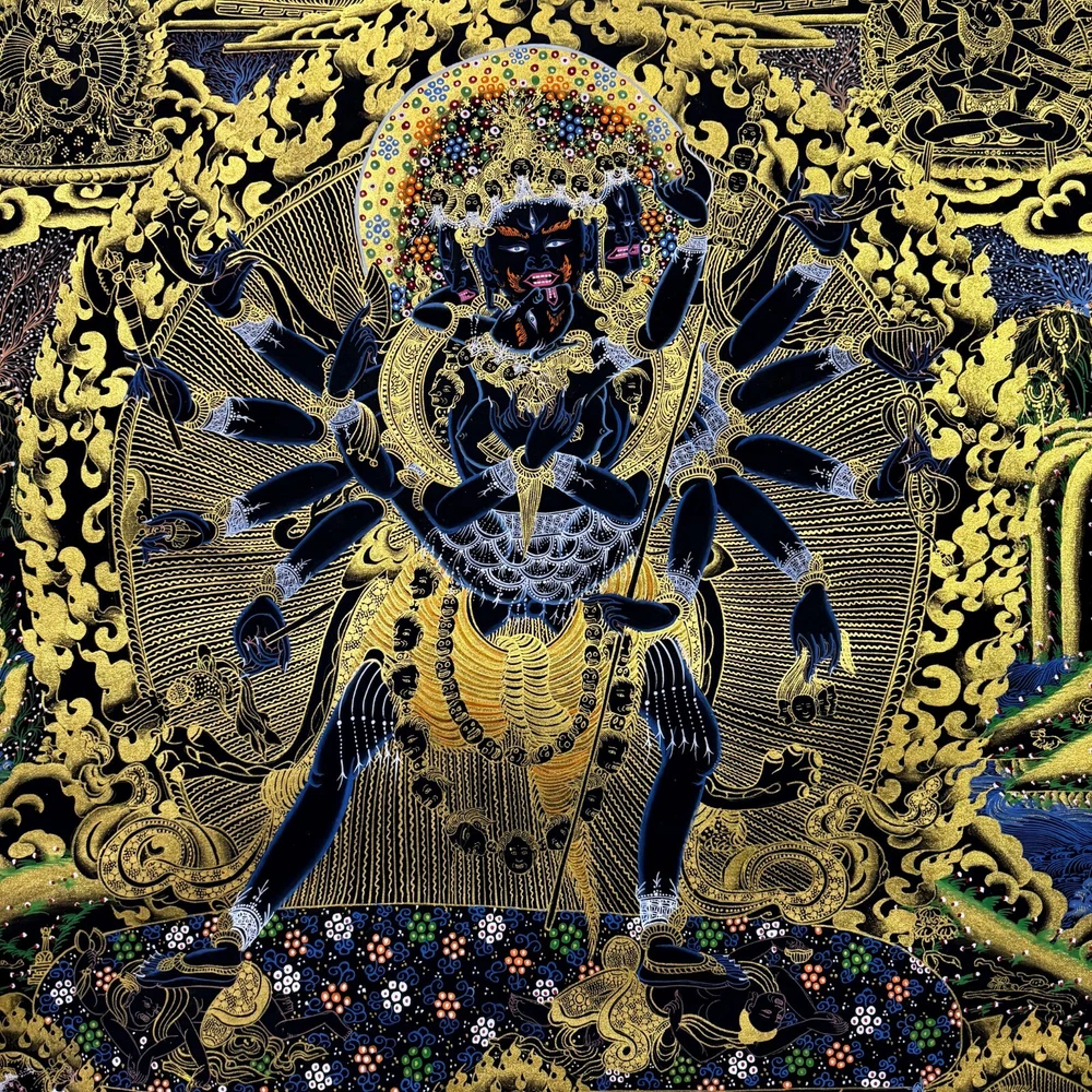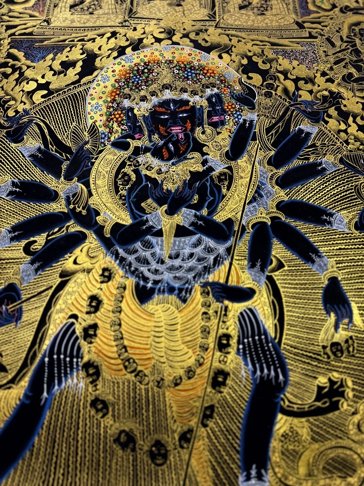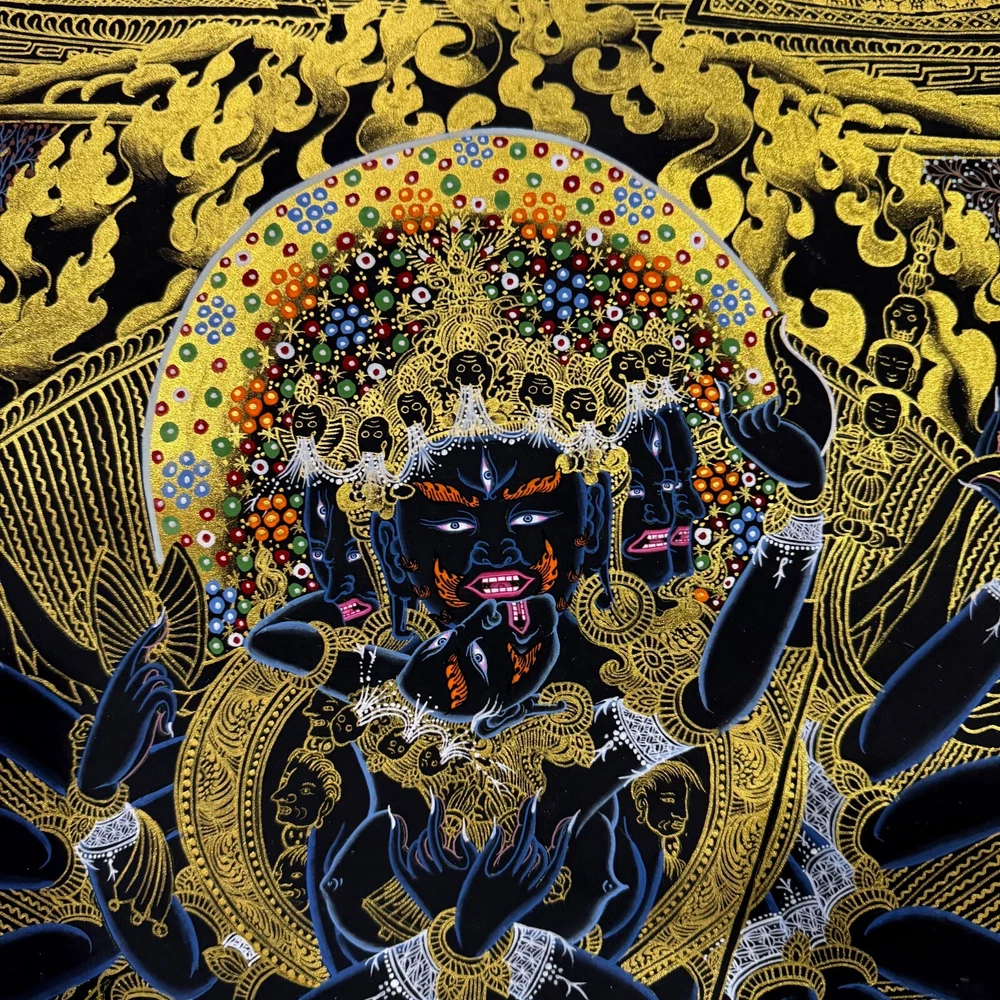 Namaste and Welcome to my Gallery!!! All of the paintings and arts in my gallery are originally handmade and hand-painted by my family members and other local artists who have been practicing their craft for over two decades. My father is Master Artists Nepal with an experience of more than four decades; you can see some of his work in this Gallery. Also you can see some of the beautiful and soulful artwork of talented local artists from Himalayas. ~~ Kalachakra Thangka Painting~~ Kalachakra is called as Pal Du Kyi Kor Lo in Tibetan. Kalachakra is a non-dual Tantra retrieved from the hidden kingdom of Shambala. kalachakra is semi wrathful in appearance, blue in color, he has four faces, twenty-four hands, and two legs. The main face is blue, right red left white and the back face is yellow. [Size = 101cm x 77cm] Material Used: • Cotton Canvas • Natural Pigments and colors • Gold leaf ~Excellent for meditation or home/office decor, ~Tibetan Yoga Wall Art ~Genuine 100% hand-painted from Himalayas Please feel free to contact me if you have any question regarding the painting.