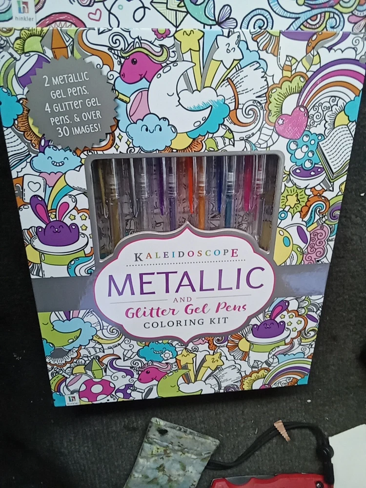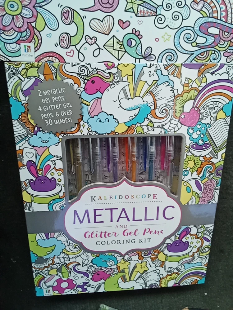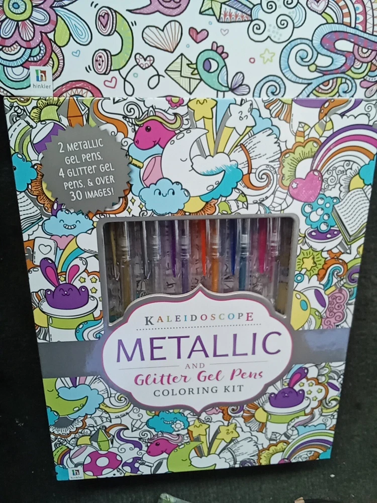 The Kaleidoscope Metallic And Glitter Gel Pens Coloring Kit includes 2 gel pens with a metallic finish in a variety of multicolor shades. These pens are ideal for crafts and art projects, providing a vibrant and shimmering effect on paper. The kaleidoscope design adds a unique touch to your drawings and lettering, making it a fun and creative addition to your art supplies collection.