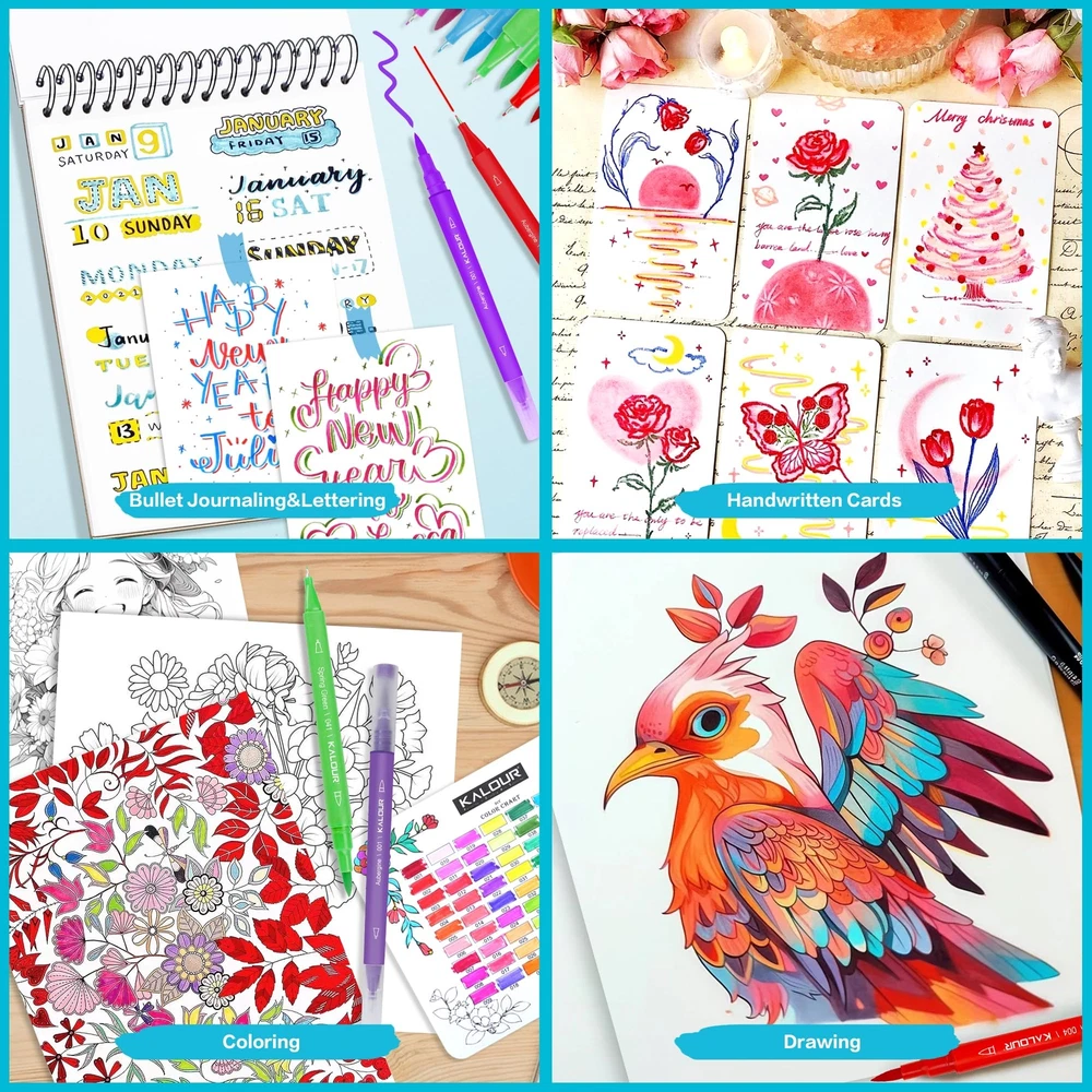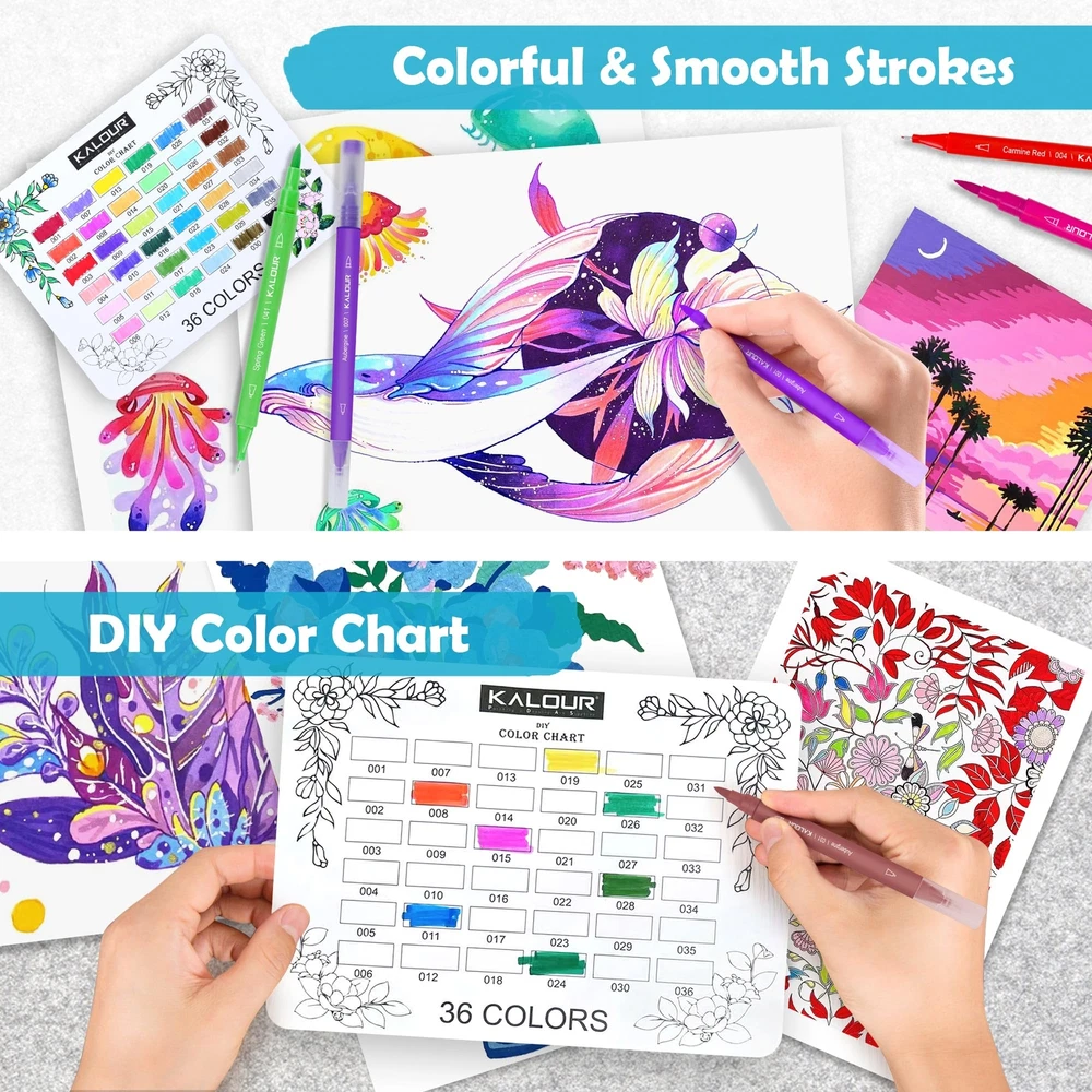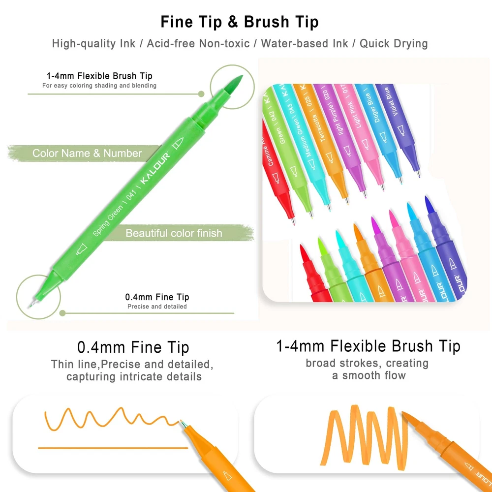 Kalour Dual Markers Brush Pens, 36 Fine Point Art Marker, Double Tip Colored Pen for Adult Coloring Hand Lettering Writing Planner 36 VIBRANT COLORS:Explore a rich palette of 36 vibrant colors, providing endless possibilities for your artistic creations.Ideal for a multitude of artistic pursuits:Hand Lettering,Coloring Books,Signing,Design,Art Projects,Planning & Journaling,Manga & Animation. BRUSH & FINE POINT DUAL TIPS:Experience the versatility of dual tips – BRUSH for sweeping strokes and blending, FINE POINT for intricate details like sketching and writing. COLOR NAME & NUMBERED:Effortlessly find your desired color with color name and numbered markers. The included DIY color chart allows you to match each marker to its corresponding block for easy reference during your creative process. SMOOTH FLOW, HIGH-QUALITY INK:Enjoy the benefits of high-quality water-based ink that flows smoothly. The ink's vibrant colors seamlessly blend, providing beautiful and consistent coloring effects without smudges. MULTIFUNCTIONAL & SUITABLE FOR ALL AGES:Ideal for various artistic pursuits such as drawing, lettering, coloring books, and sketching. Perfect for individuals of all ages, making it an excellent gift for artists, students, and creative enthusiasts. PORTABLE CASE:Housed in a case, these markers are perfect for creativity on the go. The organized case ensures that your vibrant, no-bleed markers are always at your fingertips.