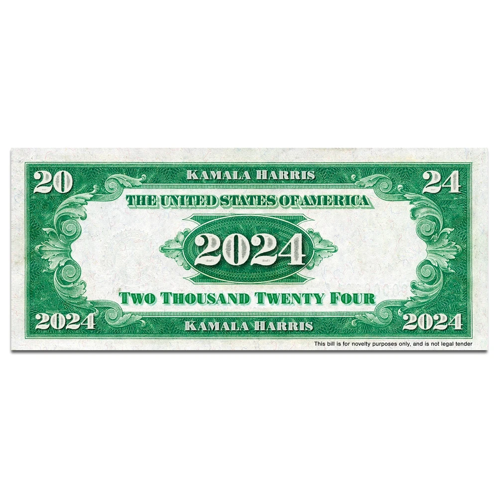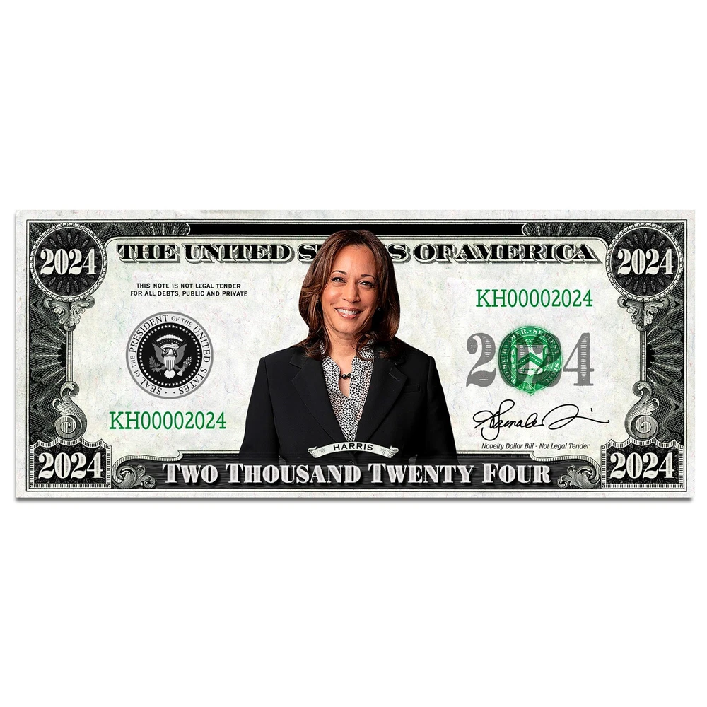 This $2024 Dollar Bill commemorates Vice President (and 2024 Presidential Candidate) Kamala Harris! This novelty collectible is proudly made in the United States of America , and is printed double sided in full color on premium cardstock , unlike most novelty bills you see here on eBay. Perfect to display on your desk, mantel, bookshelf...or as a gift for the Democrat and Kamala Harris fan in your life! Features: - Printed in high resolution on premium professional cardstock (unlike most novelty eBay bills) - Replica signature of Kamala Harris - Comes with flexible acrylic display sleeve at no extra cost - Proudly Made in America - Bill is marked "Not Legal Tender" on both sides; this is for novelty purposes only . Your bill will ship in a clear plastic display at no extra cost. All our trading cards and dollar bills are proudly made in the United States of America.