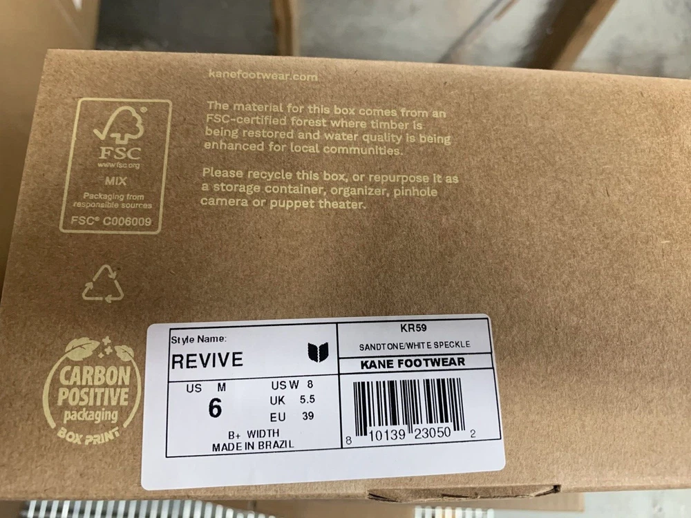 Brand new with box Men's size 6, Women's size 8 All sales are final, no returns Fast shipping! KANE Revive shoes are made of bio-based closed-cell RestoreFoam™. The shoes don’t absorb moisture, so they’re just as functional in water as they are on land, and they’re quick-drying. The KANE Revive shoes can easily be wiped or washed off with soap and water. Please avoid exposure to extreme heat or sun for this can cause the shoes to shrink or warp. Dishwashers, washing machines, or hot cars can also cause the shoes to shrink or warp. The KANE Revive sizing follows the standard sizing for a running shoe. Therefore, the size guide should be utilized according to your typical running shoe size. IN BETWEEN SIZES? We recommend sizing down (ex. if you typically wear size 10.5 - select size 10). For a wider foot, go one half size up (ex. if you typically wear size 10.5 - select size 11).
