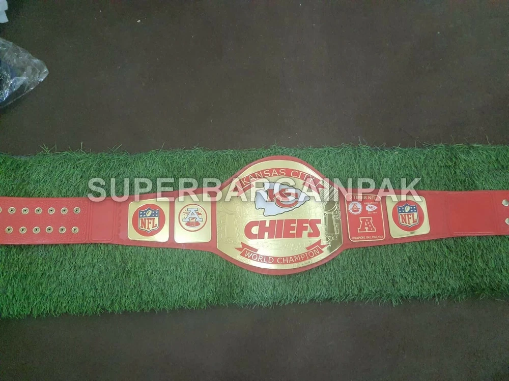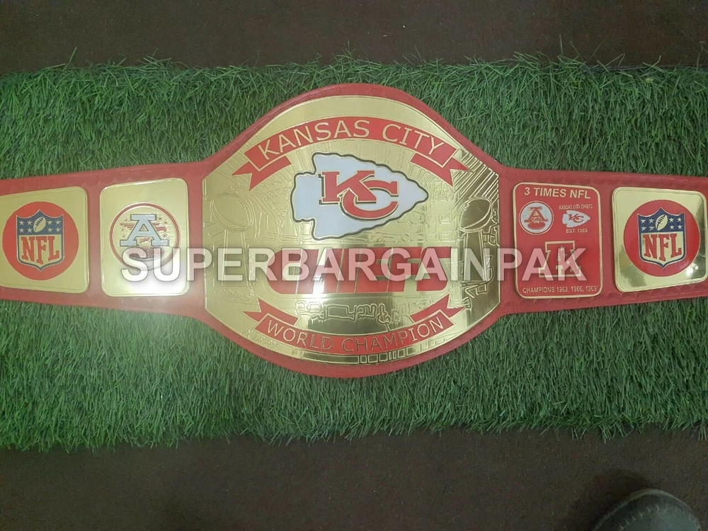 Welcome to our shop ------------------------------------------- We are specialist in manufacturing handmade products:: Our wide range of products include: >>>>Championship Belts WWE | WWF | AEW | UFC | WBC | WCW Product Description ** Kansas City Chiefs championship belt *** Plate Metal: Brass (Zinc available on request with additional cost) Strap: 100% Leather Largest Waist Size: Fits upto 46'' Belt Length: ~50" Weight: 4.17 lbs | 2.01 Kg Plate Thickness: 2mm (4mm Version available on demand with additional cost) ::The belt is well crafted and manufactured to meet the quality demands of fans:: Get your hands on this marvelous piece now! Note: If you need further details kindly inbox us, we will try to be as responsive as possible. ------------------------------------------- Return Policy: Generally we don't have much complains on our products and we make sure to 100% satisfy our clients. We send the product in well Bubble Wrapped packaging so there is highly unlike chance of getting damaged item. In case there is a damage, we will try to give partial refund or you can ask for full refund within 30 days after returning the belt to origin. NOTE: 1. If you have placed the order by mistake or you have purchased a wrong item then we are not going to refund that. 2. Buyer will pay the shipping fee of returning the belt. ------------------------------------------- Happy Shopping! :)