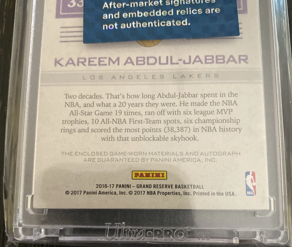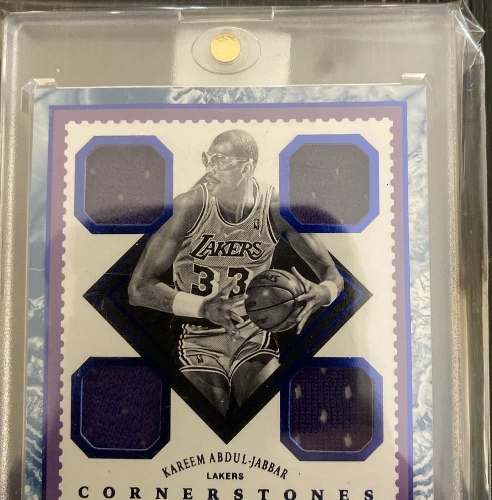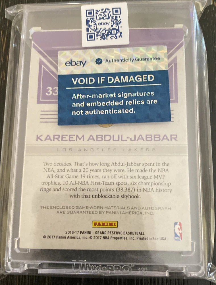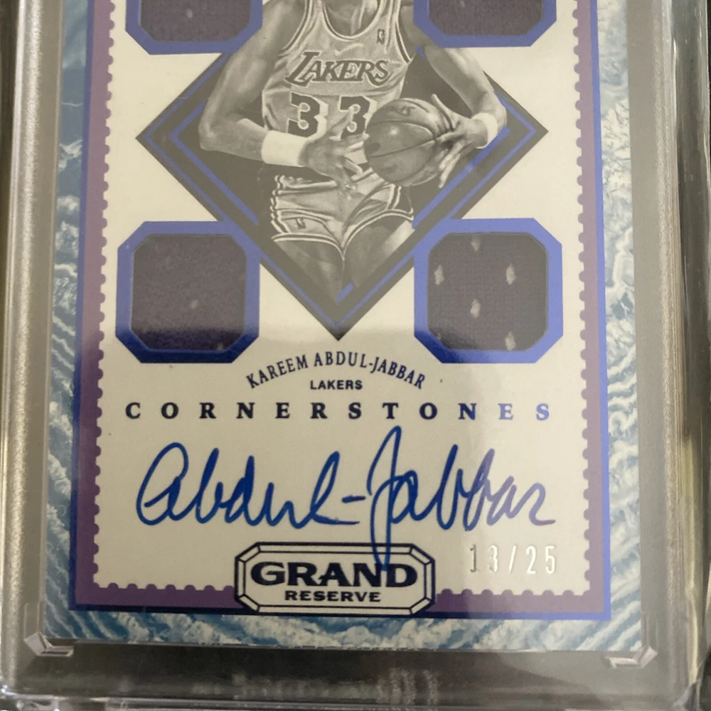 Elevate your collection with the Kareem Abdul-Jabbar 13/25 Patch Auto card from the 2016-17 Panini Grand Reserve Cornerstones series. This exclusive collectible features a piece of memorabilia that showcases the legend of basketball himself, from the Los Angeles Lakers' storied past. The card is serial numbered, indicating its limited edition status, and is further enhanced by an authentic autograph from Abdul-Jabbar. Panini's craftsmanship shines through with this high-quality piece, making it a must-have for fans and collectors alike. The card belongs to a set renowned for its exceptional design and the inclusion of notable athletes, ensuring its place as a treasured keepsake. Whether for display or as a cornerstone of your collection, this card captures a slice of NBA history. This card has already been through the authentication procedure by EBay so you know it’s legit.