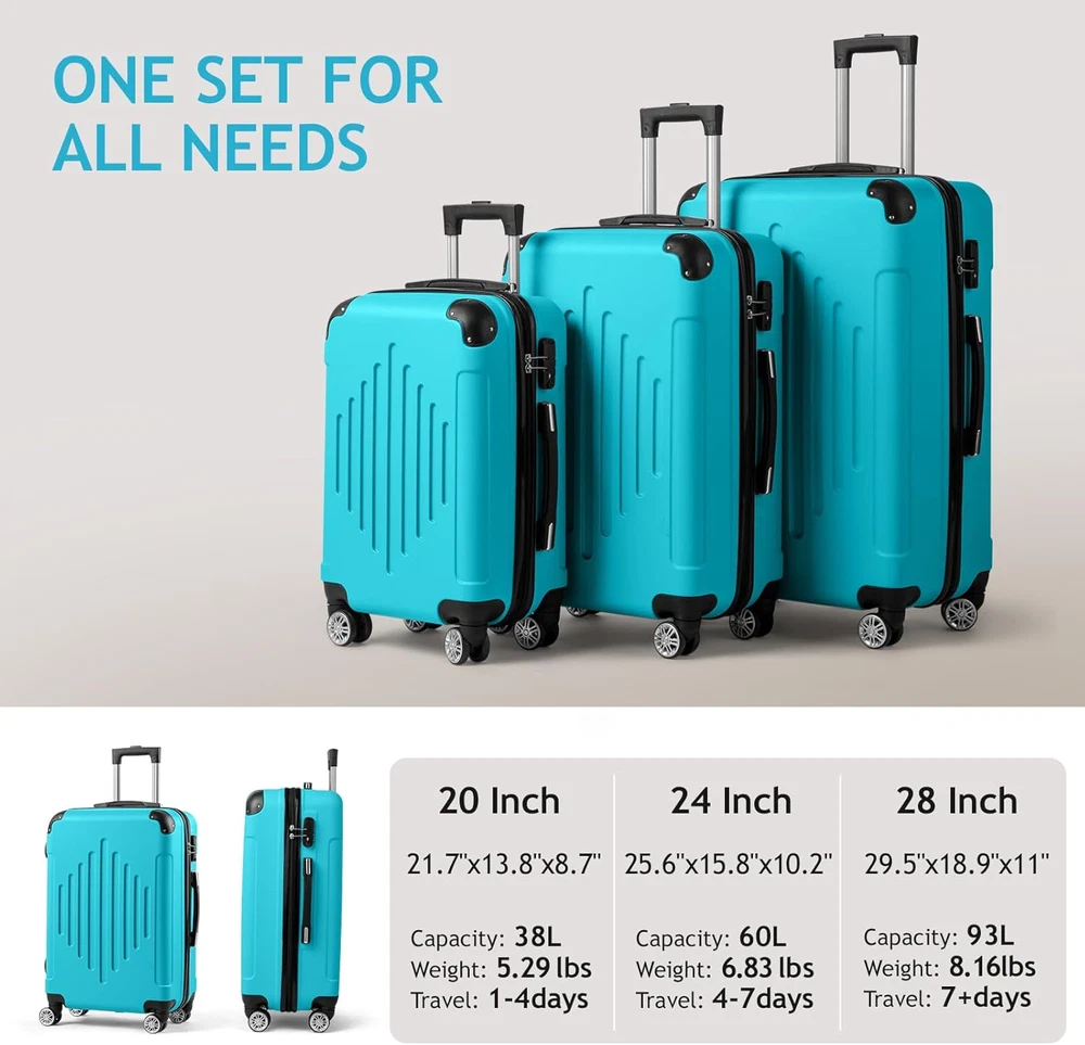Store New Arrivals Add to Favorite View Feedback Contact Karl Home Luggage Set 3 Piece Suitcase Sets with TSA Lock Moulded Corner 4 Spinner Wheels, ABS Hardside Trolley Travel Case for Carry on Check-In Business Trip, Sky Blue 20" 24" 28" Description Color Sky Blue Product Dimensions 11 x 18.9 x 29.5 inches Country of Origin China Item Weight 23.36 Pounds Department Unisex Adult Manufacturer Karl home 【TSA Lock】Features a TSA combination lock on the side, ensuring your belongings are safe and secure during your travels. Additionally, 4 molded side feet that allow you to store it upright when needed 【Effortless Mobility】This luggage set offers smooth maneuverability with 4 360° silent sliding rollers and a retractable handle. An additional side handle ensures easy lifting and hassle-free travel 【Organized & Spacious】With two large compartments, a mesh zippered compartment, and cross straps, our luggage set provides ample storage and organization for your clothes, shoes, and other essentials 【Durable Materials】Crafted from sturdy ABS material with 2 molded corners and a black full liner, our luggage set is resistant to scratches, pressure, and water. It's also lightweight and easy to clean, making it a practical choice for all your travel needs 【Demision】Here are the dimensions for each size of the luggage set: - 20 inch: 21.7" x 13.8" x 8.7", 38L, 5.29lbs, for 1-4 days travel - 24 inch: 25.6" x 15.8" x 10.2", 60L, 6.83lbs, for 4-7 days travel - 28 inch: 29.5" x 18.9" x 11", 93L, 8.16lbs, for 7+ days travel Product Description Karl home 3-Piece Luggage Set Material: ABS Caster Diameter: 1.97" 20 inch : 21.7" x 13.8" x 8.7", 38L, 5.29lbs, for 1-4 days travel 24 inch : 25.6" x 15.8" x 10.2", 60L, 6.83lbs, for 4-7 days travel 28 inch : 29.5" x 18.9" x 11" , 93L, 8.16lbs, for 7+ days travel More Choices Add to Cart Add to Cart Add to Cart Add to Cart Add to Cart Add to Cart Add to Cart Customer Reviews 3.8 out of 5 stars 601 3.9 out of 5 stars 1,273 3.8 out of 5 stars 601 3.8 out of 5 stars 601 3.6 out of 5 stars 137 3.6 out of 5 stars 137 3.6 out of 5 stars 137 Price $99.99 $ 99 . 99 $99.99 $ 99 . 99 $95.99 $ 95 . 99 $99.99 $ 99 . 99 $69.99 $ 69 . 99 $65.99 $ 65 . 99 $99.99 $ 99 . 99 TSA Lock ✔ ✔ ✔ ✔ ✔ ✔ ✔ Double Spinner Wheels ✔ ✔ ✔ ✔ ✔ ✔ ✔ Material ABS ABS ABS ABS ABS ABS ABS Color Black Grey Rose Gold Orange Blue Purple Purple Size 20"24"28" 20"24"28" 20"24"28" 20"24"28" 20"24"28" 20"24"28" 16"20"24"28" Number of Pieces 3 3 3 3 3 3 4 ABOUT US We offer the best prices around on high quality products. Our E-store includes media such as books, movies, music and games while offering electronics, toys, sporting apparel, clothing, tools, general home, garden items and more. SHIPPING We are always working hard to ensure your package arrives as soon as possible. Please understand that some factors like weather, high postal traffic, and the performance of shipping companies are outside of our control. We offer free shipping to the lower 48 states and ship within 2 business days of payment, usually sooner. We do not accept P.O. Boxes. Please provide a physical address. RETURNS We offer a 30-Day Return Policy on items which you are not completely satisfied with. You have the option for a full-refund or an exchange of the item. No returns are available on items shipped outside of the USA. PAYMENT We accept PayPal. CONTACT US This page content is yet to come Please ad us to your favorite seller and visit again later Thank You CUSTOMER SATISFACTION We try our very best to make sure every customer is completely satisfied. If there's a problem, message us! We're happy to help.