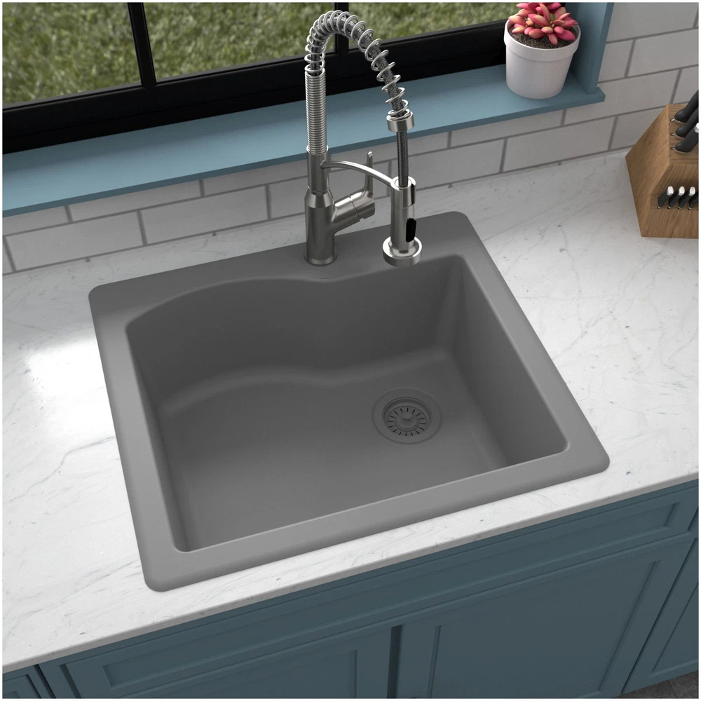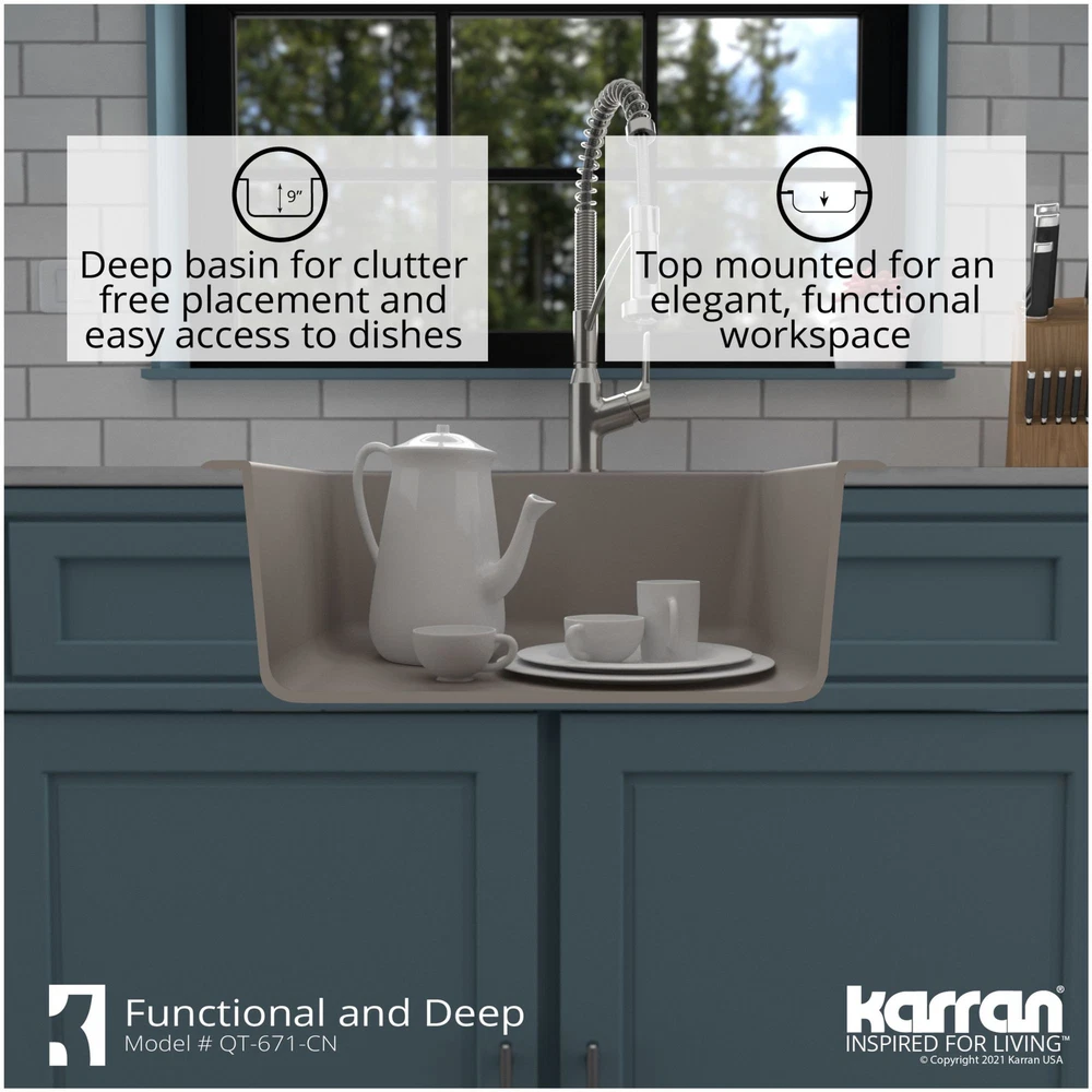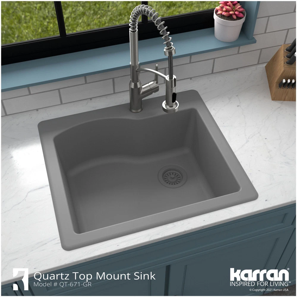 Powered by Frooition All Categories Karran USA QT-671 Quartz QT 25" Drop In Single Basin Quartz Composite Kitchen Sink Overview Item Description With its spacious single bowl, this design is both practical and elegant. Karran quartz composite sinks are extremely durable and are engineered to stand up to the toughest daily kitchen tasks. Karran QT-671 Features: Covered under Karran's 25 year limited warranty Constructed of quartz composite Drop In installation – sink will drop into a cutout in the countertop Single basin design for maximum work space Sound absorbent construction to prevent dish clatter and under cabinet condensation Sink comes pre-drilled with one faucet hole for use with a single hole faucet Right rear drain location increases available space under the sink All mounting hardware required for assembly is included Karran QT-671 Specifications: Sink Length: 25" (left to right) Sink Width: 22" (front to back) Sink Height: 9" (top to bottom) Basin Dimensions: 21-3/8" L x 17-7/8" W x 8-3/4" D Faucet Holes: 1 Minimum Cabinet Size: 27" Drain Connection: 3-1/2" Why Choose BuildInc? OUR PROMISE TO YOU About Us At Build, we promise to provide the best selection we can, most competitive pricing, and unmatched customer service. Our store has quality home improvement products from trusted manufacturers like Moen, American Standard, Delta, Kraus, Kichler, Progress Lighting, Schlage, Kwikset, Baldwin, Broan, NuTone, Air King, and Rev-A-Shelf. With over 200,000 home improvement products for you to choose from, we have just what you need to get your project done. Fast & Free Shipping We promise to make it our priority to get you your items as fast as we can. We ship from 440 warehouses around the country, ensuring that your product will get to you as soon as possible. We know you're eager to get your hands on your new purchase, we would be too. As a bonus, most items ship for free. Returns We are happy to accept returns of unused or defective items for a refund within 30 days from the date of delivery. For returns outside 30 days, please contact our Customer Service team to go over our options. For full details, please view the Shipping and Payments tab above. To initiate a return simply go to the eBay Returns Portal and submit a return request. We ask that all items be returned with all original components via a traceable method. Once your return is received and processed, we will quickly get your refund or replacement issued. If for any reason you are unsatisfied with your purchase or for product or warranty questions, please contact Customer Service team for assistance. More Items! View more great items! About Us | Shipping | Returns | Contact Us | FAQ | Collections | Special Offers! Powered by Frooition Frooition Frooition | No-js Template | eBay design, eBay store design, eBay shop design, eBay template design, eBay listing design (ver:froo_no_js) This listing is currently undergoing maintenance, we apologize for any inconvenience caused.
