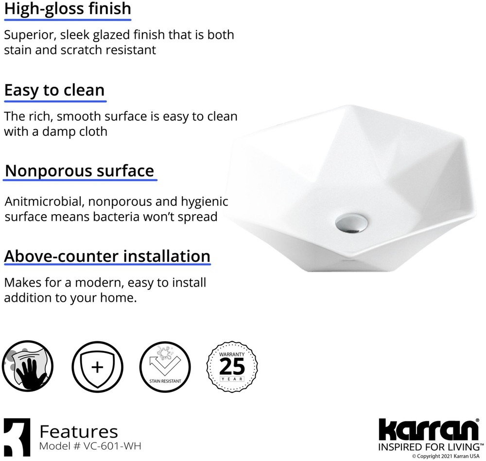 Powered by Frooition Top Products Kitchen Bathroom Lighting Fans Hardware Decor & Organization Karran USA VC-601 Valera 18-3/4" Hexagonal Vitreous China Vessel Bathroom Sink Overview Item Description Karran's Valera Collection comprises a wide array of elegant models that include undermount sinks, top mount sinks. and vessel sinks. These vitreous China bathroom sinks feature a durable double glaze that is stain, scratch, and scuff resistant. All models in the Valera Collection are easy to clean and care for. Consider them the perfect choice for any residential or commercial bathroom project. Pair your Valera sink with a Karran bathroom faucet. Shorter faucets are suitable for undermount and top mount sinks. Select a taller faucet for all vessel sink installations. Karran USA VC-601 Features: Covered under Karran's 25 year limited warranty Constructed of vitreous China Coordinates with products from the Valera line Vessel installation Center drain location provides optimal draining capability Overflow not included ADA compliant Karran VC-601 Specifications: Overall Length: 18-3/4" (left to right of sink) Overall Width: 16-3/8" (front to back of sink) Overall Height: 5-1/8" (top to bottom of sink) Basin Length: 17-3/4" (left to right of basin) Basin Width: 15-3/8" (front to back of basin) Basin Depth: 4" (top to bottom of basin) Drain Connection Size: 1-3/4" Number of Faucet Holes: 0 Minimum Cabinet Size: 21" Why Choose BuildInc? OUR PROMISE TO YOU About Us At Build, we promise to provide the best selection we can, most competitive pricing, and unmatched customer service. Our store has quality home improvement products from trusted manufacturers like Moen, American Standard, Delta, Kraus, Kichler, Progress Lighting, Schlage, Kwikset, Baldwin, Broan, NuTone, Air King, and Rev-A-Shelf. With over 200,000 home improvement products for you to choose from, we have just what you need to get your project done. Fast & Free Shipping We promise to make it our priority to get you your items as fast as we can. We ship from 440 warehouses around the country, ensuring that your product will get to you as soon as possible. We know you're eager to get your hands on your new purchase, we would be too. As a bonus, most items ship for free. Returns We are happy to accept returns of unused or defective items for a refund within 30 days from the date of delivery. For returns outside 30 days, please contact our Customer Service team to go over our options. For full details, please view the Shipping and Payments tab above. To initiate a return simply go to the eBay Returns Portal and submit a return request. We ask that all items be returned with all original components via a traceable method. Once your return is received and processed, we will quickly get your refund or replacement issued. If for any reason you are unsatisfied with your purchase or for product or warranty questions, please contact Customer Service team for assistance. More Items! View more great items Karran USA SQS200 Sternhagen 21-1/2" Rectangular Quartz Composite $299.00 Karran USA VC-506 Valera 24-1/4" Rectangular Vitreous China - White $170.00 Karran USA QM172 Quattro Matte 18" Rectangular Acrylic Vessel - White $140.28 Karran USA VC-428 Valera 18-1/4" Circular Vitreous China Vessel - White $145.83 About Us | Shipping | Returns | Contact Us | FAQ | Collections | Special Offers! Powered by Frooition Frooition Frooition | No-js Template | eBay design, eBay store design, eBay shop design, eBay template design, eBay listing design (ver:froo_no_js) This listing is currently undergoing maintenance, we apologize for any inconvenience caused.