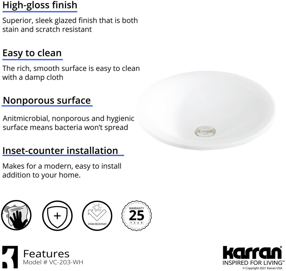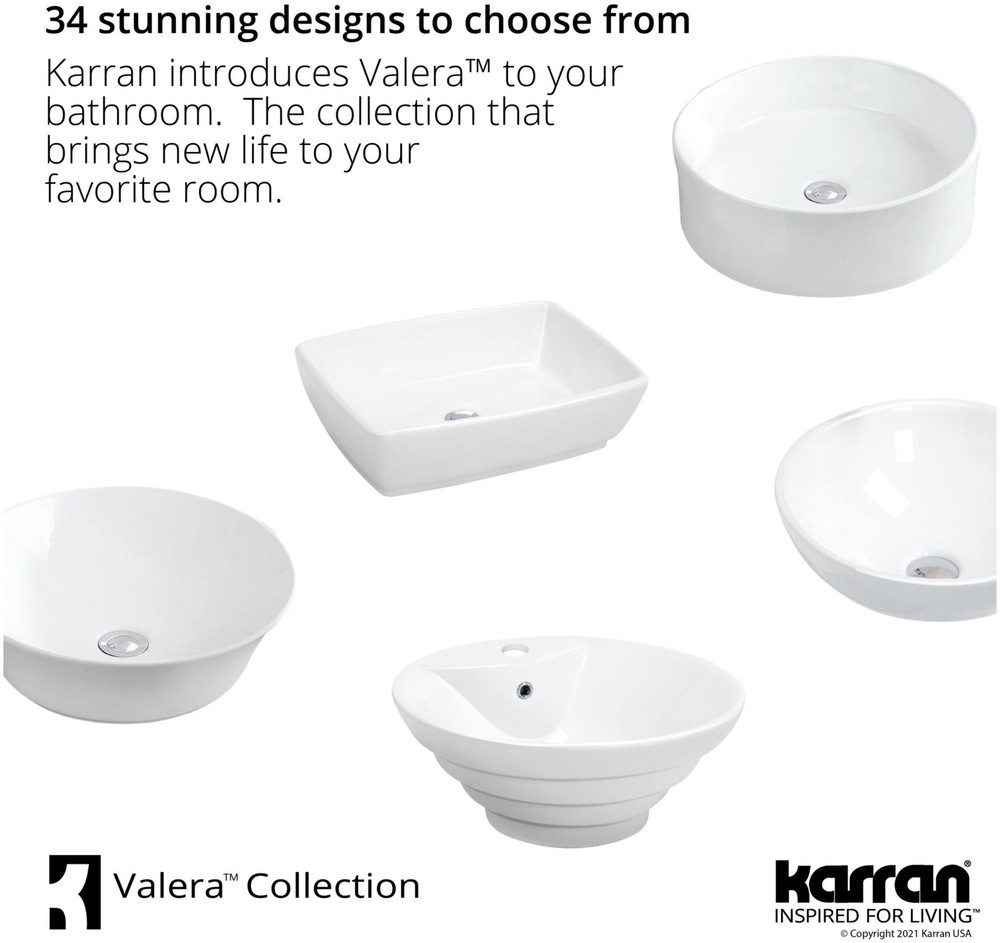 Powered by Frooition All Categories Karran USA VC-203 Valera 17-3/4" Circular Vitreous China Drop In Bathroom Sink Overview Item Description Karran's Valera Collection comprises a wide array of elegant models that include undermount sinks, top mount sinks. and vessel sinks. These vitreous China bathroom sinks feature a durable double glaze that is stain, scratch, and scuff resistant. All models in the Valera Collection are easy to clean and care for. Consider them the perfect choice for any residential or commercial bathroom project. Pair your Valera sink with a Karran bathroom faucet. Shorter faucets are suitable for undermount and top mount sinks. Select a taller faucet for all vessel sink installations. Karran USA VC-203 Features: Covered under Karran's 25 year limited warranty Constructed of vitreous China Coordinates with products from the Valera line Drop In installation Center drain location provides optimal draining capability Overflow not included ADA compliant Karran VC-203 Specifications: Overall Length: 17-3/4" (left to right of sink) Overall Width: 17-3/4" (front to back of sink) Overall Height: 4-7/8" (top to bottom of sink) Basin Length: 14" (left to right of basin) Basin Width: 14" (front to back of basin) Basin Depth: 3-1/2" (top to bottom of basin) Drain Connection Size: 1-3/4" Number of Faucet Holes: 0 Minimum Cabinet Size: 21" Why Choose BuildInc? OUR PROMISE TO YOU About Us At Build, we promise to provide the best selection we can, most competitive pricing, and unmatched customer service. Our store has quality home improvement products from trusted manufacturers like Moen, American Standard, Delta, Kraus, Kichler, Progress Lighting, Schlage, Kwikset, Baldwin, Broan, NuTone, Air King, and Rev-A-Shelf. With over 200,000 home improvement products for you to choose from, we have just what you need to get your project done. Fast & Free Shipping We promise to make it our priority to get you your items as fast as we can. We ship from 440 warehouses around the country, ensuring that your product will get to you as soon as possible. We know you're eager to get your hands on your new purchase, we would be too. As a bonus, most items ship for free. Returns We are happy to accept returns of unused or defective items for a refund within 30 days from the date of delivery. For returns outside 30 days, please contact our Customer Service team to go over our options. For full details, please view the Shipping and Payments tab above. To initiate a return simply go to the eBay Returns Portal and submit a return request. We ask that all items be returned with all original components via a traceable method. Once your return is received and processed, we will quickly get your refund or replacement issued. If for any reason you are unsatisfied with your purchase or for product or warranty questions, please contact Customer Service team for assistance. More Items! View more great items! About Us | Shipping | Returns | Contact Us | FAQ | Collections | Special Offers! Powered by Frooition Frooition Frooition | No-js Template | eBay design, eBay store design, eBay shop design, eBay template design, eBay listing design (ver:froo_no_js) This listing is currently undergoing maintenance, we apologize for any inconvenience caused.