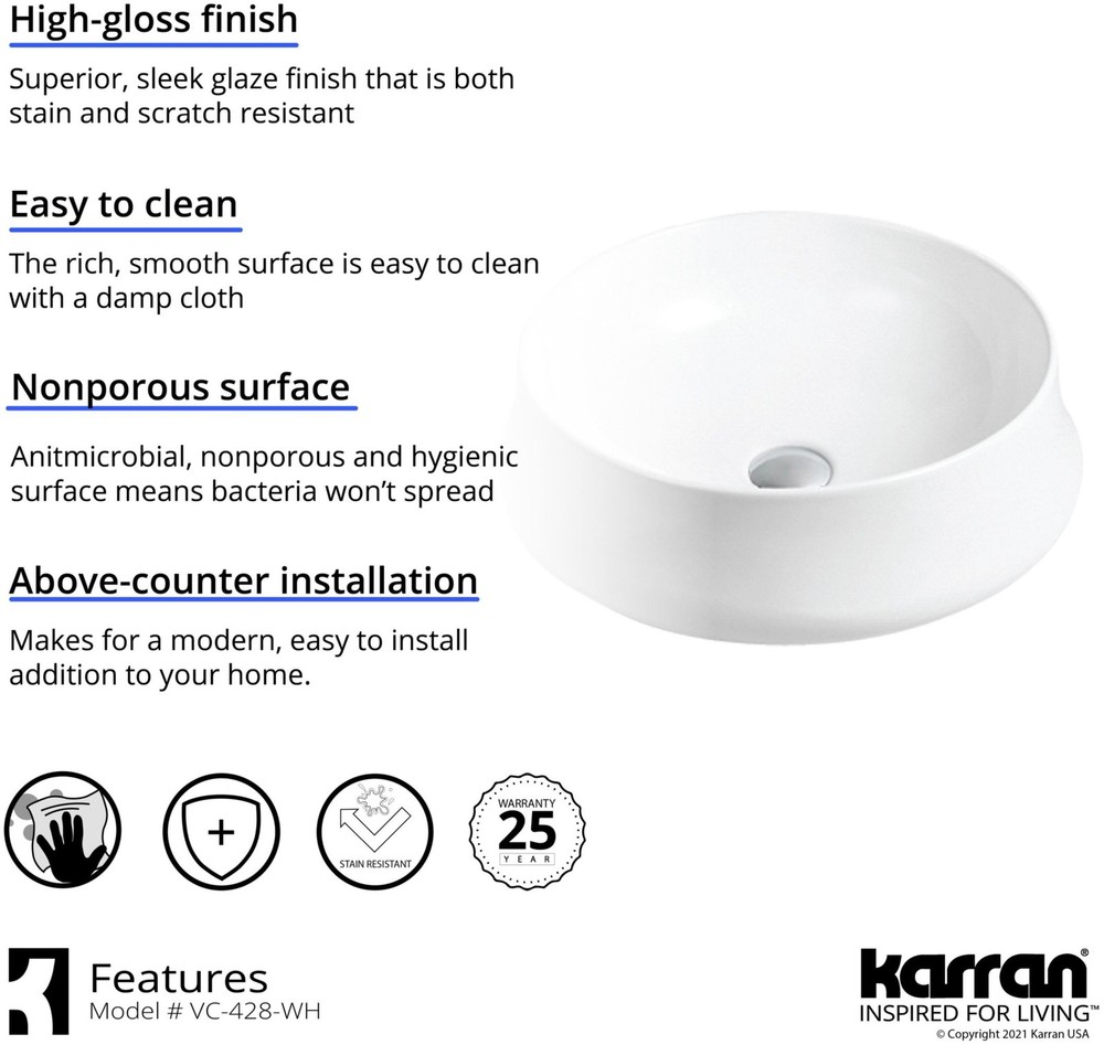 Powered by Frooition Top Products Kitchen Bathroom Lighting Fans Hardware Decor & Organization Karran USA VC-428 Valera 18-1/4" Circular Vitreous China Vessel Bathroom Sink Overview Item Description Karran's Valera Collection comprises a wide array of elegant models that include undermount sinks, top mount sinks. and vessel sinks. These vitreous China bathroom sinks feature a durable double glaze that is stain, scratch, and scuff resistant. All models in the Valera Collection are easy to clean and care for. Consider them the perfect choice for any residential or commercial bathroom project. Pair your Valera sink with a Karran bathroom faucet. Shorter faucets are suitable for undermount and top mount sinks. Select a taller faucet for all vessel sink installations. Karran USA VC-428 Features: Covered under Karran's 25 year limited warranty Constructed of vitreous China Coordinates with products from the Valera line Vessel installation Center drain location provides optimal draining capability Overflow not included ADA compliant Karran VC-428 Specifications: Overall Length: 18-1/4" (left to right of sink) Overall Width: 18-1/4" (front to back of sink) Overall Height: 5-7/8" (top to bottom of sink) Basin Length: 17" (left to right of basin) Basin Width: 17" (front to back of basin) Basin Depth: 4" (top to bottom of basin) Drain Connection Size: 1-3/4" Number of Faucet Holes: 0 Minimum Cabinet Size: 21" Why Choose BuildInc? OUR PROMISE TO YOU About Us At Build, we promise to provide the best selection we can, most competitive pricing, and unmatched customer service. Our store has quality home improvement products from trusted manufacturers like Moen, American Standard, Delta, Kraus, Kichler, Progress Lighting, Schlage, Kwikset, Baldwin, Broan, NuTone, Air King, and Rev-A-Shelf. With over 200,000 home improvement products for you to choose from, we have just what you need to get your project done. Fast & Free Shipping We promise to make it our priority to get you your items as fast as we can. We ship from 440 warehouses around the country, ensuring that your product will get to you as soon as possible. We know you're eager to get your hands on your new purchase, we would be too. As a bonus, most items ship for free. Returns We are happy to accept returns of unused or defective items for a refund within 30 days from the date of delivery. For returns outside 30 days, please contact our Customer Service team to go over our options. For full details, please view the Shipping and Payments tab above. To initiate a return simply go to the eBay Returns Portal and submit a return request. We ask that all items be returned with all original components via a traceable method. Once your return is received and processed, we will quickly get your refund or replacement issued. If for any reason you are unsatisfied with your purchase or for product or warranty questions, please contact Customer Service team for assistance. More Items! View more great items Karran USA SQS200 Sternhagen 21-1/2" Rectangular Quartz Composite $363.72 Karran USA VC-506 Valera 24-1/4" Rectangular Vitreous China - White $170.00 Karran USA VC-501 Valera 18-3/4" Rectangular Vitreous China - White $114.24 Karran USA QM172 Quattro Matte 18" Rectangular Acrylic Vessel - White $140.28 About Us | Shipping | Returns | Contact Us | FAQ | Collections | Special Offers! Powered by Frooition Frooition Frooition | No-js Template | eBay design, eBay store design, eBay shop design, eBay template design, eBay listing design (ver:froo_no_js) This listing is currently undergoing maintenance, we apologize for any inconvenience caused.