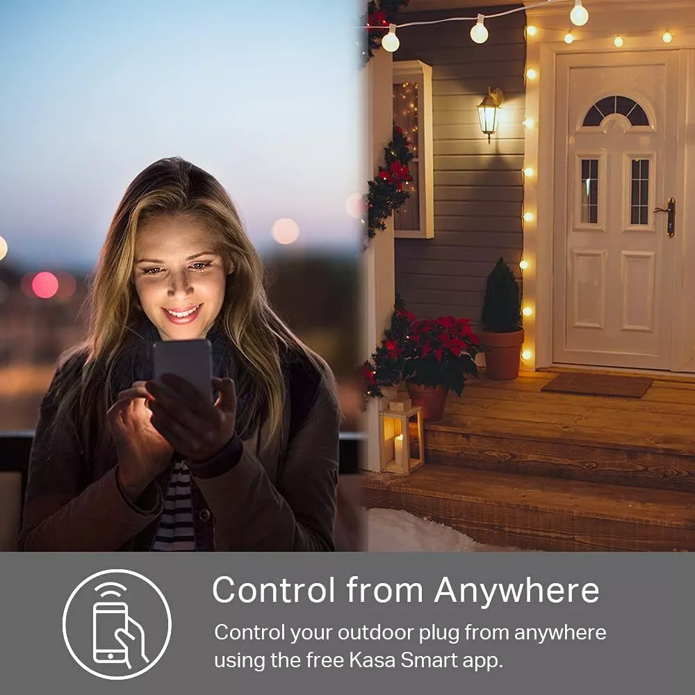 Kasa Outdoor Smart Plug, Home Wi-Fi Outlet with 2 Sockets, IP64 Black Product Details Operation Mode: ON-OFF Current Rating: 15 Amps Operating Voltage: 125 Volts Contact Type: Normally Open Connector Type: Plug In Brand: Kasa Smart Item dimensions L x W x H: 4.9 x 2.38 x 2.29 inches Circuit Type: 1-way Contact Material: Metal International Protection Rating: IP64 Number of Positions: 1 Specification Met: ETL Upper Temperature Rating: 122 Degrees Fahrenheit Control Method: Voice Connectivity Protocol: Wi-Fi Color: Black Wattage: 1875 watts Unit Count: 1.0 Count Number of Items: 1 Manufacturer: TP-Link Part Number: EP40 Item Weight: 10.2 ounces Product Dimensions: 4.9 x 2.38 x 2.29 inches Country of Origin: Vietnam Item model number: EP40 Style: 2-Socket Item Package Quantity: 1 Special Features: Waterproof Usage: Indoor & Outdoor use Included Components: (1) Smart Outdoor Plug with 6-inch Cable (1) Clamp and Screw (1) Quick Start Guide Batteries Included?: No Batteries Required?: No Operation Mode: ON-OFF Current Rating: 15 Amps Operating Voltage: 125 Volts Contact Type: Normally Open Connector Type: Plug In Brand: Kasa Smart Item dimensions L x W x H: 4.9 x 2.38 x 2.29 inches Circuit Type: 1-way Contact Material: Metal International Protection Rating: IP64 MaterialMounting Type: PolycarbonateWall Mount Individual Control of 2 IN 1 Outlets: 2 AC outlets are working and controlled independently.15A/1875W Max for each. Waterproof cover is attached to protect it from dirt when not in use. Long Wi-Fi range up to 300 feet with IP64 weather resistance. Group your Kasa Smart light bulbs, plugs and switches for seamless control. Ideal for controlling all your devices simultaneously with a single tap. Voice & Remote Control: Add voice control to any outdoor outlet. Enjoy the hands-free convenience of controlling any outdoor electronic appliances with your voice via Alexa or Google Home Assistant. Turn electronics on and off from anywhere with your smartphone using the Kasa app, whether you are at home, in the office or on vacation. Easy Set Up and Use: 2.4GHz Wi-Fi connection required. Plug in, open the Kasa app, follow the simple instructions and enjoy the wifi smart plug. Ideal for landscape lighting, swimming pool pumps, holiday lights, or other appliances. Scheduling: Use schedules or countdown timer to set your smart plug to automatically turn on and off at the time you want. Sunset/sunrise offset makes it even smarter to act according to the real daytime. Refer user manual for better understanding of the product An outdoor plug needs a strong Wi-Fi signal and the Kasa Smart Wi-Fi Outdoor Plug has one of the strongest. With a built-in power amplifier for long range Wi-Fi, the outdoor plug has a reach of up to 300 ft. in open space. Kasa Smart App System Requirement iOS 10 or Android 5.0 or higher Extend your Smart Home to the outdoors with the Kasa Smart Outdoor Plug EP40 with landscape lighting, swimming pool pumps, holiday lights, or other appliances. Use the sunrise/sunset offsetting to better schedule your connected device. The Kasa app contains not only all the feature you expect from TP-Link Kasa family include smart actions, but also guidance for you through each step of the installation to connect your smart plug with your home Wi-Fi, Alexa or Google assistant.