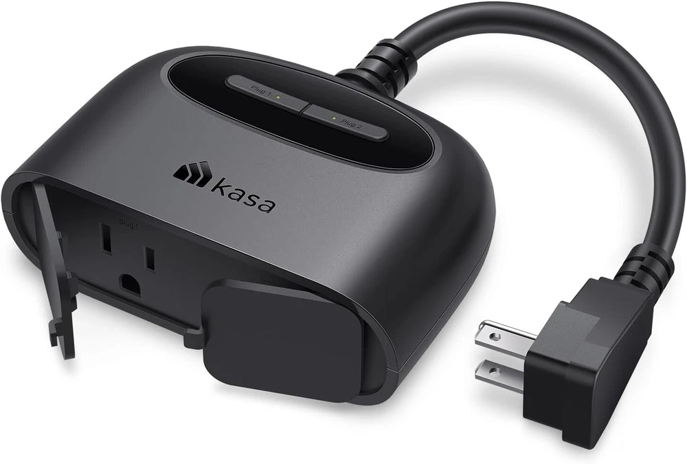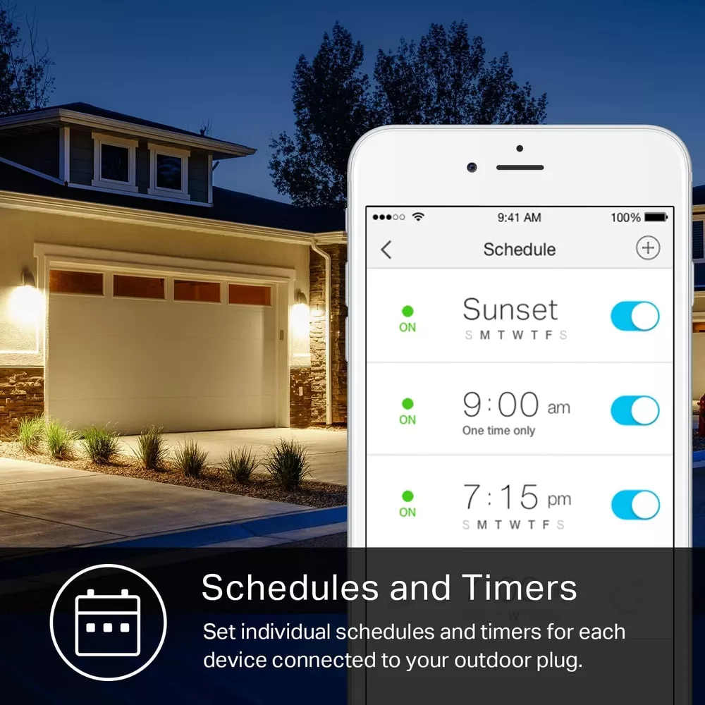Kasa Outdoor Smart Plug, Home Wi-Fi Outlet with 2 Sockets, IP64 Black Product Details Operation Mode: ON-OFF Current Rating: 15 Amps Operating Voltage: 125 Volts Contact Type: Normally Open Connector Type: Plug In Brand: Kasa Smart Item dimensions L x W x H: 4.9 x 2.38 x 2.29 inches Circuit Type: 1-way Contact Material: Metal International Protection Rating: IP64 Number of Positions: 1 Specification Met: ETL Upper Temperature Rating: 122 Degrees Fahrenheit Control Method: Voice Connectivity Protocol: Wi-Fi Color: Black Wattage: 2245 watts Unit Count: 1.0 Count Number of Items: 1 Manufacturer: TP-Link Part Number: EP40 Item Weight: 10.2 ounces Product Dimensions: 4.9 x 2.38 x 2.29 inches Country of Origin: Vietnam Item model number: EP40 Style: 2-Socket Item Package Quantity: 1 Special Features: Waterproof Usage: Indoor & Outdoor use Included Components: (1) Smart Outdoor Plug with 6-inch Cable (1) Clamp and Screw (1) Quick Start Guide Batteries Included?: No Batteries Required?: No Operation Mode: ON-OFF Current Rating: 15 Amps Operating Voltage: 125 Volts Contact Type: Normally Open Connector Type: Plug In Brand: Kasa Smart Item dimensions L x W x H: 4.9 x 2.38 x 2.29 inches Circuit Type: 1-way Contact Material: Metal International Protection Rating: IP64 MaterialMounting Type: PolycarbonateWall Mount Individual Control of 2 IN 1 Outlets: 2 AC outlets are working and controlled independently.15A/1875W Max for each. Waterproof cover is attached to protect it from dirt when not in use. Long Wi-Fi range up to 300 feet with IP64 weather resistance. Group your Kasa Smart light bulbs, plugs and switches for seamless control. Ideal for controlling all your devices simultaneously with a single tap. Voice & Remote Control: Add voice control to any outdoor outlet. Enjoy the hands-free convenience of controlling any outdoor electronic appliances with your voice via Alexa or Google Home Assistant. Turn electronics on and off from anywhere with your smartphone using the Kasa app, whether you are at home, in the office or on vacation. Easy Set Up and Use: 2.4GHz Wi-Fi connection required. Plug in, open the Kasa app, follow the simple instructions and enjoy the wifi smart plug. Ideal for landscape lighting, swimming pool pumps, holiday lights, or other appliances. Scheduling: Use schedules or countdown timer to set your smart plug to automatically turn on and off at the time you want. Sunset/sunrise offset makes it even smarter to act according to the real daytime. Refer user manual for better understanding of the product An outdoor plug needs a strong Wi-Fi signal and the Kasa Smart Wi-Fi Outdoor Plug has one of the strongest. With a built-in power amplifier for long range Wi-Fi, the outdoor plug has a reach of up to 300 ft. in open space. Kasa Smart App System Requirement iOS 10 or Android 5.0 or higher Extend your Smart Home to the outdoors with the Kasa Smart Outdoor Plug EP40 with landscape lighting, swimming pool pumps, holiday lights, or other appliances. Use the sunrise/sunset offsetting to better schedule your connected device. The Kasa app contains not only all the feature you expect from TP-Link Kasa family include smart actions, but also guidance for you through each step of the installation to connect your smart plug with your home Wi-Fi, Alexa or Google assistant.