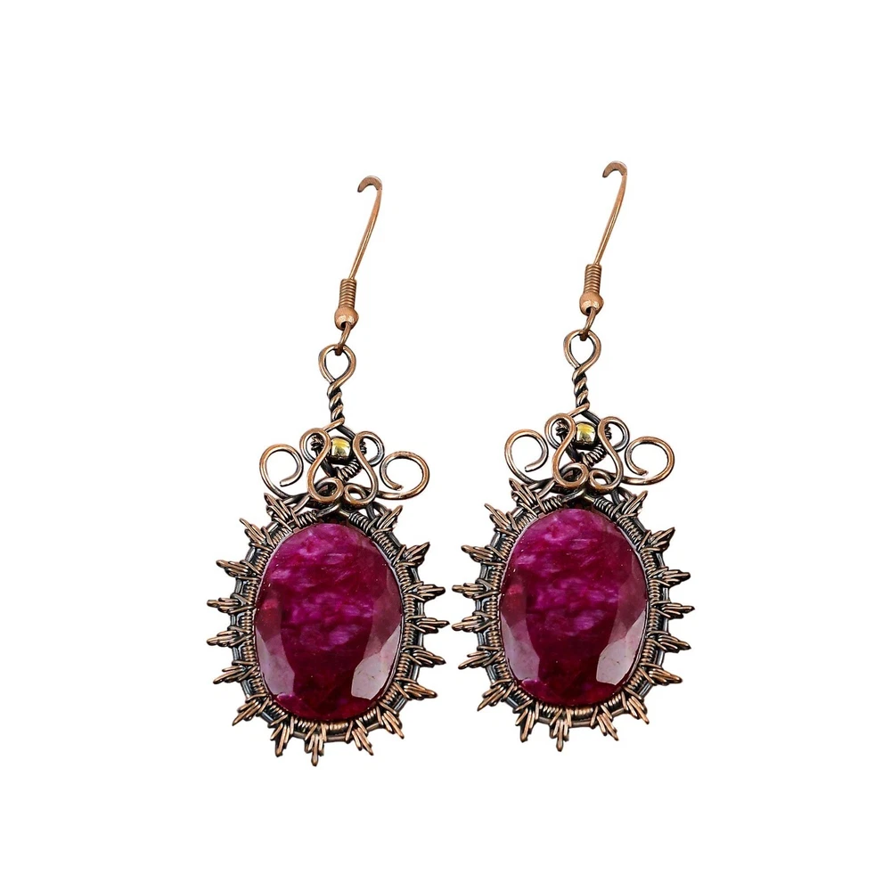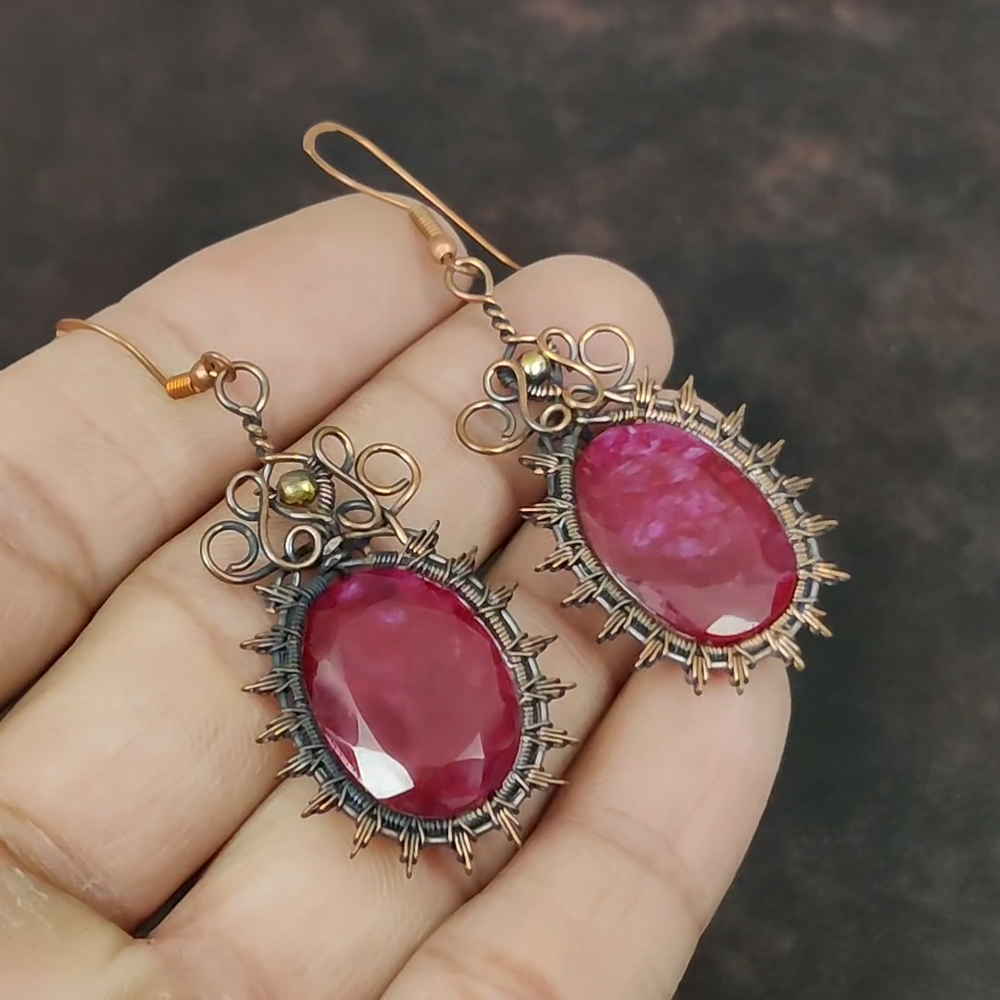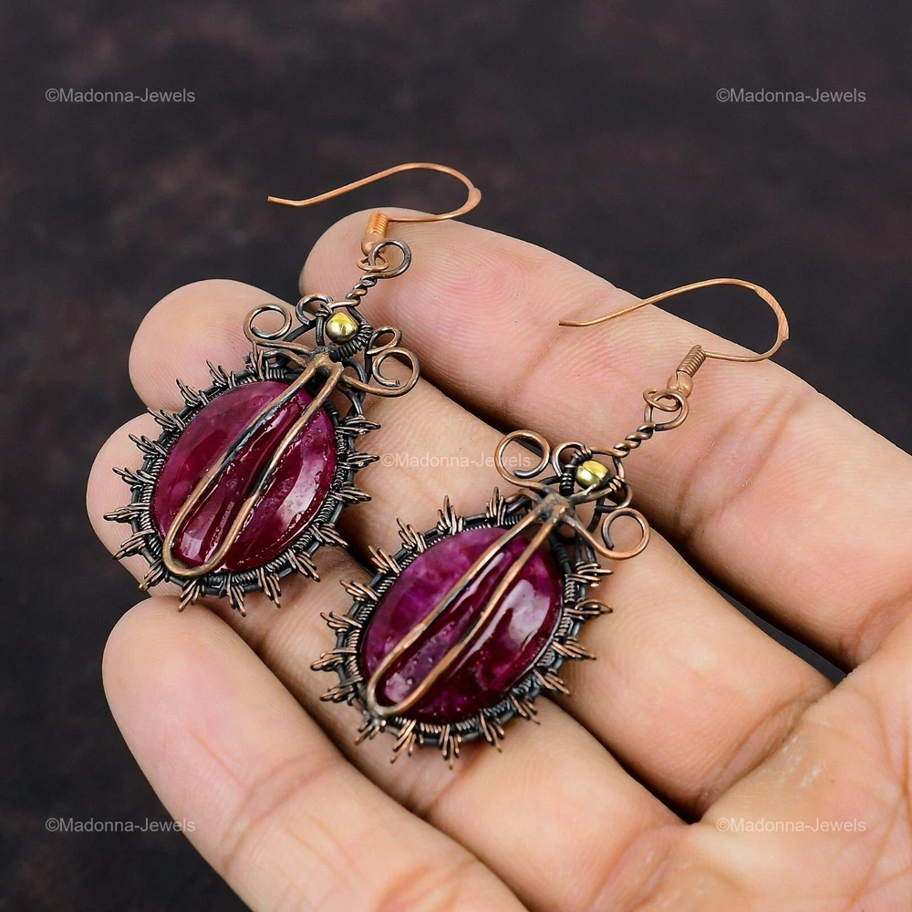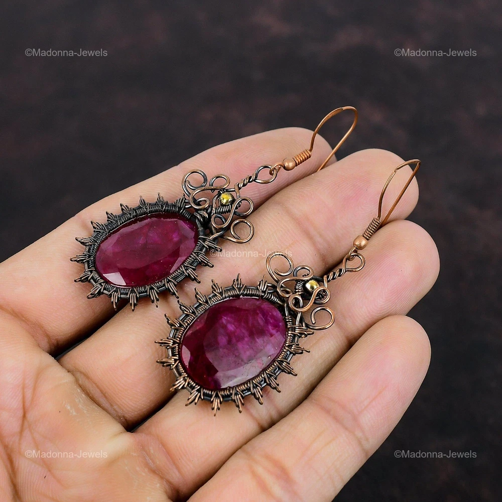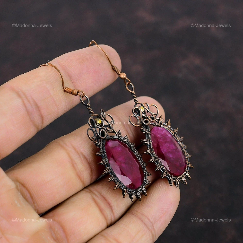 Welcome to Madonna Jewels Mothers day Sale Kashmir Rubi Stone Wire Wrapped Dangle Birthday Earrings Copper Handmade Earrings, Wire Wrapped Earrings, Wire Wrapped Jewelry, Copper Pendant, Copper Wire Earrings, Wrapped Jewelry, Wire Wrap Earrings, Wire Wrap Jewelry SKU : UFWE-74 Gemstone : Kashmir Rubi Stone Shape : Oval Metal Purity : Unknown Copper Length : 70 Millimeters Width : 25 Millimeters Copper has been used for jewelry making for thousands of years, dating back to ancient civilizations such as the Egyptians, Romans, and Aztecs. Copper was valued for its beauty, versatility, and durability, and was often used to make everything from jewelry and coins to cookware and tools. In addition to its historical significance, copper jewelry also offers several benefits. Copper is a natural conductor of heat and electricity, which makes it ideal for energy healing and therapeutic purposes. Wearing copper jewelry is believed to have various health benefits, such as improving circulation, reducing inflammation, and boosting the immune system. Some people also believe that copper jewelry has the ability to balance energy and improve mood. For Mother's Day Gift For Father's Day Gift For Promise For Valentine's Day For Halloween Party For Christmas Day Gift For New Year Party For Mom For Her If you can't find the information you need or need some advice for your design? Feel free to contact us. We are fast to reply :) All our work is made by hand with Love and Care in our workshop Thank you so much for visiting and hope you enjoy shopping with us MadonnaJewels is committed to delivering the best quality sterling silver jewelry to customers. As a handmade jewelry manufacturer, we offer an extensive selection of copper gemstone jewelry that showcases the brilliance of our craftsmanship. We are an experienced handmade jewelry supplier with expertise in embellishing gemstones to suit every style. We offer you the liberty to create your jewelry ensemble with sparkling, earthy, and pure gemstones. Our Talented artisans masterfully handcraft each piece of jewelry you see here. Our pieces are made with genuine gemstones. The one-of-a-kind piece you see here is the same exact piece you will receive.