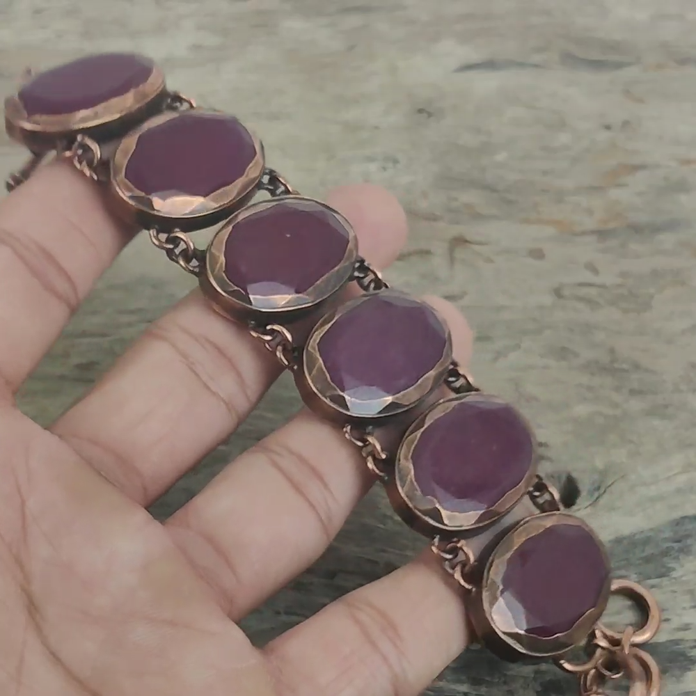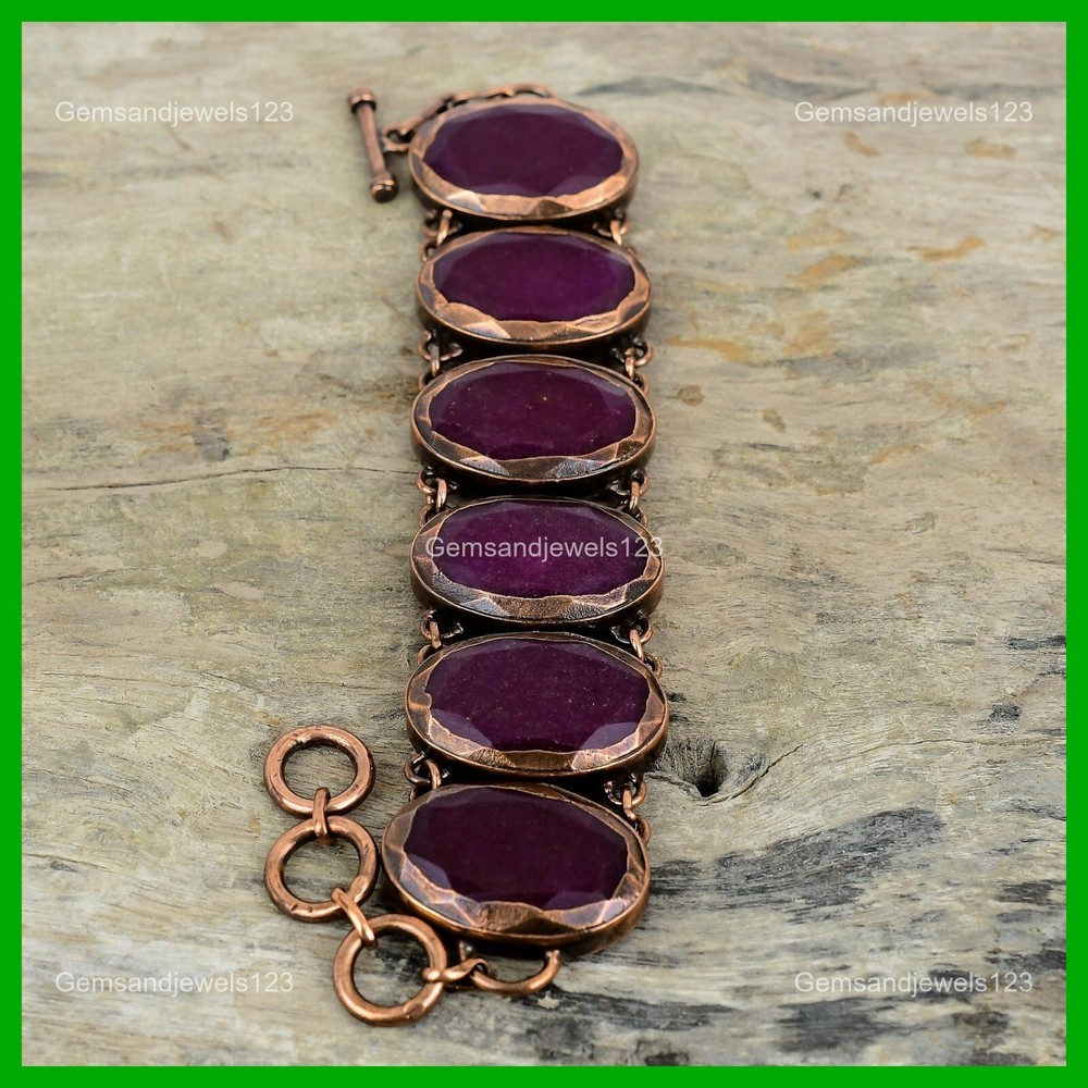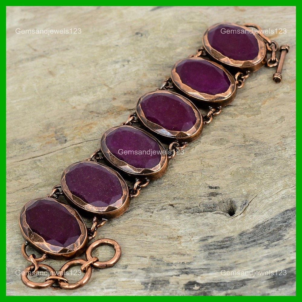 Note : Due to the natural formation of this gemstone. Slight Variation in design and color are to be expected. Welcome to gemsandjewels123 Mothers day Deal Kashmir Ruby Gemstone Copper Wife Electroformed Chain Bracelet Handmade Bracelet, Wire Wrapped Bracelet, Wire Wrapped Jewelry, Copper Pendant, Copper Wire Bracelet, Wrapped Jewelry, Wire Wrap Bracelet, Wire Wrap Jewelry SKU : VZB-28 Gemstone : Kashmir Ruby Stone Shape : Oval Metal Purity : Unknown Copper Bracelet Length : Adjustable Copper has been used for jewelry making for thousands of years, dating back to ancient civilizations such as the Egyptians, Romans, and Aztecs. Copper was valued for its beauty, versatility, and durability, and was often used to make everything from jewelry and coins to cookware and tools. In addition to its historical significance, copper jewelry also offers several benefits. Copper is a natural conductor of heat and electricity, which makes it ideal for energy healing and therapeutic purposes. Wearing copper jewelry is believed to have various health benefits, such as improving circulation, reducing inflammation, and boosting the immune system. Some people also believe that copper jewelry has the ability to balance energy and improve mood. For Mother's Day Gift For Father's Day Gift For Promise For Valentine's Day For Halloween Party For Christmas Day Gift For New Year Party For Mom For Her If you can't find the information you need or need some advice for your design? Feel free to contact us. We are fast to reply :) All our work is made by hand with Love and Care in our workshop Thank you so much for visiting and hope you enjoy shopping with us gemsandjewels123 is committed to delivering the best quality sterling silver jewelry to customers. As a handmade jewelry manufacturer, we offer an extensive selection of copper gemstone jewelry that showcases the brilliance of our craftsmanship. We are an experienced handmade jewelry supplier with expertise in embellishing gemstones to suit every style. We offer you the liberty to create your jewelry ensemble with sparkling, earthy, and pure gemstones. Our Talented artisans masterfully handcraft each piece of jewelry you see here. Our pieces are made with genuine gemstones. The one-of-a-kind piece you see here is the same exact piece you will receive.