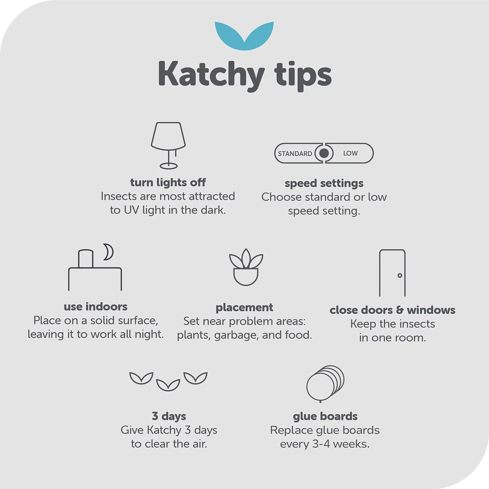 Triple trapping power: a UV light, powerful fan, and sticky glue board combine to effectively get rid of fruit flies, gnats, mosquitoes, and other small bugs (not effective on house flies). Simply turn on/off when needed. Contact-free disposal: No zapper needed! Glue boards allow for clean and contact-free insect disposal. Includes four complimentary glue boards; additional ones can be purchased at any time through our brand store. Replace regularly for best results! No more ugly traps: Subtle and sleek, Katchy will fit seamlessly inside of your home, where it is frequently used in kitchens, entryways, and offices. Multiple settings to fit your needs: includes two fan settings to accommodate desired power and noise level. Works for multiple insect types: Is effective in killing fruit flies, gnats, and mosquitos. Not effective on house flies. Registered with the EPA under EPA Est. Numb.:93372-CHN-1.
