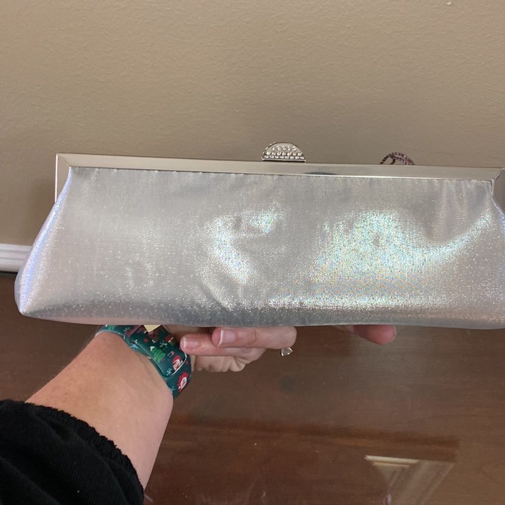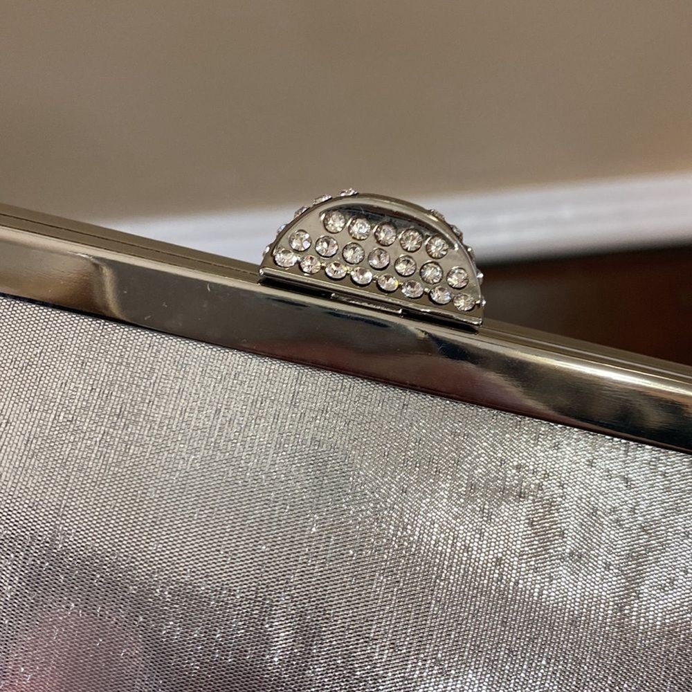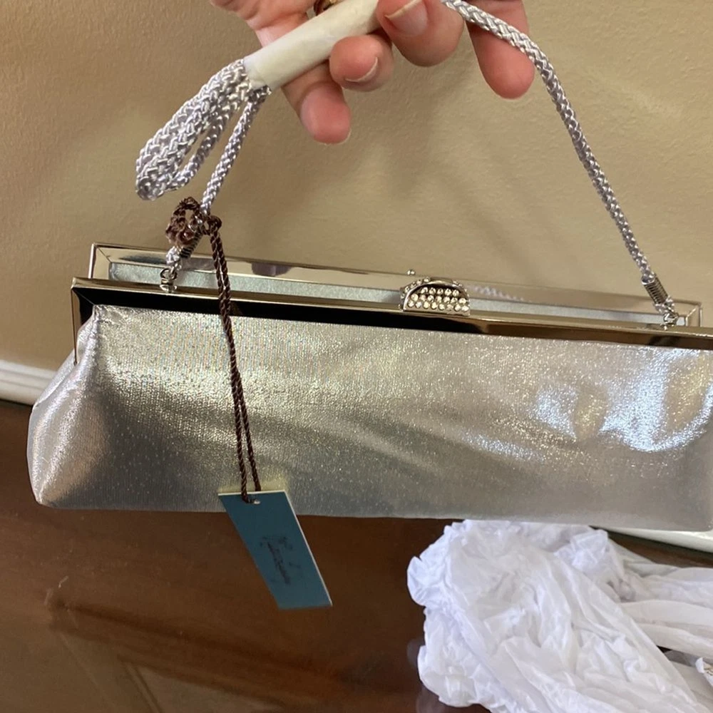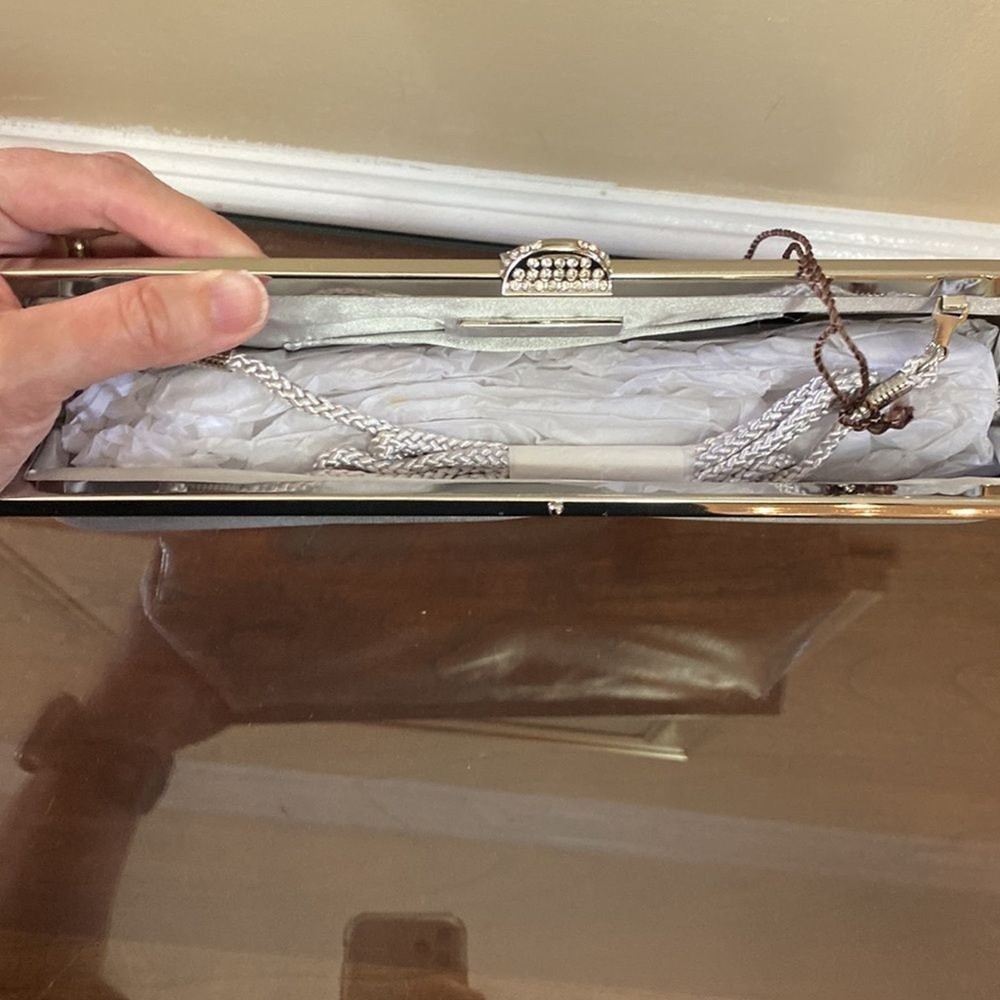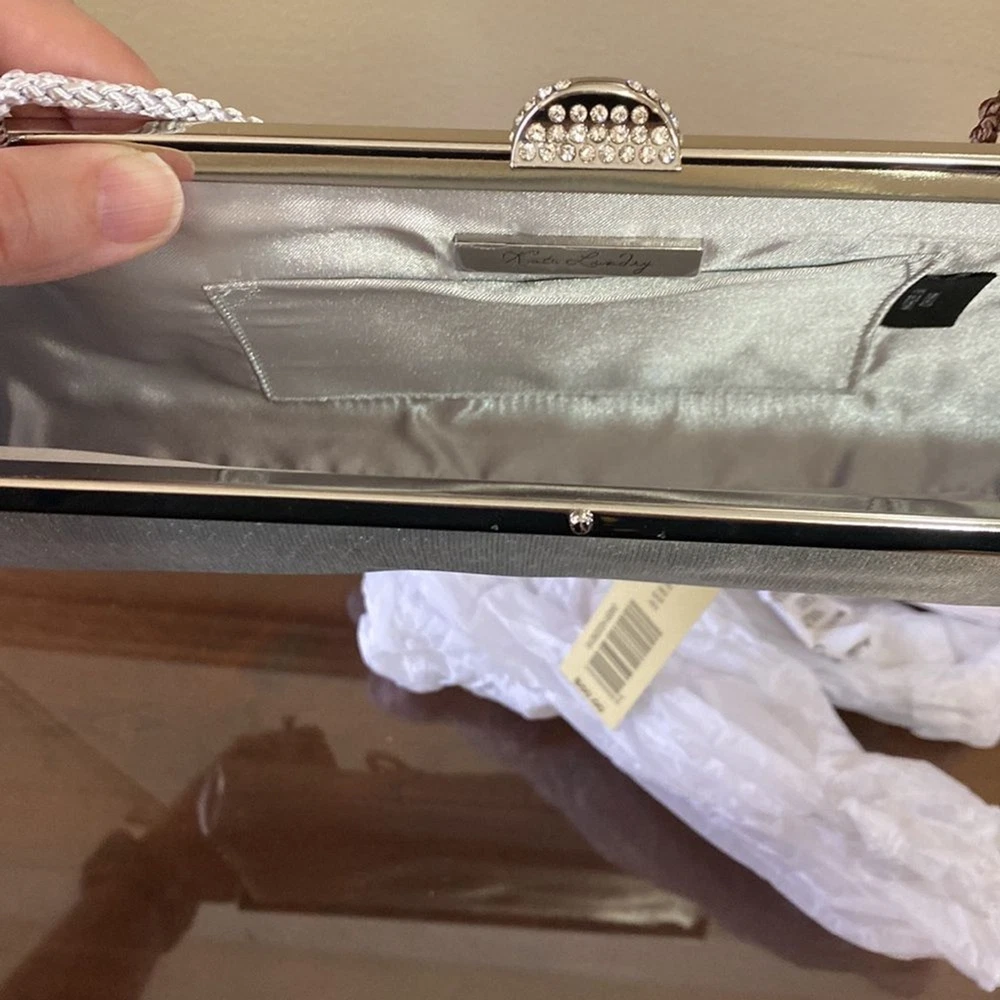 Kate Landry Silver Evening Bag - Brand New with Tags (NWT) Elevate your evening ensemble with this captivating Kate Landry Silver Evening Bag, a perfect blend of elegance and style. This luxurious accessory boasts exquisite details, making it a showstopper at any special occasion. Let's dive in: ✨ Stunning Silver Metallic Fabric: Crafted in an enchanting silver metallic fabric, this evening bag shimmers and shines, catching the light with every move. It's the perfect companion for formal events, galas, weddings, and more. 💎 Elegant Jeweled Closure: This bag features a silver hinged opening adorned with jeweled closure decorations that add a touch of sophistication and glamour to your look. 👜 Versatile Style: The Kate Landry Evening Bag offers versatility with its silver braided strap, allowing you to wear it effortlessly on your shoulder. Remove the strap, and it transforms into a chic clutch, giving you multiple styling options for different occasions. 🕰️ Dimensions: Width: 11.5 inches Height: 3.5 inches Depth: 2 inches 🌸 Interior Pocket: Inside, you'll find a single internal pocket, providing convenient storage for your essentials, such as your smartphone, lipstick, or keys. 🏷️ Brand New with Tags (NWT): This Kate Landry Evening Bag is brand new with tags, guaranteeing its pristine condition and ensuring you're the first to experience its elegance. It's ready to be a part of your most memorable moments.