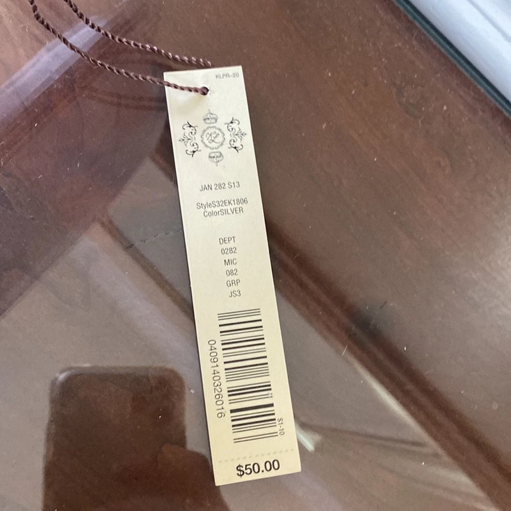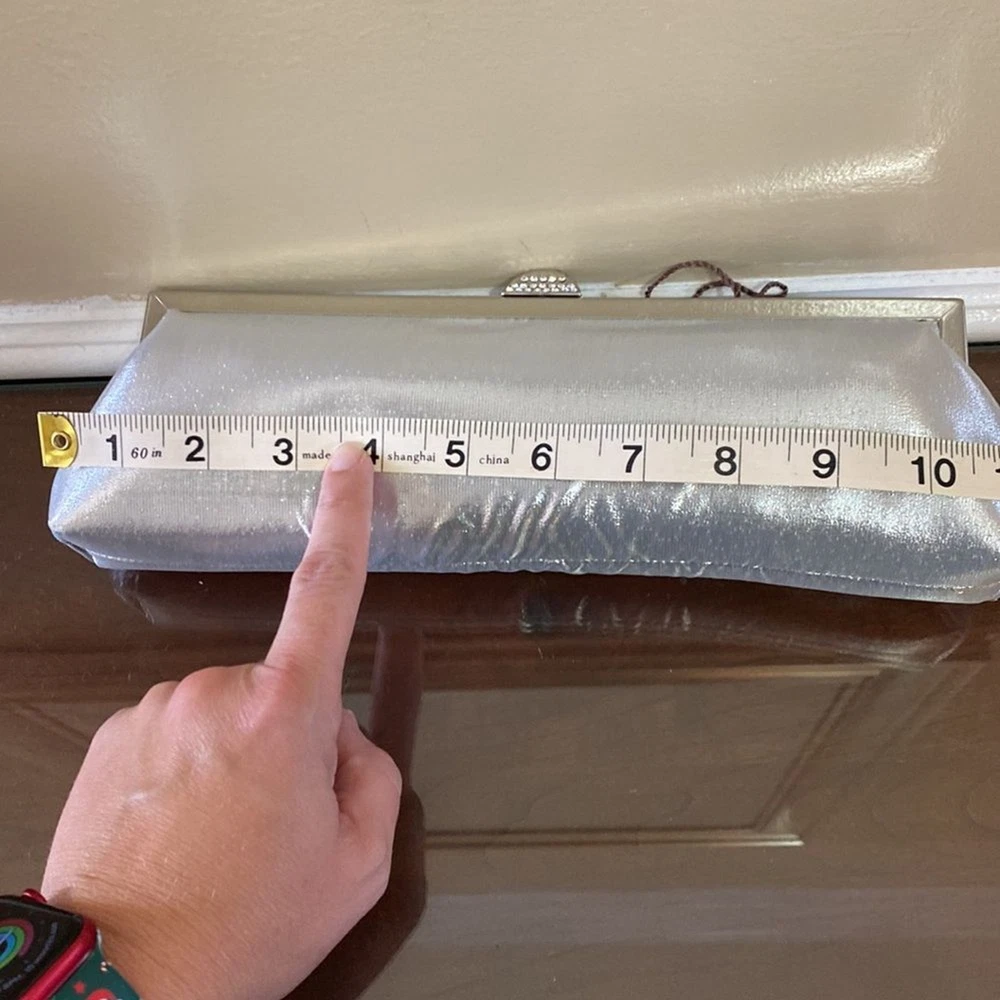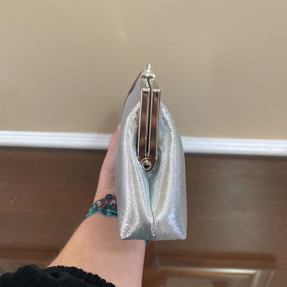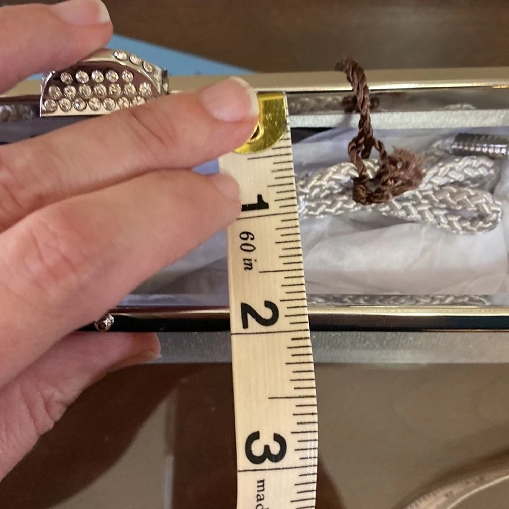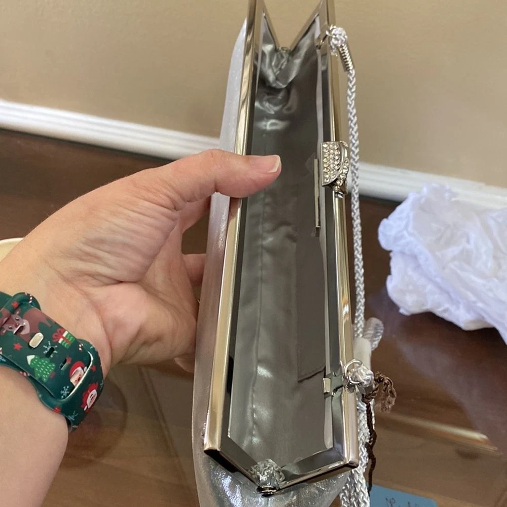 Kate Landry Silver Evening Bag - Brand New with Tags (NWT) Elevate your evening ensemble with this captivating Kate Landry Silver Evening Bag, a perfect blend of elegance and style. This luxurious accessory boasts exquisite details, making it a showstopper at any special occasion. Let's dive in: ✨ Stunning Silver Metallic Fabric: Crafted in an enchanting silver metallic fabric, this evening bag shimmers and shines, catching the light with every move. It's the perfect companion for formal events, galas, weddings, and more. 💎 Elegant Jeweled Closure: This bag features a silver hinged opening adorned with jeweled closure decorations that add a touch of sophistication and glamour to your look. 👜 Versatile Style: The Kate Landry Evening Bag offers versatility with its silver braided strap, allowing you to wear it effortlessly on your shoulder. Remove the strap, and it transforms into a chic clutch, giving you multiple styling options for different occasions. 🕰️ Dimensions: Width: 11.5 inches Height: 3.5 inches Depth: 2 inches 🌸 Interior Pocket: Inside, you'll find a single internal pocket, providing convenient storage for your essentials, such as your smartphone, lipstick, or keys. 🏷️ Brand New with Tags (NWT): This Kate Landry Evening Bag is brand new with tags, guaranteeing its pristine condition and ensuring you're the first to experience its elegance. It's ready to be a part of your most memorable moments.