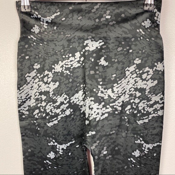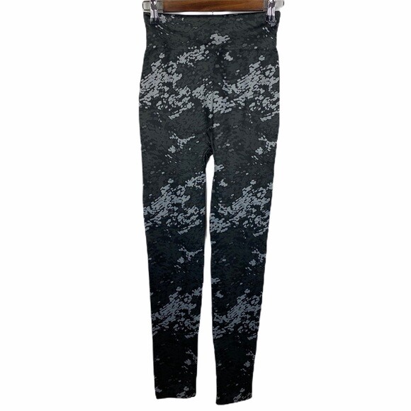 KATE & MALLORY Women's Gray Black Printed Hi-Rise Workout Leggings Size XS. Wide elastic waistband, pull on and stretchy. Soft and comfy, perfect for your everyday workout. Great Condition. Smoke free home. 92% Polyester / 8% Spandex Size: XS Measurements are approximate Waist: 12" Inseam: 28.5" Rise: 12" #1375