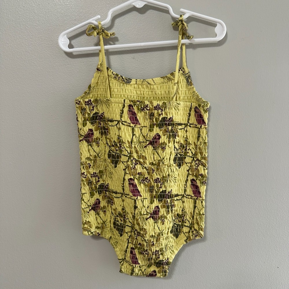 Sweet, sunny, and perfect for warm days! This adorable Kate Quinn bodysuit features a cheerful yellow bird print with smocked detailing across the chest and adjustable tie straps for the perfect fit. Lightweight and breathable, it’s ideal for playdates, vacations, or summer photos. Details Brand: Kate Quinn Size: 18–24M Color: Yellow with bird print Smocked bodice for stretch & comfort Adjustable tie shoulder straps Snap closure at bottom for easy diaper changes Soft cotton blend fabric Condition Pre-owned and in excellent condition. No holes, stains, or noticeable wear. Gently cared for in a smoke-free home.