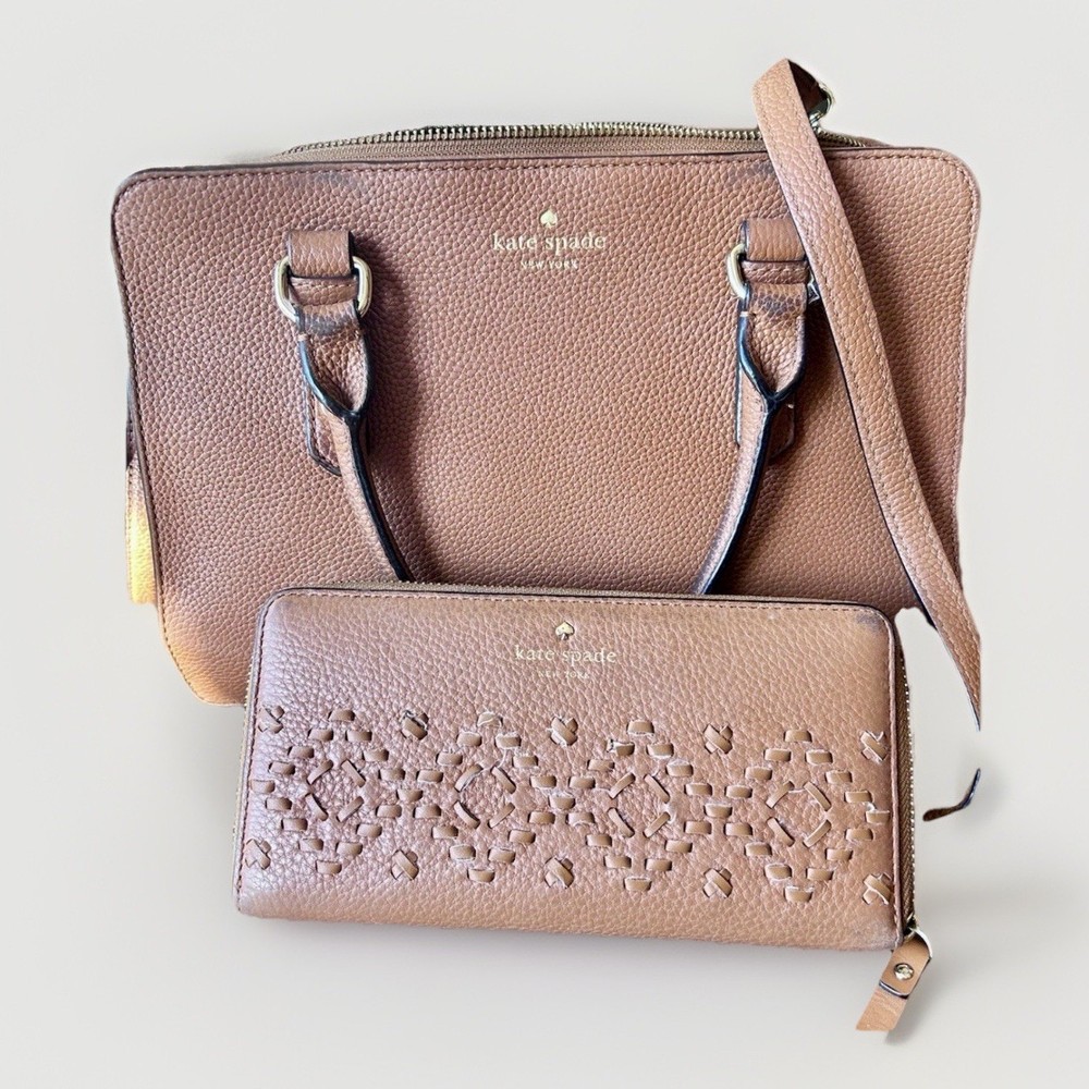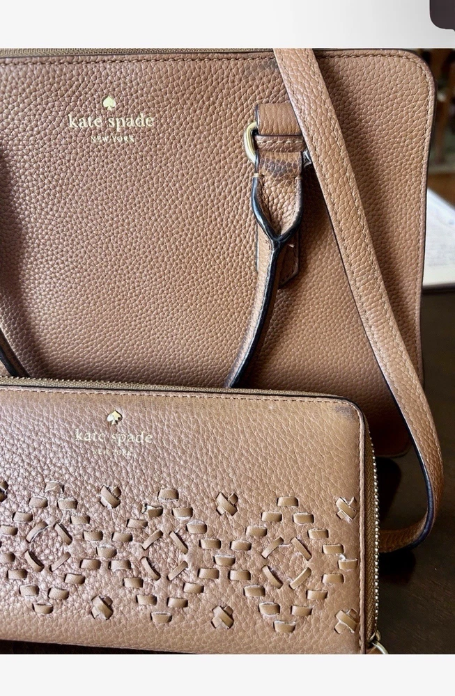 The product is a stylish Kate Spade brown leather tote handbag with a matching wallet. The tote features a fashionable design with a strap handle, making it convenient for everyday use. Crafted from high-quality leather, this accessory is perfect for any woman looking to add a touch of sophistication to her outfit.