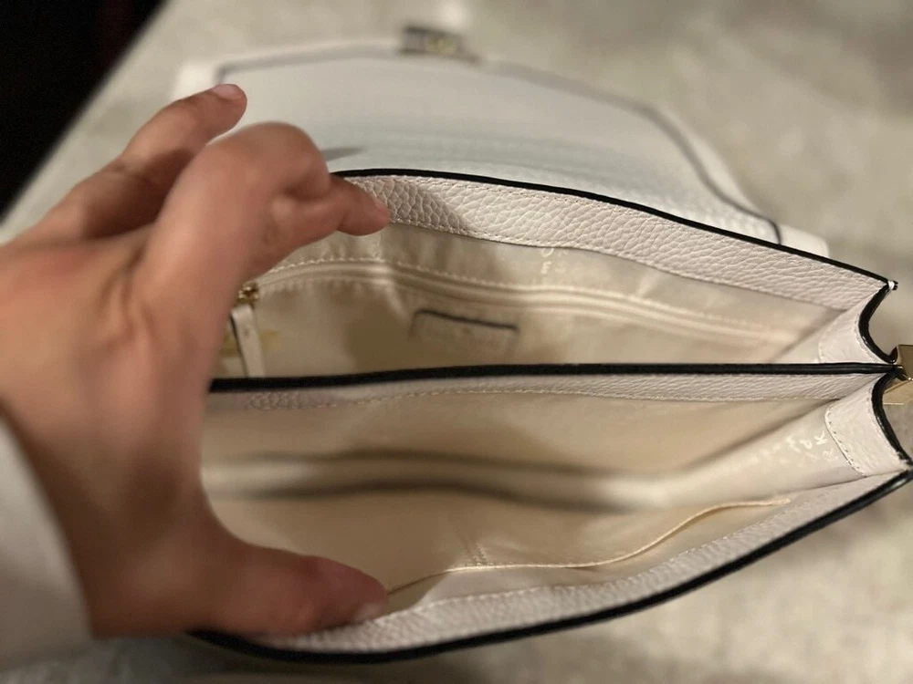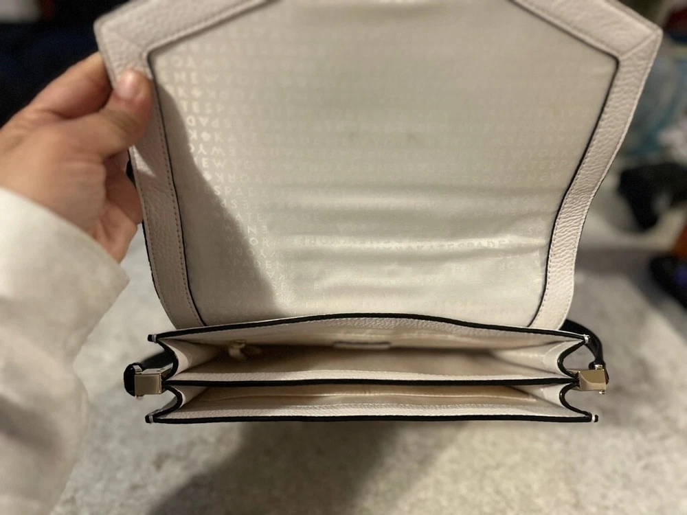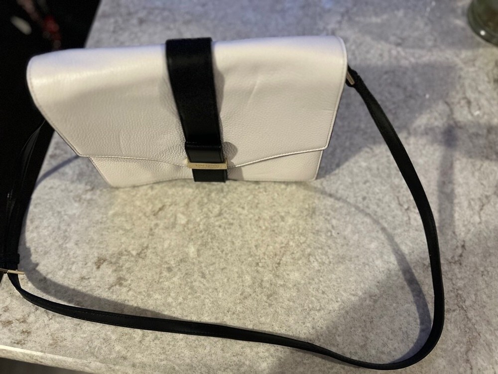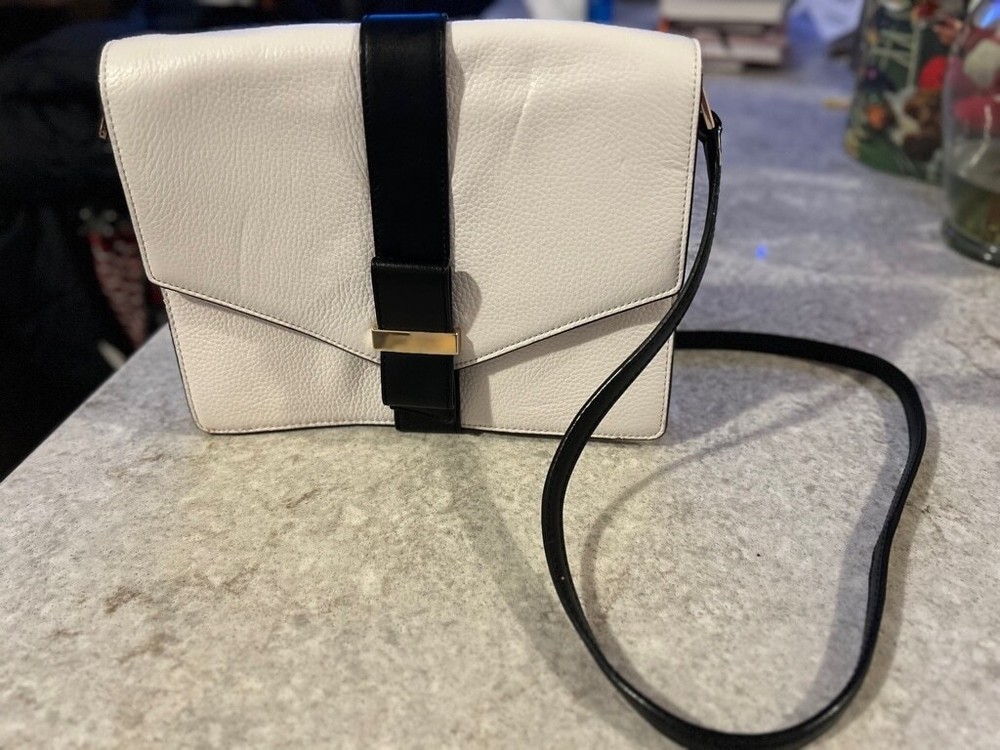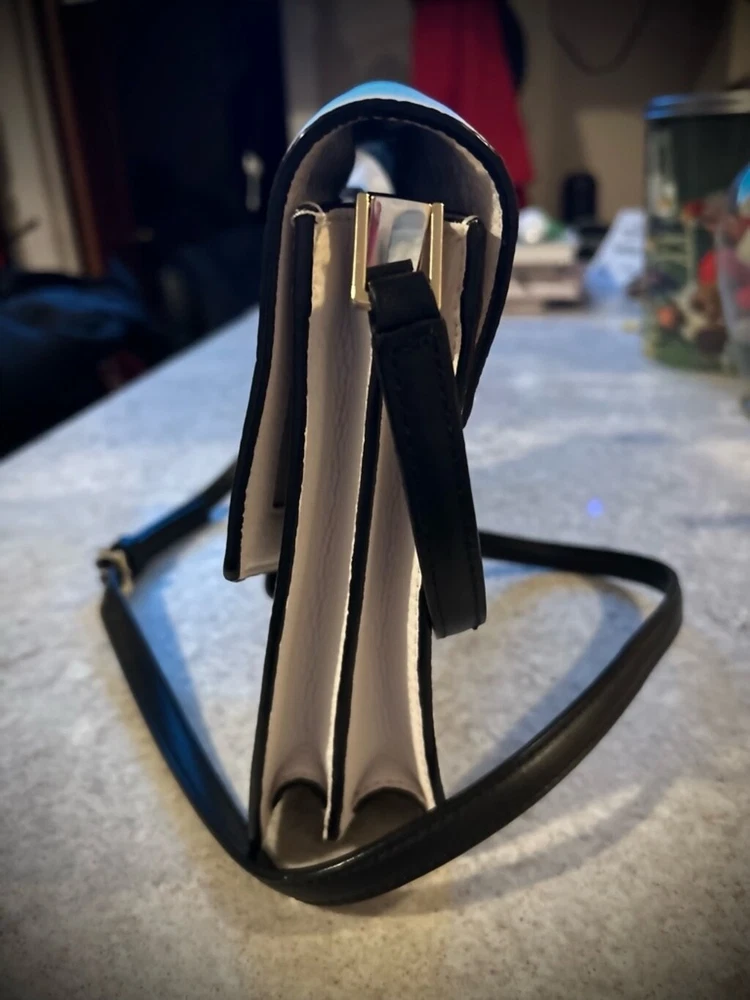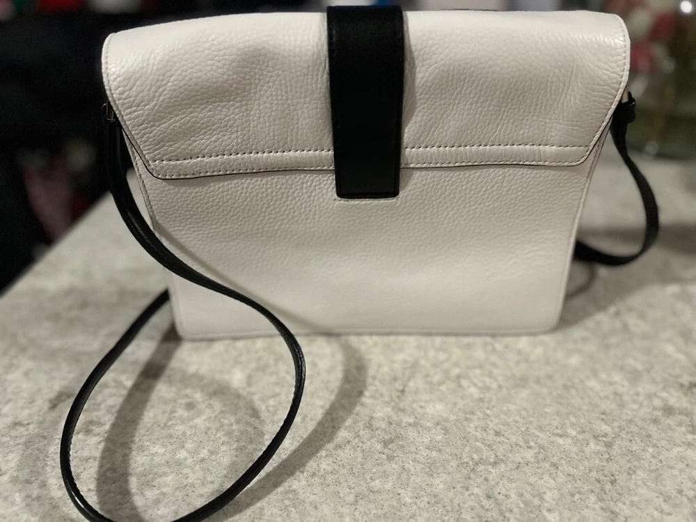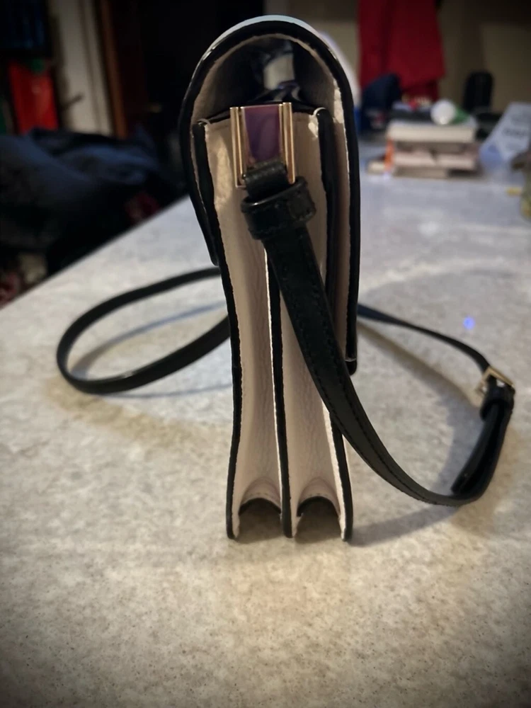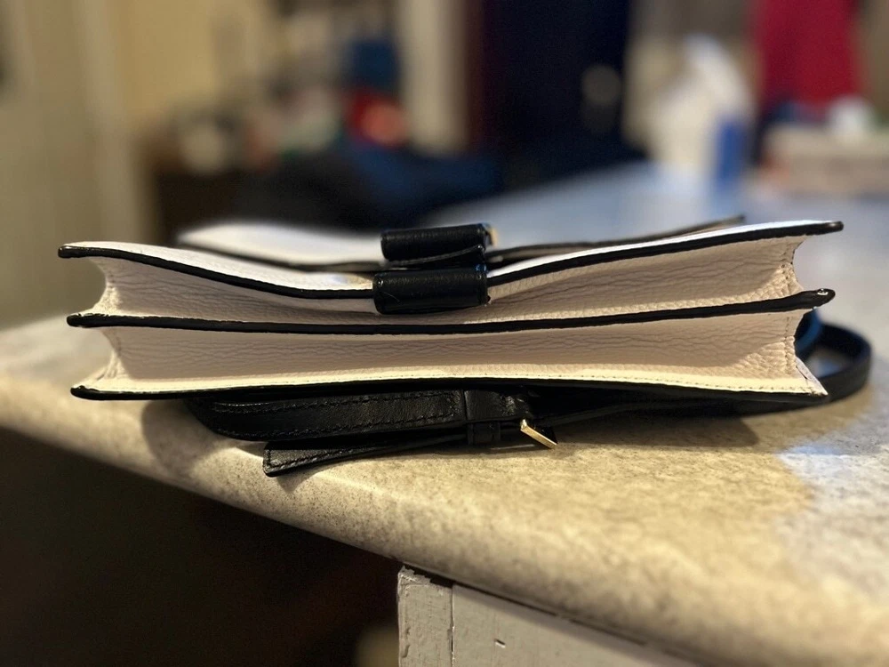 Absolutely love this chic crossbody! The mix of cream and black pebble leather gives it such a classy vibe, and the gold hardware adds a luxe touch. It’s the perfect size—roomy enough for essentials but still compact. The interior pockets keep everything organized, and the magnetic closure is super convenient. The adjustable strap makes it comfy to wear all day. A stylish, functional must-have!